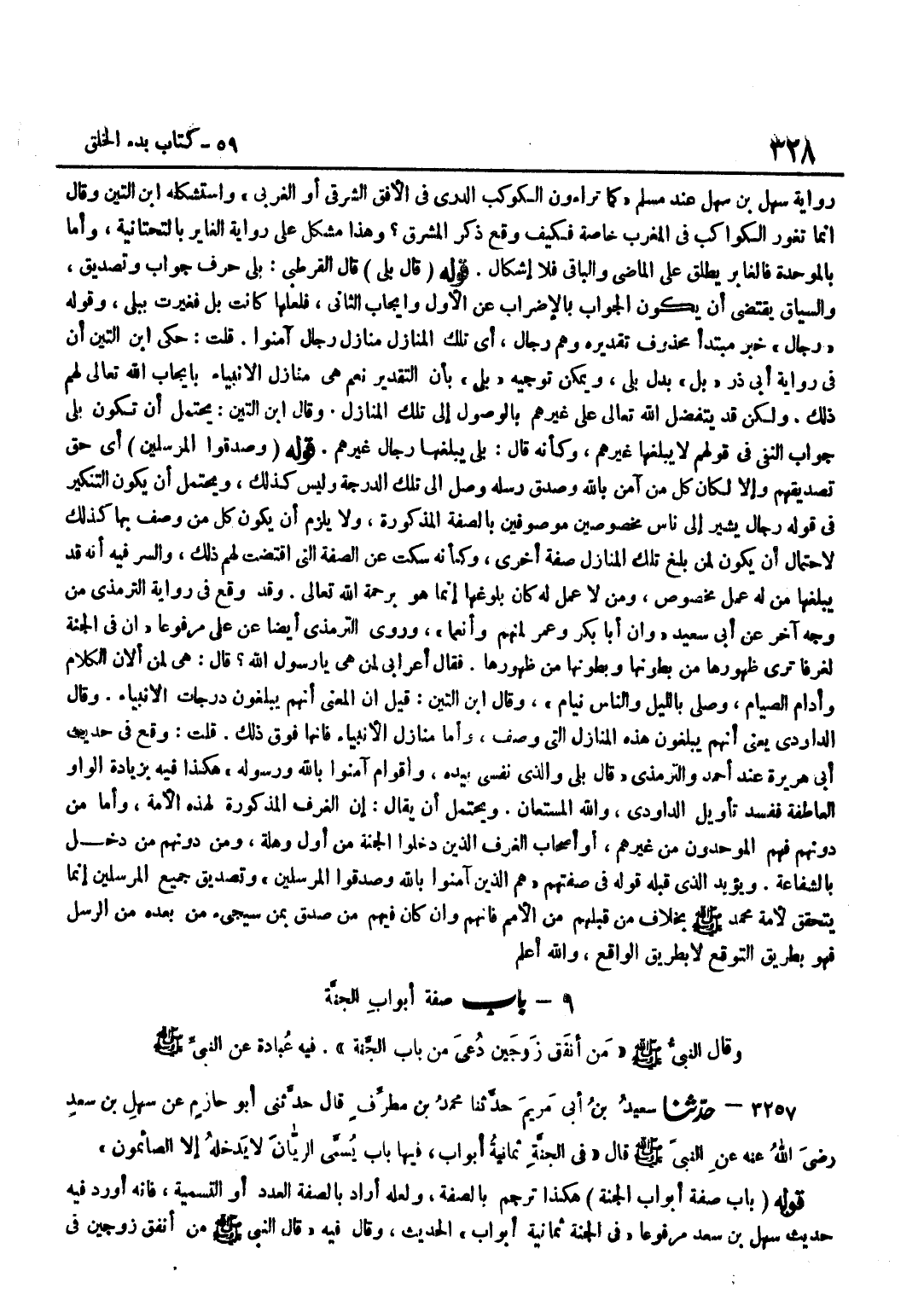 رِوَايَةِ سَهْلِ بْنِ سَهْلٍ عِنْدَ مُسْلِمٍ كَمَا تَرَاءَوْنَ الْكَوْكَبَ الدُّرِّيَّ فِي الْأُفُقِ الشَّرْقِيِّ أَو الغربي وَاسْتَشْكَلَهُ بن التِّينِ وَقَالَ إِنَّمَا تَغُورُ الْكَوَاكِبُ فِي الْمَغْرِبِ خَاصَّةً فَكَيْفَ وَقَعَ ذِكْرُ الْمَشْرِقِ وَهَذَا مُشْكِلٌ عَلَى رِوَايَةِ الْغَايِرِ بِالتَّحْتَانِيَّةِ وَأَمَّا بِالْمُوَحَّدَةِ فَالْغَابِرُ يُطْلَقُ عَلَى الْمَاضِي وَالْبَاقِي فَلَا إِشْكَالَ قَوْلُهُ قَالَ بَلَى قَالَ الْقُرْطُبِيُّ بَلَى حَرْفُ جَوَابٍ وَتَصْدِيقٍ وَالسِّيَاقُ يَقْتَضِي أَنْ يَكُونَ الْجَوَابُ بِالْإِضْرَابِ عَنِ الْأَوَّلِ وَإِيجَابِ الثَّانِي فَلَعَلَّهَا كَانَتْ بَلْ فَغُيِّرَتْ بِبَلَى وَقَوْلُهُ رِجَالٌ خَبَرُ مُبْتَدَإٍ مَحْذُوفٍ تَقْدِيرُهُ وَهُمْ رِجَالٌ أَيْ تِلْكَ الْمَنَازِلُ مَنَازِلُ رجال آمنُوا قلت حكى بن التِّينِ أَنَّ فِي رِوَايَةِ أَبِي ذَرٍّ بَلْ بَدَلَ بَلَى وَيُمْكِنُ تَوْجِيهُ بَلَى بِأَنَّ التَّقْدِيرَ نَعَمْ هِيَ مَنَازِلُ الْأَنْبِيَاءِ بِإِيجَابِ اللَّهِ تَعَالَى لَهُمْ ذَلِكَ وَلَكِنْ قَدْ يَتَفَضَّلُ اللَّهُ تَعَالَى عَلَى غَيْرِهِمْ بِالْوُصُولِ إِلَى تِلْكَ الْمَنَازِلِ وَقَالَ بن التِّينِ يُحْتَمَلُ أَنْ تَكُونَ بَلَى جَوَابَ النَّفْيِ فِي قَوْلِهِمْ لَا يَبْلُغُهَا غَيْرُهُمْ وَكَأَنَّهُ قَالَ بَلَى يَبْلُغُهَا رِجَالٌ غَيْرُهُمْ قَوْلُهُ وَصَدَّقُوا الْمُرْسَلِينَ أَيْ حَقَّ تَصْدِيقِهِمْ وَإِلَّا لَكَانَ كُلُّ مَنْ آمَنَ بِاللَّهِ وَصَدَّقَ رُسُلَهُ وَصَلَ إِلَى تِلْكَ الدَّرَجَةِ وَلَيْسَ كَذَلِكَ وَيُحْتَمَلُ أَنْ يَكُونَ التَّنْكِيرُ فِي قَوْلِهِ رِجَالٌ يُشِيرُ إِلَى نَاسٍ مَخْصُوصِينَ مَوْصُوفِينَ بِالصِّفَةِ الْمَذْكُورَةِ وَلَا يَلْزَمُ أَنْ يَكُونَ كُلُّ مَنْ وُصِفَ بِهَا كَذَلِكَ لِاحْتِمَالِ أَنْ يَكُونَ لِمَنْ بَلَغَ تِلْكَ الْمَنَازِلَ صِفَةٌ أُخْرَى وَكَأَنَّهُ سَكَتَ عَنِ الصِّفَةِ الَّتِي اقْتَضَتْ لَهُمْ ذَلِكَ وَالسِّرُّ فِيهِ أَنَّهُ قَدْ يَبْلُغُهَا مَنْ لَهُ عَمَلٌ مَخْصُوصٌ وَمَنْ لَا عَمَلَ لَهُ كَانَ بُلُوغُهَا إِنَّمَا هُوَ بِرَحْمَةِ اللَّهِ تَعَالَى وَقَدْ وَقَعَ فِي رِوَايَةِ التِّرْمِذِيِّ مِنْ وَجْهٍ آخَرَ عَنْ أَبِي سَعِيدٍ وَإِنَّ أَبَا بَكْرٍ وَعُمَرَ لَمِنْهُمْ وَأَنْعَمَا وَرَوَى التِّرْمِذِيُّ أَيْضًا عَنْ عَلِيٍّ مَرْفُوعًا إِنَّ فِي الْجَنَّةِ لَغُرَفًا تُرَى ظُهُورُهَا مِنْ بُطُونِهَا وَبُطُونُهَا مِنْ ظُهُورِهَا فَقَالَ أَعْرَابِيٌّ لِمَنْ هِيَ يَا رَسُولَ اللَّهِ قَالَ هِيَ لِمَنْ أَلَانَ الْكَلَامَ وَأَدَامَ الصِّيَامَ وَصَلَّى بِاللَّيْلِ وَالنَّاس نيام وَقَالَ بن التِّينِ قِيلَ إِنَّ الْمَعْنَى أَنَّهُمْ يَبْلُغُونَ دَرَجَاتِ الْأَنْبِيَاءِ وَقَالَ الدَّاوُدِيُّ يَعْنِي أَنَّهُمْ يَبْلُغُونَ هَذِهِ الْمَنَازِلَ الَّتِي وَصَفَ وَأَمَّا مَنَازِلُ الْأَنْبِيَاءِ فَإِنَّهَا فَوْقَ ذَلِكَ قُلْتُ وَقَعَ فِي حَدِيثِ أَبِي هُرَيْرَةَ عِنْدَ أَحْمَدَ وَالتِّرْمِذِيِّ قَالَ بَلَى وَالَّذِي نَفْسِي بِيَدِهِ وَأَقْوَامٌ آمَنُوا بِاللَّهِ وَرَسُولِهِ هَكَذَا فِيهِ بِزِيَادَةِ الْوَاوِ الْعَاطِفَةِ فَفَسَدَ تَأْوِيلُ الدَّاوُدِيِّ وَاللَّهُ الْمُسْتَعَانُ وَيُحْتَمَلُ أَنْ يُقَالَ إِنَّ الْغُرَفَ الْمَذْكُورَةَ لِهَذِهِ الْأُمَّةِ وَأَمَّا مَنْ دُونَهُمْ فَهُمُ الْمُوَحِّدُونَ مِنْ غَيْرِهِمْ أَوْ أَصْحَابُ الْغُرَفِ الَّذِينَ دَخَلُوا الْجَنَّةَ مِنْ أَوَّلِ وَهْلَةٍ وَمَنْ دُونَهُمْ مَنْ دَخَلَ بِالشَّفَاعَةِ وَيُؤَيِّدُ الَّذِي قَبْلَهُ قَوْلُهُ فِي صِفَتِهِمْ هُمُ الَّذِينَ آمَنُوا بِاللَّهِ وَصَدَّقُوا الْمُرْسَلِينَ وَتَصْدِيقُ ج