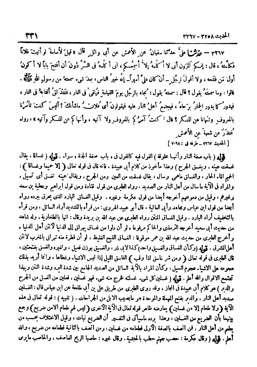 الْقَوْلُ فِيهِ كَالْقَوْلِ فِي بَابِ صِفَةِ الْجَنَّةِ سَوَاءٌ قَوْلُهُ غَسَّاقًا يُقَالُ غَسَقَتْ عَيْنُهُ وَيَغْسِقُ الْجُرْحُ وَهَذَا مَأْخُوذٌ مِنْ كَلَامِ أَبِي عُبَيْدَةَ فَإِنَّهُ قَالَ فِي قَوْلِهِ تَعَالَى إِلَّا حَمِيمًا وَغَسَّاقًا الْحَمِيمُ الْمَاءُ الْحَارُّ وَالْغَسَّاقُ مَا هُمِيَ وَسَالَ يُقَالُ غَسَقْتُ مِنَ الْعَيْنِ وَمِنَ الْجُرْحِ وَيُقَالُ عَيْنُهُ تَغْسِقُ أَيْ تَسِيلُ وَالْمُرَادُ فِي الْآيَةِ مَا سَالَ مِنْ أَهْلِ النَّارِ مِنَ الصَّدِيدِ رَوَاهُ الطَّبَرِيُّ مِنْ قَوْلِ قَتَادَةَ وَمِنْ قَوْلِ إِبْرَاهِيمَ وَعَطِيَّةَ بْنِ سَعْدٍ وَغَيْرِهِمْ وَقِيلَ مِنْ دُمُوعِهِمْ أَخْرَجَهُ أَيْضًا مِنْ قَوْلِ عِكْرِمَةَ وَغَيْرِهِ وَقِيلَ الْغَسَّاقُ الْبَارِدُ الَّذِي يُحْرِقُ بِبَرْدِهِ رَوَاهُ أَيْضا من قَول بن عَبَّاسٍ وَمُجَاهِدٍ وَأَبِي الْعَالِيَةِ قَالَ أَبُو عُبَيْدٍ الْهَرَوِيُّ مَنْ قَرَأَهُ بِالتَّشْدِيدِ أَرَادَ السَّائِلَ وَمَنْ قَرَأَهُ بِالتَّخْفِيفِ أَرَادَ الْبَارِدَ وَقِيلَ الْغَسَّاقُ الْمُنْتِنُ رَوَاهُ الطَّبَرِيُّ عَنْ عَبْدِ اللَّهِ بْنِ بُرَيْدَةَ وَقَالَ إِنَّهَا بِالطِّخَارِيَّةِ وَلَهُ شَاهِدٌ مِنْ حَدِيثِ أَبِي سَعِيدٍ أَخْرَجَهُ التِّرْمِذِيُّ وَالْحَاكِمُ مَرْفُوعًا لَوْ أَنَّ دَلْوًا مِنْ غَسَّاقٍ يُهْرَاقُ إِلَى الدُّنْيَا لَأَنْتَنَ أَهْلَ الدُّنْيَا وَأَخْرَجَ الطَّبَرِيُّ مِنْ حَدِيثِ عَبْدِ اللَّهِ بْنِ عُمَرَ مَوْقُوفًا الْغَسَّاقُ الْقَيْحُ الْغَلِيظُ لَوْ أَنَّ قَطْرَةً مِنْهُ تُهْرَاقُ بِالْمَغْرِبِ لَأَنْتَنَ أَهْلَ الْمَشْرِقِ قَوْلُهُ وَكَأَنَّ الْغَسَّاقَ وَالْغَسِيقَ وَاحِدٌ كَذَا لِأَبِي ذَرٍّ وَالْغَسِيقُ بِوَزْنِ فَعِيلٍ وَلِغَيْرِهِ وَالْغَسَقُ بِفَتْحَتَيْنِ قَالَ الطَّبَرِيُّ فِي قَوْلِهِ تَعَالَى وَمن شَرّ غَاسِق إِذا وَقب الْغَاسِقُ اللَّيْلُ إِذَا لَبِسَ الْأَشْيَاءَ وَغَطَّاهَا وَإِنَّمَا أُرِيدَ بِذَلِكَ هُجُومُهُ عَلَى الْأَشْيَاءِ هُجُومَ السَّيْلِ وَكَأَنَّ الْمُرَادَ بِالْآيَةِ السَّائِلُ مِنَ الصَّدِيدِ الْجَامِعِ بَيْنَ شِدَّةِ الْبَرْدِ وَشِدَّةِ النَّتْنِ وَبِهَذَا تَجْتَمِعُ الْأَقْوَالُ وَاللَّهُ أَعْلَمُ قَوْلُهُ غِسْلِينٍ كُلُّ شَيْءٍ غَسَلْتَهُ فَخَرَجَ مِنْهُ شَيْءٌ فَهُوَ غِسْلِينٌ فِعْلِينٌ من الْغسْل من الْجرْح والدبر هُوَ كَلَامُ أَبِي عُبَيْدَةَ فِي الْمَجَازِ وَقَدْ رَوَى الطَّبَرِيُّ مِنْ طَرِيقِ عَلِيِّ بْنِ أَبِي طَلْحَةَ عَنِ بن عَبَّاسٍ قَالَ الْغِسْلِينُ صَدِيدُ أَهْلِ النَّارِ وَالدَّبَرُ بِفَتْحِ الْمُهْمَلَةِ وَالْمُوَحَّدَةِ هُوَ مَا يُصِيبُ الْإِبِلَ مِنَ الْجِرَاحَاتِ تَنْبِيهٌ قَوْلُهُ تَعَالَى فِي هَذِهِ الْآيَة وَلَا طَعَام إِلَّا من غسلين يُعَارِضُهُ ظَاهِرُ قَوْلِهِ تَعَالَى فِي الْآيَةِ الْأُخْرَى لَيْسَ لَهُم طَعَام الا من ضَرِيع وَجَمَعَ بَيْنَهُمَا بِأَنَّ الضَّرِيعَ مِنَ الْغِسْلِينِ وَهَذَا يَرُدُّهُ مَا سَيَأْتِي فِي التَّفْسِيرِ أَنَّ الضَّرِيعَ نَبَاتٌ وَقِيلَ الِاخْتِلَافُ بِحَسَبِ مَنْ يُطْعَمُ مِنْ أَهْلِ النَّارِ فَمَنِ اتَّصَفَ بِالصِّفَةِ الْأُولَى فَطَعَامُهُ مِنْ غِسْلِينٍ وَمَنِ اتَّصَفَ بِالثَّانِيَةِ فَطَعَامُهُ مِنْ ضَرِيعٍ وَاللَّهُ أَعْلَمُ قَوْلُهُ وَقَالَ عِكْرِمَةُ حَصَبُ جَهَنَّمَ حَطَبٌ بِالْحَبَشِيَّةِ وَقَالَ غَيْرُهُ حَاصِبًا الرِّيحُ الْعَاصِفُ وَالْحَاصِبُ مَا يَرْمِي