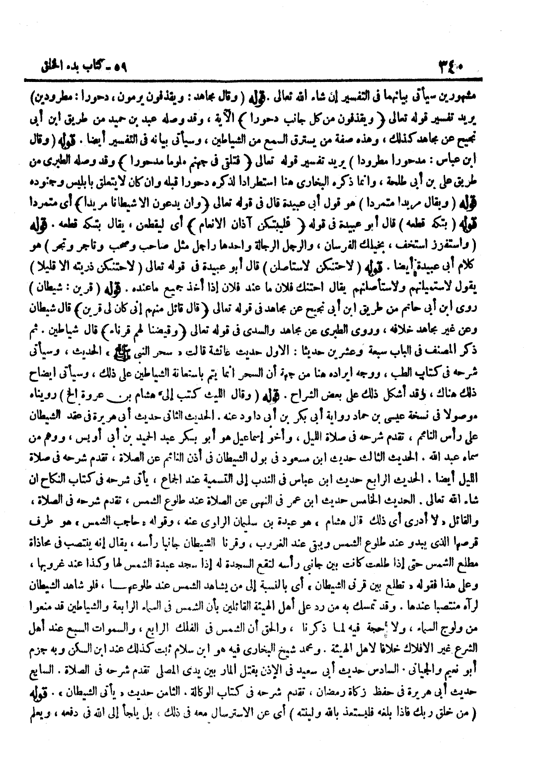[3272] حَاجِبَ الشَّمْسِ هُوَ طَرَفُ قُرْصِهَا الَّذِي يَبْدُوَ عِنْدَ طُلُوعِ الشَّمْسِ وَيَبْقَى عِنْدَ الْغُرُوبِ وَقَرْنَا الشَّيْطَانِ جَانِبَا رَأْسِهِ يُقَالُ إِنَّهُ يَنْتَصِبُ فِي مُحَاذَاةِ مَطْلَعِ الشَّمْسِ حَتَّى إِذَا طَلَعَتْ كَانَتْ بَيْنَ جَانِبَيْ رَأْسِهِ لِتَقَعَ السَّجْدَةُ لَهُ إِذَا سَجَدَ عَبَدَةُ الشَّمْسِ لَهَا وَكَذَا عِنْدَ غُرُوبِهَا وَعَلَى هَذَا فَقَوْلُهُ تَطْلُعُ بَيْنَ قَرْنَيِ الشَّيْطَانِ أَيْ بِالنِّسْبَةِ إِلَى مَنْ يُشَاهِدُ الشَّمْسَ عِنْدَ طُلُوعِهَا فَلَوْ شَاهَدَ الشَّيْطَانَ لَرَآهُ مُنْتَصِبًا عِنْدَهَا وَقَدْ تَمَسَّكَ بِهِ مَنْ رَدَّ عَلَى أَهْلِ الْهَيْئَةِ الْقَائِلِينَ بِأَنَّ الشَّمْسَ فِي السَّمَاءِ الرَّابِعَةِ وَالشَّيَاطِينَ قَدْ مُنِعُوا مِنْ وُلُوجِ السَّمَاءِ وَلَا حُجَّةَ فِيهِ لِمَا ذَكَرْنَا وَالْحَقُّ أَنَّ الشَّمْسَ فِي الْفَلَكِ الرَّابِعِ وَالسَّمَوَاتُ السَّبْعُ عِنْدَ أَهْلِ الشَّرْعِ غَيْرُ الْأَفْلَاكِ خِلَافًا لِأَهْلِ الْهَيْئَةِ وَمُحَمَّدٌ شَيْخُ الْبُخَارِيِّ فِيهِ هُوَ بن سَلام ثَبت كَذَلِك عِنْد بن السَّكَنِ وَبِهِ جَزَمَ أَبُو نُعَيْمٍ وَالْجَيَّانِيُّ السَّادِسُ حَدِيثُ أَبِي سَعِيدٍ فِي الْإِذْنِ بِقَتْلِ الْمَارِّ بَيْنَ يَدَيِ الْمُصَلِّي تَقَدَّمَ شَرْحُهُ فِي الصَّلَاةِ السَّابِعُ حَدِيثُ أَبِي هُرَيْرَةَ فِي حِفْظِ زَكَاةِ رَمَضَانَ تَقَدَّمَ شَرْحُهُ فِي كِتَابِ الْوَكَالَةِ الثَّامِنُ حَدِيثُ يَأْتِي الشَّيْطَانُ