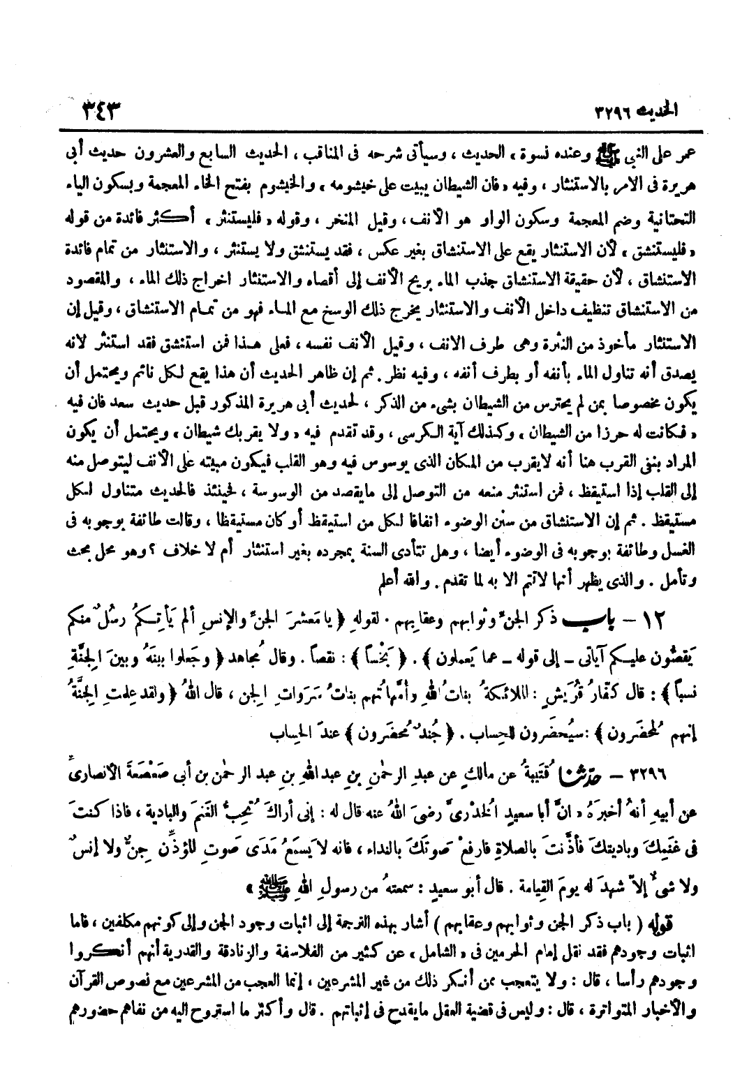 عُمَرُ عَلَى النَّبِيِّ صَلَّى اللَّهُ عَلَيْهِ وَسَلَّمَ وَعِنْدَهُ نِسْوَةٌ الْحَدِيثَ وَسَيَأْتِي شَرْحُهُ فِي الْمَنَاقِبِ الْحَدِيثُ السَّابِعُ وَالْعِشْرُونَ حَدِيثُ أَبِي هُرَيْرَةَ فِي الْأَمْرِ بِالِاسْتِنْثَارِ وَفِيهِ فَإِنَّ الشَّيْطَانَ يَبِيتُ عَلَى خَيْشُومِهِ وَالْخَيْشُومُ بِفَتْحِ الْخَاءِ الْمُعْجَمَةِ وَبِسُكُونِ الْيَاءِ التَّحْتَانِيَّةِ وَضَمِّ الْمُعْجَمَةِ وَسُكُونِ الْوَاوِ هُوَ الْأَنْفُ وَقِيلَ الْمَنْخِرُ وَقَوْلُهُ فَلْيَسْتَنْثِرْ أَكْثَرُ فَائِدَةً مِنْ قَوْلِهِ فَلْيَسْتَنْشِقْ لِأَنَّ الِاسْتِنْثَارَ يَقَعُ عَلَى الِاسْتِنْشَاقِ بِغَيْرِ عَكْسٍ فَقَدْ يَسْتَنْشِقُ وَلَا يَسْتَنْثِرُ وَالِاسْتِنْثَارُ مِنْ تَمَامِ فَائِدَةِ الِاسْتِنْشَاقِ لِأَنَّ حَقِيقَةَ الِاسْتِنْشَاقِ جَذْبُ الْمَاءِ بِرِيحِ الْأَنْفِ إِلَى أَقْصَاهُ وَالِاسْتِنْثَارُ إِخْرَاجُ ذَلِكَ الْمَاءِ وَالْمَقْصُودُ مِنْ الِاسْتِنْشَاقِ تَنْظِيفُ دَاخِلِ الْأَنْفِ وَالِاسْتِنْثَارُ يُخْرِجُ ذَلِكَ الْوَسَخَ مَعَ الْمَاءِ فَهُوَ مِنْ تَمَامِ الِاسْتِنْشَاقِ وَقِيلَ إِنَّ الِاسْتِنْثَارَ مَأْخُوذٌ مِنَ النَّثْرَةِ وَهِيَ طَرَفُ الْأَنْفِ وَقِيلَ الْأَنْفُ نَفْسُهُ فَعَلَى هَذَا فَمَنِ اسْتَنْشَقَ فَقَدِ اسْتَنْثَرَ لِأَنَّهُ يَصْدُقُ أَنَّهُ تَنَاوَلَ الْمَاءَ بِأَنْفِهِ أَوْ بِطَرَفِ أَنْفِهِ وَفِيهِ نَظَرٌ ثُمَّ إِنَّ ظَاهِرَ الْحَدِيثِ أَنَّ هَذَا يَقَعُ لِكُلِّ نَائِمٍ وَيُحْتَمَلُ أَنْ يَكُونَ مَخْصُوصًا بِمَنْ لَمْ يَحْتَرِسْ مِنَ الشَّيْطَانِ بِشَيْءٍ مِنَ الذِّكْرِ لِحَدِيثِ أَبِي هُرَيْرَةَ الْمَذْكُورِ قَبْلَ حَدِيثِ سَعْدٍ فَإِنَّ فِيهِ فَكَانَتْ لَهُ حِرْزًا مِنَ الشَّيْطَانِ وَكَذَلِكَ آيَةُ الْكُرْسِيِّ وَقَدْ تَقَدَّمَ فِيهِ وَلَا يَقْرَبُكَ شَيْطَانٌ وَيُحْتَمَلُ أَنْ يَكُونَ الْمُرَادُ بِنَفْيِ الْقُرْبِ هُنَا أَنَّهُ لَا يَقْرَبُ مِنَ الْمَكَانِ الَّذِي يُوَسْوِسُ فِيهِ وَهُوَ الْقَلْبُ فَيَكُونُ مَبِيتُهُ عَلَى الْأَنْفِ لِيَتَوَصَّلَ مِنْهُ إِلَى الْقَلْبِ إِذَا اسْتَيْقَظَ فَمَنِ اسْتَنْثَرَ مَنَعَهُ مِنَ التَّوَصُّلِ إِلَى مَا يَقْصِدُ مِنَ الْوَسْوَسَةِ فَحِينَئِذٍ فَالْحَدِيثُ مُتَنَاوِلٌ لِكُلِّ مُسْتَيْقِظٍ ثُمَّ إِنَّ الِاسْتِنْشَاقَ مِنْ سُنَنِ الْوُضُوءِ اتِّفَاقًا لِكُلِّ مَنِ اسْتَيْقَظَ أَوْ كَانَ مُسْتَيْقِظًا وَقَالَتْ طَائِفَةٌ بِوُجُوبِهِ فِي الْغُسْلِ وَطَائِفَةٌ بِوُجُوبِهِ فِي الْوُضُوءِ أَيْضًا وَهَلْ تَتَأَدَّى السُّنَّةُ بِمُجَرَّدِهِ بِغَيْرِ اسْتِنْثَارٍ أَمْ لَا خِلَافَ وَهُوَ مَحَلُّ بَحْثٍ وَتَأَمُّلٍ وَالَّذِي يَظْهَرُ أَنَّهَا لَا تَتِمُّ الا بِهِ لما تقدم وَالله أعلم