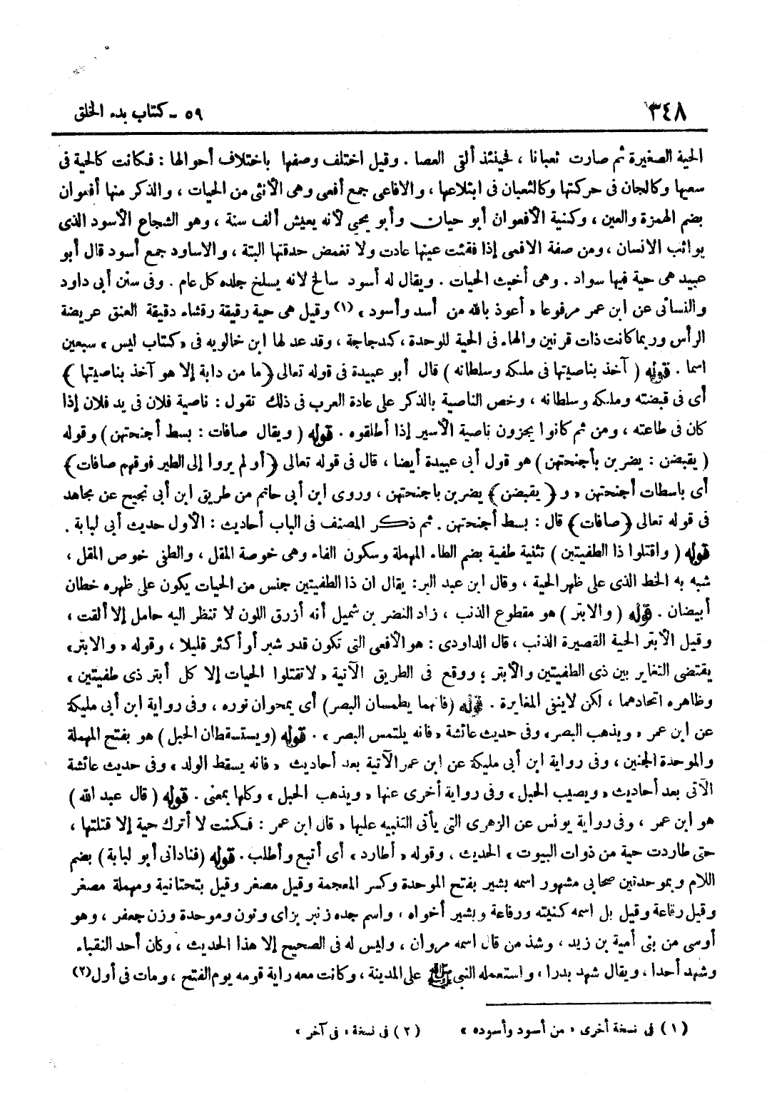 الْحَيَّةُ الصَّغِيرَةُ ثُمَّ صَارَتْ ثُعْبَانًا فَحِينَئِذٍ أَلْقَى الْعَصَا وَقِيلَ اخْتَلَفَ وَصْفُهَا بِاخْتِلَافِ أَحْوَالِهَا فَكَانَتْ كَالْحَيَّةِ فِي سَعْيِهَا وَكَالْجَانِّ فِي حَرَكَتِهَا وَكَالثُّعْبَانِ فِي ابْتِلَاعِهَا وَالْأَفَاعِي جَمْعُ أَفْعَى وَهِيَ الْأُنْثَى مِنَ الْحَيَّاتِ وَالذَّكَرُ مِنْهَا أُفْعُوَانٌ بِضَمِّ الْهَمْزَةِ وَالْعَيْنِ وَكُنْيَةُ الْأُفْعُوَانِ أَبُو حَيَّانَ وَأَبُو يَحْيَى لِأَنَّهُ يَعِيشُ أَلْفَ سَنَةٍ وَهُوَ الشُّجَاعُ الْأَسْوَدُ الَّذِي يُوَاثِبُ الْإِنْسَانَ وَمِنْ صِفَةِ الْأَفْعَى إِذَا فُقِئَتْ عَيْنُهَا عَادَتْ وَلَا تُغْمِضُ حَدَقَتَهَا الْبَتَّةَ وَالْأَسَاوِدُ جَمْعُ أَسْوَدَ قَالَ أَبُو عُبَيْدٍ هِيَ حَيَّةٌ فِيهَا سَوَادٌ وَهِيَ أَخْبَثُ الْحَيَّاتِ وَيُقَالُ لَهُ أَسْوَدُ سَالِخٌ لِأَنَّهُ يَسْلُخُ جِلْدَهُ كُلَّ عَامٍ وَفِي سُنَنِ أَبِي دَاوُدَ وَالنَّسَائِيِّ عَنِ بن عُمَرَ مَرْفُوعًا أَعُوذُ بِاللَّهِ مِنْ أَسَدٍ وَأَسْوَدَ وَقِيلَ هِيَ حَيَّةٌ رَقِيقَةٌ رَقْشَاءُ دَقِيقَةُ الْعُنُقِ عَرِيضَةُ الرَّأْسِ وَرُبَّمَا كَانَتْ ذَاتَ قَرْنَيْنِ وَالْهَاءُ فِي الْحَيَّةِ لِلْوَحْدَةِ كَدَجَاجَةٍ وَقَدْ عَدَّ لَهَا بن خَالَوَيْهِ فِي كِتَابِ لَيْسَ سَبْعِينَ اسْمًا قَوْلُهُ آخِذٌ بِنَاصِيَتِهَا فِي مُلْكِهِ وَسُلْطَانِهِ قَالَ أَبُو عُبَيْدَةَ فِي قَوْلِهِ تَعَالَى مَا مِنْ دَابَّةٍ الا هُوَ آخذ بناصيتها أَيْ فِي قَبْضَتِهِ وَمُلْكِهِ وَسُلْطَانِهِ وَخَصَّ النَّاصِيَةَ بِالذِّكْرِ عَلَى عَادَةِ الْعَرَبِ فِي ذَلِكَ تَقُولُ نَاصِيَةُ فُلَانٍ فِي يَدِ فُلَانٍ إِذَا كَانَ فِي طَاعَتِهِ وَمِنْ ثَمَّ كَانُوا يَجُزُّونَ نَاصِيَةَ الْأَسِيرِ إِذَا أَطْلَقُوهُ قَوْلُهُ وَيُقَالُ صَافَّاتٍ بُسُطٌ أَجْنِحَتُهُنَّ وَقَوْلُهُ يَقْبِضْنَ يَضْرِبْنَ بِأَجْنِحَتِهِنَّ هُوَ قَوْلُ أَبِي عُبَيْدَةَ أَيْضًا قَالَ فِي قَوْلِهِ تَعَالَى أَو لم يرَوا إِلَى الطير فَوْقهم صافات أَي باسطات أجنحتهن ويقبضن يضربن بأجنحتهن وروى بن أبي حَاتِم من طَرِيق بن أَبِي نَجِيحٍ عَنْ مُجَاهِدٍ فِي قَوْلِهِ تَعَالَى صَافَّاتٍ قَالَ بُسُطٌ أَجْنِحَتُهُنَّ ثُمَّ ذَكَرَ الْمُصَنِّفُ فِي الْبَابِ أَحَادِيثَ الْأَوَّلُ حَدِيثُ أَبِي لُبَابَةَ قَوْلُهُ وَاقْتُلُوا ذَا الطُّفْيَتَيْنِ تَثْنِيَةُ طُفْيَةٍ بِضَمِّ الطَّاءِ الْمُهْمَلَةِ وَسُكُونِ الْفَاءِ وَهِيَ خُوصَةُ الْمُقَلِ وَالطَّفْيُ خُوصُ الْمُقَلِ شَبَّهَ بِهِ الْخَطَّ الَّذِي على ظهر الْحَيَّة وَقَالَ بن عَبْدِ الْبَرِّ يُقَالُ إنَّ ذَا الطُّفْيَتَيْنِ جِنْسٌ مِنَ الْحَيَّاتِ يَكُونُ عَلَى ظَهْرِهِ خَطَّانِ أَبْيَضَانِ