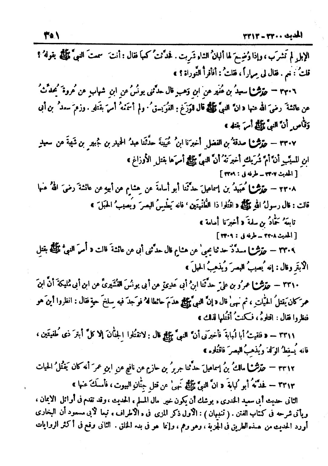 الثَّانِي حَدِيثُ أَبِي سَعِيدٍ الْخُدْرِيِّ يُوشِكُ أَنْ يَكُونَ خَيْرُ مَالِ الْمُسْلِمِ الْحَدِيثَ وَقَدْ تَقَدَّمَ فِي أَوَائِلِ الْإِيمَانِ وَيَأْتِي شَرْحُهُ فِي كِتَابِ الْفِتَنِ تَنْبِيهَانِ الْأَوَّلُ ذَكَرَ الْمِزِّيُّ فِي الْأَطْرَافِ تَبَعًا لِأَبِي مَسْعُودٍ أَنَّ الْبُخَارِيَّ أَوْرَدَ الْحَدِيثَ مِنْ هَذِهِ الطَّرِيقِ فِي الْجِزْيَةِ وَهُوَ وَهْمٌ وَإِنَّمَا هُوَ فِي بَدْءِ الْخَلْقِ الثَّانِي وَقَعَ فِي أَكْثَرِ الرِّوَايَاتِ