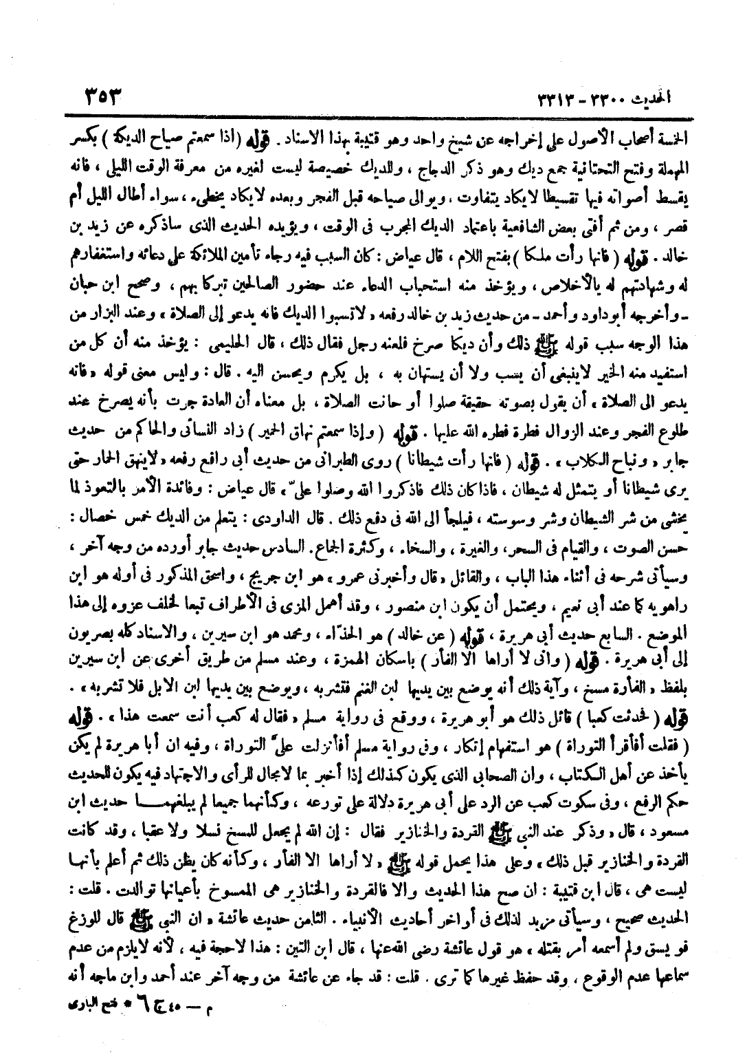 الْخَمْسَةُ أَصْحَابُ الْأُصُولِ عَلَى إِخْرَاجِهِ عَنْ شَيْخٍ وَاحِدٍ وَهُوَ قُتَيْبَةُ بِهَذَا الْإِسْنَادِ قَوْلُهُ إِذَا سَمِعْتُمْ صِيَاحَ الدِّيَكَةِ بِكَسْرِ الْمُهْمَلَةِ وَفَتْحِ التَّحْتَانِيَّةِ جَمْعُ دِيكٍ وَهُوَ ذَكَرُ الدَّجَاجِ وَلِلدِّيكِ خَصِيصَةٌ لَيْسَتْ لِغَيْرِهِ مِنْ مَعْرِفَةِ الْوَقْتِ اللَّيْلِيِّ فَإِنَّهُ يُقَسِّطُ أَصْوَاتَهُ فِيهَا تَقْسِيطًا لَا يَكَادُ يَتَفَاوَتُ وَيُوَالِي صِيَاحَهُ قَبْلَ الْفَجْرِ وَبَعْدَهُ لَا يَكَادُ يُخْطِئُ سَوَاءٌ أَطَالَ اللَّيْلُ أَمْ قَصُرَ وَمِنْ ثَمَّ أَفْتَى بَعْضُ الشَّافِعِيَّةِ بِاعْتِمَادِ الدِّيكِ الْمُجَرَّبِ فِي الْوَقْتِ وَيُؤَيِّدُهُ الْحَدِيثُ الَّذِي سَأَذْكُرُهُ عَنْ زَيْدِ بْنِ خَالِدٍ قَوْلُهُ فَإِنَّهَا رَأَتْ مَلَكًا بِفَتْحِ اللَّامِ قَالَ عِيَاضٌ كَانَ السَّبَبُ فِيهِ رَجَاءَ تَأْمِينِ الْمَلَائِكَةِ عَلَى دُعَائِهِ وَاسْتِغْفَارِهِمْ لَهُ وَشَهَادَتِهِمْ لَهُ بِالْإِخْلَاصِ وَيُؤْخَذُ مِنْهُ اسْتِحْبَابُ الدُّعَاءِ عِنْد حُضُور الصَّالِحين تبركا بهم وَصحح بن حِبَّانَ وَأَخْرَجَهُ أَبُو دَاوُدَ وَأَحْمَدُ مِنْ حَدِيثِ زَيْدِ بْنِ خَالِدٍ رَفَعَهُ لَا تَسُبُّوا الدِّيكَ فَإِنَّهُ يَدْعُو إِلَى الصَّلَاةِ وَعِنْدَ الْبَزَّارِ مِنْ هَذَا الْوَجْهِ سَبَبُ قَوْلِهِ صَلَّى اللَّهُ عَلَيْهِ وَسَلَّمَ ذَلِكَ وَأَنَّ دِيكًا صَرَخَ فَلَعَنَهُ رَجُلٌ فَقَالَ ذَلِكَ قَالَ الْحَلِيمِيُّ يُؤْخَذُ مِنْهُ أَنَّ كُلَّ مَنِ اسْتُفِيدَ مِنْهُ الْخَيْرُ لَا يَنْبَغِي أَنْ يُسَبَّ وَلَا أَنْ يُسْتَهَانَ بِهِ بَلْ يُكْرَمُ وَيُحْسَنُ إِلَيْهِ قَالَ وَلَيْسَ مَعْنَى قَوْلِهِ فَإِنَّهُ يَدْعُو إِلَى الصَّلَاةِ أَنْ يَقُولَ بِصَوْتِهِ حَقِيقَةً صَلُّوا أَوْ حَانَتِ الصَّلَاةُ بَلْ مَعْنَاهُ أَنَّ الْعَادَةَ جَرَتْ بِأَنَّهُ يَصْرُخُ عِنْدَ طُلُوعِ الْفَجْرِ وَعِنْدَ الزَّوَالِ فِطْرَةً فَطَرَهُ اللَّهُ عَلَيْهَا قَوْلُهُ وَإِذَا سَمِعْتُمْ نُهَاقَ الْحَمِيرِ زَادَ النَّسَائِيُّ وَالْحَاكِمُ مِنْ حَدِيثِ جَابِرٍ وَنُبَاحَ الْكِلَابِ قَوْلُهُ فَإِنَّهَا رَأَتْ شَيْطَانًا رَوَى الطَّبَرَانِيُّ مِنْ حَدِيثِ أَبِي رَافِعٍ رَفَعَهُ لَا يَنْهَقُ الْحِمَارُ حَتَّى يَرَى شَيْطَانًا أَوْ يَتَمَثَّلَ لَهُ شَيْطَانٌ فَإِذَا كَانَ ذَلِكَ فَاذْكُرُوا اللَّهَ وَصَلُّوا عَلَيَّ قَالَ عِيَاضٌ وَفَائِدَةُ الْأَمْرِ بِالتَّعَوُّذِ لِمَا يُخْشَى مِنْ شَرِّ الشَّيْطَانِ وَشَرِّ وَسْوَسَتِهِ فَيُلْجَأُ إِلَى اللَّهِ فِي دَفْعِ ذَلِكَ قَالَ الدَّاوُدِيُّ يُتَعَلَّمُ مِنَ الدِّيكِ خَمْسُ خِصَالٍ حُسْنُ الصَّوْتِ وَالْقِيَامُ فِي السَّحَرِ وَالْغَيْرَةُ وَالسَّخَاءُ وَكَثْرَةُ الْجِمَاعِ السَّادِسُ حَدِيثُ جَابِرٍ أَوْرَدَهُ مِنْ وَجْهٍ آخَرَ وَسَيَأْتِي شَرْحُهُ فِي أَثْنَاءِ هَذَا الْبَابِ وَالْقَائِلُ قَالَ وَأَخْبَرَنِي عَمْرو هُوَ بن جريج وَإِسْحَاق الْمَذْكُور فِي أَوله هُوَ بن رَاهَوَيْهِ كَمَا عِنْدَ أَبِي نُعَيْمٍ وَيُحْتَمَلُ أَنْ يكون بن مَنْصُورٍ وَقَدْ أَهْمَلَ الْمِزِّيُّ فِي الْأَطْرَافِ تَبَعًا لِخَلَفٍ عَزْوَهُ إِلَى هَذَا الْمَوْضِعِ السَّابِعُ حَدِيثُ أَبِي هُرَيْرَةَ