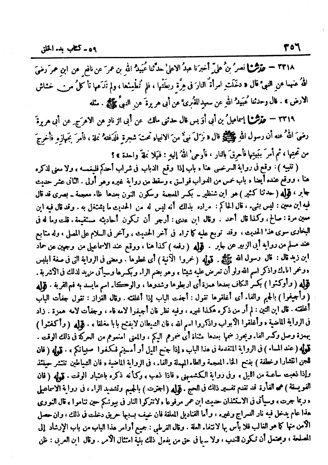 [3316] قَوْلُهُ حَدَّثَنَا كَثِيرٌ هُوَ بن شِنْظِيرٍ بِكَسْرِ الْمُعْجَمَةِ وَسُكُونِ النُّونِ بَعْدَهَا ظَاءٌ مُعْجمَة بَصرِي قد قَالَ فِيهِ بن مَعِينٍ لَيْسَ بِشَيْءٍ قَالَ الْحَاكِمُ مُرَادُهُ بِذَلِكَ أَنَّهُ لَيْسَ لَهُ مِنَ الْحَدِيثِ مَا يَشْتَغِلُ بِهِ وَقد قَالَ فِيهِ بن مَعِينٍ مَرَّةً صَالِحٌ وَكَذَا قَالَ أَحْمَدُ وَقَالَ بن عَدِيٍّ أَرْجُو أَنْ تَكُونَ أَحَادِيثُهُ مُسْتَقِيمَةً قُلْتُ وَمَا لَهُ فِي الْبُخَارِيِّ سِوَى هَذَا الْحَدِيثِ وَقَدْ تُوبِعَ عَلَيْهِ كَمَا تَرَاهُ فِي آخِرِ الْحَدِيثِ وَآخَرُ فِي السَّلَامِ عَلَى الْمُصَلِّي وَلَهُ مُتَابِعٌ عِنْدَ مُسْلِمٍ مِنْ رِوَايَةِ أَبِي الزُّبَيْرِ عَنْ جَابِرٍ قَوْلُهُ رَفَعَهُ كَذَا هُنَا وَوَقَعَ عِنْدَ الْإِسْمَاعِيلِيِّ مِنْ وَجْهَيْنِ عَنْ حَمَّادِ بْنِ زَيْدٍ قَالَ قَالَ رَسُولُ اللَّهِ صَلَّى اللَّهُ عَلَيْهِ وَسَلَّمَ قَوْلُهُ خَمِّرُوا الْآنِيَةَ أَيْ غَطُّوهَا وَمَضَى فِي الرِّوَايَةِ الَّتِي فِي صِفَةِ إِبْلِيسَ وَخَمِّرْ إِنَاءَكَ وَاذْكُرِ اسْمَ اللَّهِ وَلَوْ أَنْ تُعَرِّضَ عَلَيْهِ شَيْئًا وَهُوَ بِضَمِّ الرَّاءِ وَبِكَسْرِهَا وَسَيَأْتِي مَزِيدٌ لِذَلِكَ فِي الْأَشْرِبَةِ قَوْلُهُ وَأَوْكِئُوا بِكَسْرِ الْكَافِ بَعْدَهَا هَمْزَةٌ أَيِ ارْبُطُوهَا وَشُدُّوهَا وَالْوِكَاءُ اسْمُ مَا يُسَدُّ بِهِ فَمُ الْقِرْبَةِ قَوْلُهُ وَأَجِيفُوا بِالْجِيمِ وَالْفَاءِ أَيْ أَغْلِقُوهَا تَقُولُ أَجَفْتُ الْبَابَ إِذَا أَغْلَقْتُهُ وَقَالَ الْقَزَّازُ تَقُولُ جفأت الْبَاب أغلقته قَالَ بن التِّينِ لَمْ أَرَ مَنْ ذَكَرَهُ هَكَذَا غَيْرَهُ وَفِيهِ نَظَرٌ فَإِنَّ أَجِيفُوا لَامُهُ فَاءٌ وَجَفَأْتُ لَامُهُ هَمْزَةٌ زَادَ فِي الرِّوَايَةِ الْمَاضِيَةِ وَأَغْلِقُوا الْأَبْوَابَ وَاذْكُرُوا اسْمَ اللَّهِ فَإِنَّ الشَّيْطَانَ لَا يَفْتَحُ بَابًا مُغْلَقًا قَوْلُهُ وَاكْفِتُوا بِهَمْزَةِ وَصْلٍ وَكَسْرِ الْفَاءِ وَيَجُوزُ ضَمُّهَا بَعْدَهَا مُثَنَّاةٌ أَيْ ضُمُّوهُمْ إِلَيْكُمْ وَالْمَعْنَى امْنَعُوهُمْ مِنَ الْحَرَكَةِ فِي ذَلِكَ الْوَقْتِ قَوْلُهُ عِنْدَ الْمَسَاءِ فِي الرِّوَايَةِ الْمُتَقَدِّمَةِ فِي هَذَا الْبَابِ إِذَا جَنَحَ اللَّيْلُ أَوْ أَمْسَيْتُمْ فَكُفُّوا صِبْيَانَكُمْ قَوْلُهُ فَإِنَّ لِلْجِنِّ انْتِشَارًا وَخَطَفَةً بِفَتْحِ الْخَاءِ الْمُعْجَمَةِ وَالطَّاءِ الْمُهْمَلَةِ وَالْفَاءِ فِي الرِّوَايَةِ الْمَاضِيَةِ فَإِنَّ الشَّيَاطِينَ تَنْتَشِرُ حِينَئِذٍ وَإِذَا ذَهَبَتْ سَاعَةٌ مِنَ اللَّيْلِ وَفِي رِوَايَةِ الْكُشْمِيهَنِيِّ فَإِذَا ذَهَبَ وَكَأَنَّهُ ذَكَّرَهُ بِاعْتِبَارِ الْوَقْتِ قَوْلُهُ فَإِنَّ الْفُوَيْسِقَةَ هِيَ الْفَأْرَةُ قَدْ تَقَدَّمَ تَفْسِيرُ ذَلِكَ فِي الْحَجِّ قَوْلُهُ اجْتَرَّتْ بِالْجِيمِ وَتَشْدِيدِ الرَّاءِ فِي رِوَايَةِ الْإِسْمَاعِيلِيِّ رُبَّمَا جرت وَسَيَأْتِي فِي الاسْتِئْذَان حَدِيث بن عُمَرَ مَرْفُوعًا لَا تَتْرُكُوا النَّارَ فِي بُيُوتِكُمْ حِين تناموا قَالَ النَّوَوِيُّ هَذَا عَامٌّ يَدْخُلُ فِيهِ نَارُ السِّرَاجِ وَغَيْرُهُ وَأَمَّا الْقَنَادِيلُ الْمُعَلَّقَةُ فَإِنْ خِيفَ بِسَبَبِهَا حَرِيقٌ دَخَلَتْ فِي ذَلِكَ وَإِنْ حَصَلَ الْأَمْنُ مِنْهَا كَمَا هُوَ الْغَالِبُ فَلَا بَأْسَ بِهَا لِانْتِفَاءِ الْعِلَّةِ وَقَالَ الْقُرْطُبِيُّ جَمِيعُ أَوَامِرِ هَذَا الْبَابِ مِنْ بَابِ الْإِرْشَادِ إِلَى الْمَصْلَحَةِ وَيُحْتَمَلُ أَنْ تَكُونَ لِلنَّدْبِ وَلَا سِيَّمَا فِي حَقِّ مَنْ يَفْعَلُ ذَلِكَ بِنِيَّةِ امْتِثَالِ الْأَمْرِ وَقَالَ بن الْعَرَبِيّ ظن