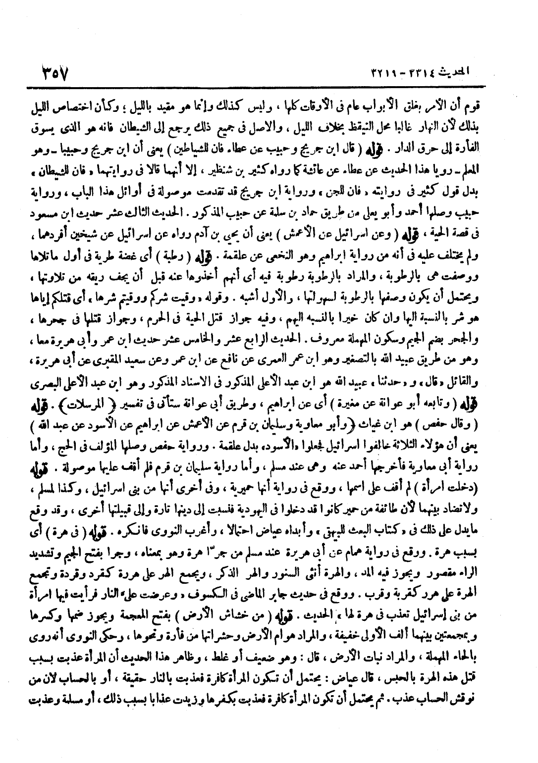 [3317] قَوْلُهُ وَعَنْ إِسْرَائِيلَ عَنِ الْأَعْمَشِ يَعْنِي أَنَّ يَحْيَى بْنَ آدَمَ رَوَاهُ عَنْ إِسْرَائِيلَ عَنْ شَيْخَيْنِ أَفْرَدَهُمَا وَلَمْ يَخْتَلِفْ عَلَيْهِ فِي أَنَّهُ مِنْ رِوَايَةِ إِبْرَاهِيمَ وَهُوَ النَّخَعِيُّ عَنْ عَلْقَمَةَ قَوْلُهُ رَطْبَةٌ أَيْ غَضَّةٌ طَرِيَّةٌ فِي أَوَّلِ مَا تَلَاهَا وَوُصِفَتْ هِيَ بِالرُّطُوبَةِ وَالْمُرَادُ بِالرُّطُوبَةِ رُطُوبَةُ فِيهِ أَيْ أَنَّهُمْ أَخَذُوهَا عَنْهُ قَبْلَ أَنْ يَجِفَّ رِيقُهُ مِنْ تِلَاوَتِهَا وَيُحْتَمَلُ أَنْ يَكُونَ وَصَفَهَا بِالرُّطُوبَةِ لِسُهُولَتِهَا وَالْأَوَّلُ أَشْبَهُ وَقَوْلُهُ وُقِيَتْ شَرَّكُمْ وَوُقِيتُمْ شَرَّهَا أَيْ قَتْلُكُمْ إِيَّاهَا هُوَ شَرٌّ بِالنِّسْبَةِ إِلَيْهَا وَإِنْ كَانَ خَيْرًا بِالنِّسْبَةِ إِلَيْهِمْ وَفِيهِ جَوَازُ قَتْلِ الْحَيَّةِ فِي الْحَرَمِ وَجَوَازُ قَتْلِهَا فِي جُحْرِهَا وَالْجُحْرُ بِضَمِّ الْجِيمِ وَسُكُونِ الْمُهْمَلَةِ مَعْرُوفٌ الْحَدِيثُ الرَّابِعَ عَشَرَ وَالْخَامِسَ عَشَرَ حَدِيثُ بن عُمَرَ وَأَبِي هُرَيْرَةَ مَعًا وَهُوَ مِنْ طَرِيقِ عبيد الله بِالتَّصْغِيرِ وَهُوَ بن عمر الْعمريّ عَن نَافِع عَن بن عُمَرَ وَعَنْ سَعِيدٍ الْمَقْبُرِيِّ عَنْ أَبِي هُرَيْرَةَ وَالْقَائِل قَالَ وَحدثنَا عبيد الله هُوَ بن عَبْدِ الْأَعْلَى الْمَذْكُورُ فِي الْإِسْنَادِ الْمَذْكُورِ وَهُوَ بن عَبْدِ الْأَعْلَى الْبَصْرِيُّ قَوْلُهُ وَتَابَعَهُ أَبُو عَوَانَةَ عَنْ مُغِيرَةَ أَيْ عَنْ إِبْرَاهِيمَ وَطَرِيقُ أَبِي عوَانَة سَيَأْتِي فِي تَفْسِيرِ الْمُرْسَلَاتِ قَوْلُهُ وَقَالَ حَفْصٌ هُوَ بن غِيَاثٍ وَأَبُو مُعَاوِيَةَ وَسُلَيْمَانُ بْنُ قَرْمٍ عَنِ الْأَعْمَشِ عَنْ إِبْرَاهِيمَ عَنِ الْأَسْوَدِ عَنْ عَبْدِ اللَّهِ يَعْنِي أَنَّ هَؤُلَاءِ الثَّلَاثَةِ خَالَفُوا إِسْرَائِيلَ فَجَعَلُوا الْأَسْوَدَ بَدَلَ عَلْقَمَةَ وَرِوَايَةُ حَفْصٍ وَصَلَهَا الْمُؤَلِّفُ فِي الْحَجِّ وَأَمَّا رِوَايَةُ أَبِي مُعَاوِيَةَ فَأَخْرَجَهَا أَحْمَدُ عَنْهُ وَهِيَ عِنْدَ مُسْلِمٍ وَأَمَّا رِوَايَةُ سُلَيْمَانَ بْنِ قَرْمٍ فَلَمْ أَقِفْ عَلَيْهَا مَوْصُولَةً قَوْلُهُ دَخَلَتِ امْرَأَةٌ لَمْ أَقِفْ عَلَى اسْمِهَا وَوَقَعَ فِي رِوَايَةٍ أَنَّهَا حِمْيَرِيَّةٌ وَفِي أُخْرَى أَنَّهَا مِنْ بَنِي إِسْرَائِيلَ وَكَذَا لِمُسْلِمٍ وَلَا تَضَادَّ بَيْنَهُمَا لِأَنَّ طَائِفَةً مِنْ حِمْيَرٍ كَانُوا قَدْ دَخَلُوا فِي الْيَهُودِيَّةِ فَنُسِبَتْ إِلَى دِينِهَا تَارَةً وَإِلَى قَبِيلَتِهَا أُخْرَى وَقَدْ وَقَعَ مَا يَدُلُّ عَلَى ذَلِكَ فِي كِتَابِ الْبَعْثِ لِلْبَيْهَقِيِّ وَأَبْدَاهُ عِيَاضٌ احْتِمَالًا وَأَغْرَبَ النَّوَوِيُّ فَأَنْكَرَهُ