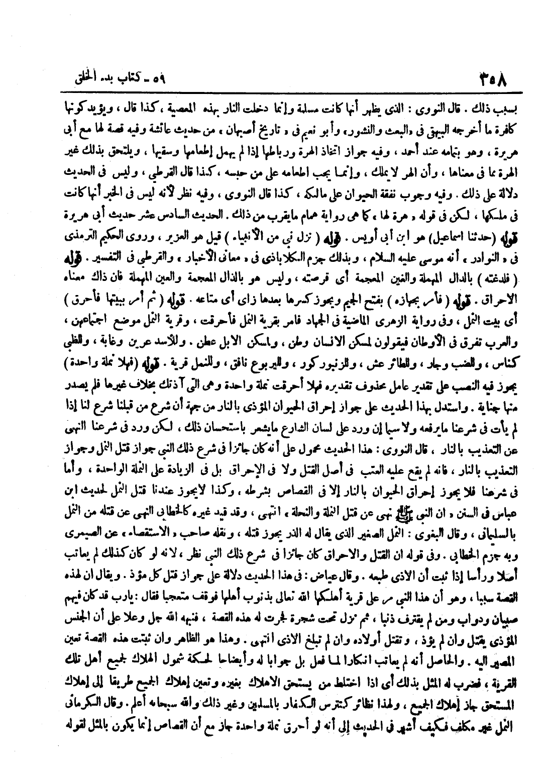 [3319] قَوْلُهُ نَزَلَ نَبِيٌّ مِنَ الْأَنْبِيَاءِ قِيلَ هُوَ الْعُزَيْرُ وَرَوَى الْحَكِيمُ التِّرْمِذِيُّ فِي النَّوَادِرِ أَنَّهُ مُوسَى عَلَيْهِ السَّلَامُ وَبِذَلِكَ جَزَمَ الْكَلَابَاذِيُّ فِي مَعَانِي الْأَخْبَارِ وَالْقُرْطُبِيُّ فِي التَّفْسِيرِ قَوْلُهُ فَلَدَغَتْهُ بِالدَّالِ الْمُهْمَلَةِ وَالْغَيْنِ الْمُعْجَمَةِ أَيْ قَرَصَتْهُ وَلَيْسَ هُوَ بِالذَّالِ الْمُعْجَمَةِ وَالْعَيْنِ الْمُهْمَلَةِ فَإِنَّ ذَاكَ مَعْنَاهُ الْإِحْرَاقُ قَوْلُهُ فَأَمَرَ بِجَهَازِهِ بِفَتْحِ الْجِيمِ وَيَجُوزُ كَسْرُهَا بَعْدَهَا زَايٌ أَيْ مَتَاعِهِ قَوْلُهُ ثُمَّ أَمَرَ بِبَيْتِهَا فَأُحْرِقَ أَيْ بَيْتَ النَّمْلِ وَفِي رِوَايَةِ الزُّهْرِيِّ الْمَاضِيَةِ فِي الْجِهَادِ فَأَمَرَ بِقَرْيَةِ النَّمْلِ فَأُحْرِقَتْ وَقَرْيَةُ النَّمْلِ مَوْضِعُ اجْتِمَاعِهِنَّ وَالْعَرَبُ تُفَرِّقُ فِي الْأَوْطَانِ فَيَقُولُونَ لِمَسْكَنِ الْإِنْسَانِ وَطَنٌ وَلِمَسْكَنِ الْإِبِلِ عَطَنٌ وَلِلْأَسَدِ عَرِينٌ وَغَابَةٌ وَلِلظَّبْيِ كِنَاسٌ وَلِلضَّبِّ وِجَارٌ وَلِلطَّائِرِ عُشٌّ وَلِلزُّنْبُورِ كَوْرٌ وَلِلْيَرْبُوعِ نَافِقٌ وَلِلنَّمْلِ قَرْيَةٌ قَوْلُهُ فَهَلَّا نَمْلَةً وَاحِدَةً يَجُوزُ فِيهِ النَّصْبُ عَلَى تَقْدِيرِ عَامِلٍ مَحْذُوفٍ تَقْدِيرُهُ فَهَلَّا أَحْرَقْتَ نَمْلَةً وَاحِدَةً وَهِيَ الَّتِي آذَتْكَ بِخِلَافِ غَيْرِهَا فَلَمْ يَصْدُرْ مِنْهَا جِنَايَةٌ وَاسْتُدِلَّ بِهَذَا الْحَدِيثِ عَلَى جَوَازِ إِحْرَاقِ الْحَيَوَانِ الْمُؤْذِي بِالنَّارِ مِنْ جِهَةِ أَنَّ شَرْعَ مَنْ قَبْلَنَا شَرْعٌ لَنَا إِذَا لَمْ يَأْتِ فِي شَرْعِنَا مَا يَرْفَعُهُ وَلَا سِيَّمَا إِنْ وَرَدَ عَلَى لِسَانِ الشَّارِعِ مَا يُشْعِرُ بِاسْتِحْسَانِ ذَلِكَ لَكِنْ وَرَدَ فِي شَرْعِنَا النَّهْيُ عَنِ التَّعْذِيبِ بِالنَّارِ قَالَ النَّوَوِيُّ هَذَا الْحَدِيثُ مَحْمُولٌ عَلَى أَنَّهُ كَانَ جَائِزًا فِي شَرْعِ ذَلِكَ النَّبِيِّ جَوَازُ قَتْلِ النَّمْلِ وَجَوَازُ التَّعْذِيبِ بِالنَّارِ فَإِنَّهُ لَمْ يَقَعْ عَلَيْهِ الْعَتْبُ فِي أَصْلِ الْقَتْلِ وَلَا فِي الْإِحْرَاقِ بَلْ فِي الزِّيَادَةِ عَلَى النَّمْلَةِ الْوَاحِدَةِ وَأَمَّا فِي شَرْعِنَا فَلَا يَجُوزُ إِحْرَاقُ الْحَيَوَانِ بِالنَّارِ إِلَّا فِي الْقِصَاصِ بِشَرْطِهِ وَكَذَا لَا يَجُوزُ عندنَا قتل النَّمْل لحَدِيث بن عَبَّاسٍ فِي السُّنَنِ أَنَّ النَّبِيَّ صَلَّى اللَّهُ عَلَيْهِ وَسَلَّمَ نَهَى عَنْ قَتْلِ النَّمْلَةِ وَالنَّحْلَةِ انْتَهَى وَقَدْ قَيَّدَ غَيْرُهُ كَالْخَطَّابِيِّ النَّهْيَ عَنْ قَتْلِهِ مِنَ النَّمْلِ بِالسُّلَيْمَانِيِّ وَقَالَ الْبَغَوِيُّ النَّمْلُ الصَّغِيرُ الَّذِي يُقَالُ لَهُ الذَّرُّ يَجُوزُ قَتْلُهُ وَنَقَلَهُ صَاحِبُ الِاسْتِقْصَاءِ عَنِ الصَّيْمَرِيِّ وَبِهِ جَزَمَ الْخَطَّابِيُّ وَفِي قَوْلِهِ أَنَّ الْقَتْلَ وَالْإِحْرَاقَ كَانَ جَائِزًا فِي شَرْعِ ذَلِكَ النَّبِيِّ نَظَرٌ لِأَنَّهُ لَوْ كَانَ كَذَلِكَ لَمْ يُعَاتَبْ أَصْلًا وَرَأْسًا إِذَا ثَبَتَ أَنَّ الْأَذَى طَبْعُهُ وَقَالَ عِيَاضٌ فِي هَذَا الْحَدِيثِ دَلَالَةٌ عَلَى جَوَازِ قَتْلِ كُلِّ مُؤْذٍ وَيُقَالُ إِنَّ لِهَذِهِ الْقِصَّةِ سَبَبًا وَهُوَ أَنَّ هَذَا النَّبِيَّ مَرَّ عَلَى قَرْيَةٍ أَهْلَكَهَا اللَّهُ تَعَالَى بِذُنُوبِ أَهْلِهَا فَوَقَفَ مُتَعَجِّبًا فَقَالَ يَا رَبِّ قَدْ كَانَ فِيهِمْ صِبْيَانٌ وَدَوَابٌّ وَمَنْ لَمْ يَقْتَرِفْ ذَنْبًا ثُمَّ نَزَلَ تَحْتَ شَجَرَةٍ فَجَرَتْ لَهُ هَذِهِ الْقِصَّةُ فَنَبَّهَهُ اللَّهُ جَلَّ وَعَلَا عَلَى أَنَّ الْجِنْسَ الْمُؤْذِيَ يُقْتَلُ وَإِنْ لَمْ يُؤْذِ وَتُقْتَلُ أَوْلَادُهُ وَإِنْ لَمْ تَب