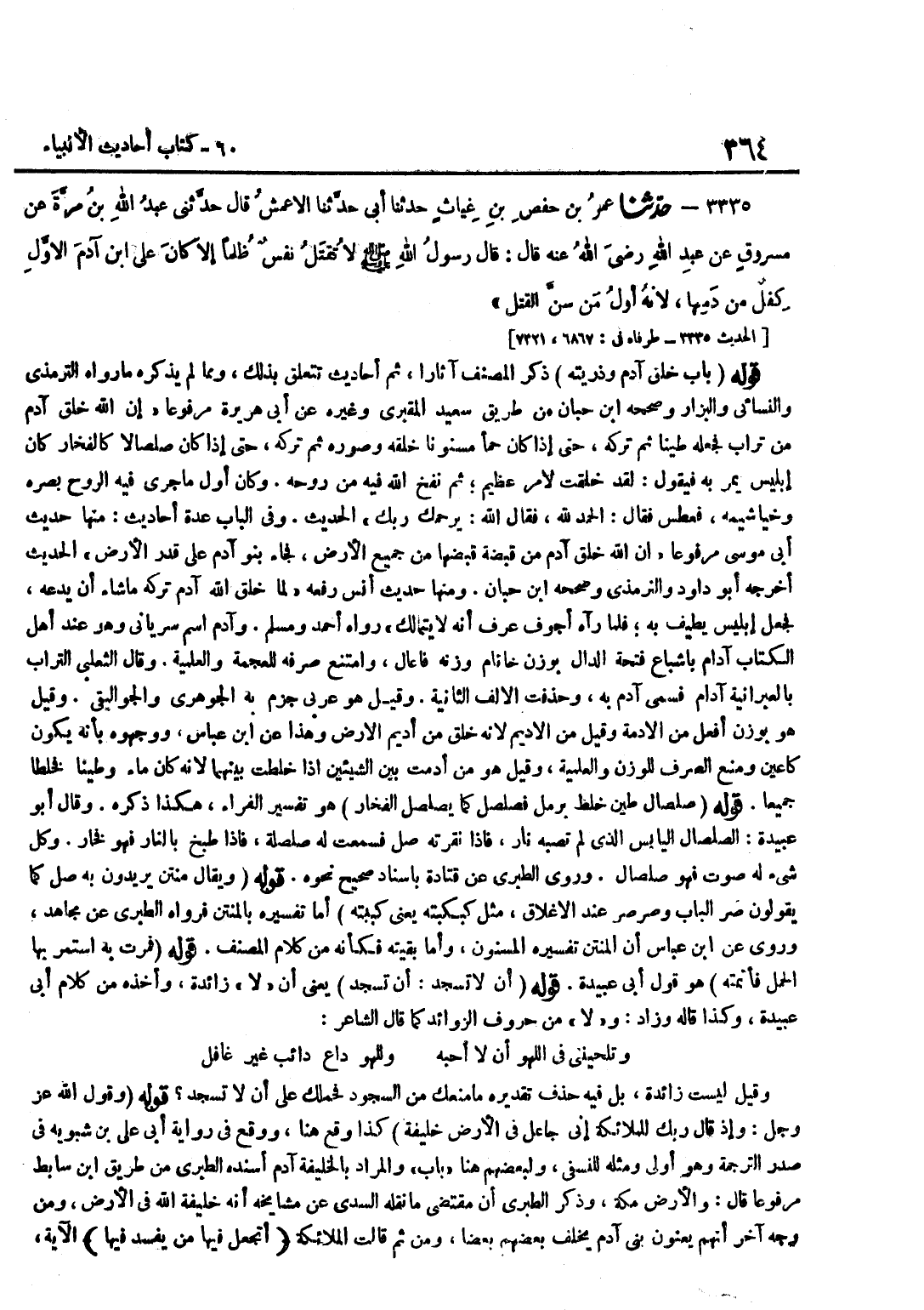 ذَكَرَ الْمُصَنِّفُ آثَارًا ثُمَّ أَحَادِيثَ تَتَعَلَّقُ بِذَلِكَ وَمِمَّا لَمْ يَذْكُرْهُ مَا رَوَاهُ التِّرْمِذِيُّ وَالنَّسَائِيُّ وَالْبَزَّارُ وَصَحَّحَهُ بن حِبَّانَ مِنْ طَرِيقِ سَعِيدٍ الْمَقْبُرِيِّ وَغَيْرِهِ عَنْ أَبِي هُرَيْرَةَ مَرْفُوعًا إِنَّ اللَّهَ خَلَقَ آدَمَ مِنْ تُرَابٍ فَجَعَلَهُ طِينًا ثُمَّ تَرَكَهُ حَتَّى إِذَا كَانَ حَمَأً مَسْنُونًا خَلَقَهُ وَصَوَّرَهُ ثُمَّ تَرَكَهُ حَتَّى إِذَا كَانَ صَلْصَالًا كَالْفَخَّارِ كَانَ إِبْلِيسُ يَمُرُّ بِهِ فَيَقُولُ لَقَدْ خُلِقْتَ لِأَمْرٍ عَظِيمٍ ثُمَّ نَفَخَ اللَّهُ فِيهِ مِنْ رُوحِهِ وَكَانَ أَوَّلُ مَا جَرَى فِيهِ الرُّوحَ بَصَرَهُ وَخَيَاشِيمَهُ فَعَطَسَ فَقَالَ الْحَمْدُ لِلَّهِ فَقَالَ اللَّهُ يَرْحَمُكَ رَبُّكَ الْحَدِيثَ وَفِي الْبَابِ عِدَّةُ أَحَادِيثَ مِنْهَا حَدِيثُ أَبِي مُوسَى مَرْفُوعًا إِنَّ اللَّهَ خَلَقَ آدَمَ مِنْ قَبْضَةٍ قَبَضَهَا مِنْ جَمِيعِ الْأَرْضِ فَجَاءَ بَنُو آدَمَ عَلَى قَدْرِ الْأَرْضِ الحَدِيث أخرجه أَبُو دَاوُد وَالتِّرْمِذِيّ وَصَححهُ بن حِبَّانَ وَمِنْهَا حَدِيثُ أَنَسٍ رَفَعَهُ لَمَّا خَلَقَ اللَّهُ آدَمَ تَرَكَهُ مَا شَاءَ أَنْ يَدَعَهُ فَجَعَلَ إِبْلِيسُ يَطِيفُ بِهِ فَلَمَّا رَآهُ أَجْوَفَ عَرَفَ أَنَّهُ لَا يَتَمَالَكُ رَوَاهُ أَحْمَدُ وَمُسْلِمٌ وَآدَمُ اسْمٌ سُرْيَانِيٌّ وَهُوَ عِنْدَ أَهْلِ الْكِتَابِ آدَامُ بِإِشْبَاعِ فَتْحَةِ الدَّالِ بِوَزْنِ خَانَامَ وَزْنُهُ فَاعَالُ وَامْتَنَعَ صَرْفُهُ لِلْعُجْمَةِ وَالْعَلَمِيَّةِ وَقَالَ الثَّعْلَبِيُّ التُّرَابُ بِالْعِبْرَانِيَّةِ آدَامُ فَسُمِّيَ آدَمُ بِهِ وَحُذِفَتِ الْأَلِفُ الثَّانِيَةُ وَقِيلَ هُوَ عَرَبِيٌّ جَزَمَ بِهِ الْجَوْهَرِيُّ وَالْجَوَالِيقِيُّ وَقِيلَ هُوَ بِوَزْنِ أَفْعَلَ مِنَ الْأَدْمَةِ وَقِيلَ مِنَ الْأَدِيمِ لِأَنَّهُ خُلِقَ مِنْ أَدِيم الأَرْض وَهَذَا عَن بن عَبَّاس ووجهوه بِأَنَّهُ يَكُونَ كَأَعْيَنَ وَمَنْعُ الصَّرْفِ لِلْوَزْنِ وَالْعَلَمِيَّةِ وَقِيلَ هُوَ مِنْ أَدَمْتُ بَيْنَ الشَّيْئَيْنِ إِذَا خَلَطْتُ بَيْنَهُمَا لِأَنَّهُ كَانَ مَاءً وَطِينًا فَخُلِطَا جَمِيعًا قَوْلُهُ صَلْصَالٌ طِينٌ خُلِطَ بِرَمْلٍ فَصَلْصَلَ كَمَا يُصَلْصِلُ الْفَخَّارُ هُوَ تَفْسِيرُ الْفَرَّاءِ هَكَذَا ذَكَرَهُ وَقَالَ أَبُو عُبَيْدَةَ الصَّلْصَالُ الْيَابِسُ الَّذِي لَمْ تُصِبْهُ نَارٌ فَإِذَا نَقَرْتَهُ صَلَّ فَسُمِعَتْ لَهُ صَلْصَلَةٌ فَإِذَا طُبِخَ بِالنَّارِ فَهُوَ فَخَّارٌ وَكُلُّ شَيْءٍ لَهُ صَوْتٌ فَهُوَ صَلْصَالٌ وَرَوَى الطَّبَرِيُّ عَنْ قَتَادَةَ بِإِسْنَادٍ صَحِيحٍ نَحْوَهُ قَوْلُهُ وَيُقَالُ مُنْتِنٌ يُرِيدُونَ بِهِ صَلَّ كَمَا يَقُولُونَ صَرَّ الْبَابُ وَصَرْصَرَ عِنْدَ الْإِغْلَاقِ مِثْلَ كَبْكَبْتُهُ يَعْنِي كَبَبْتُهُ أَمَّا تَفْسِيرُهُ بِالْمُنْتِنِ فَرَوَاهُ الطَّبَرِيُّ عَنْ مُجَاهِد وروى عَن بن عَبَّاسٍ أَنَّ الْمُنْتِنَ تَفْسِيرُهُ الْمَسْنُونُ وَأَمَّا بَقِيَّتُهُ فَكَأَنَّهُ مِنْ كَلَامِ الْمُصَنِّفِ قَوْلُهُ فَمَرَّتْ بِهِ اسْتَمَرَّ بِهَا الْحَمْلُ فَأَتَمَّتْهُ هُوَ قَوْلُ أَبِي عُبَيْدَةَ قَوْلُهُ أَنْ لَا تَسْجُدَ أَنْ تَسْجُدَ يَعْنِي أَنَّ لَا زَائِدَةٌ وَأَخَذَهُ مِنْ كَلَامِ أبي عُبَيْدَة وَكَذَا قَالَه وَزَاد وَلَا مِنْ حُرُوفِ الزَّوَائِدِ كَمَا قَالَ الشَّاعِرُ وَتُلِحِّينَنِي فِي اللَّهْوِ أَنْ لَا أُحِبَّهُ وَلِلَّهْوِ دَاعٍ دَائِبٌ غَيْرُ غَافِلِ وَقِيلَ لَيْسَتْ زَائِدَةٌ بَلْ فِيهِ حَذْفٌ تَقْدِيرُهُ مَا مَنَعَكَ مِنَ السُّجُودِ فَحَمَلَكَ عَلَى أَنْ لَا تَسْجُدَ قَوْلُهُ وَقَوْلُ اللَّهِ عَزَّ وَجَلَّ وَإِذْ قَالَ رَبُّكَ لِلْمَلَائِكَة