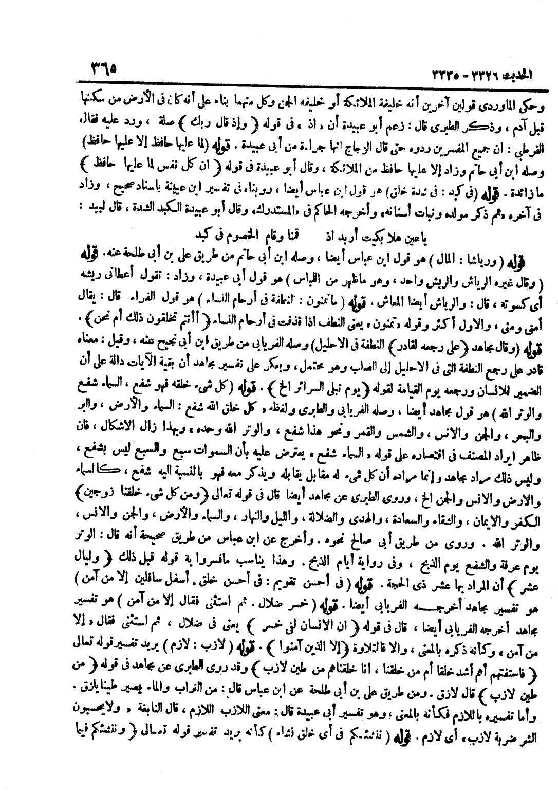 وَحَكَى الْمَاوَرْدِيُّ قَوْلَيْنِ آخَرَيْنِ أَنَّهُ خَلِيفَةُ الْمَلَائِكَةِ أَوْ خَلِيفَةُ الْجِنِّ وَكُلٌّ مِنْهُمَا بِنَاءٌ عَلَى أَنَّهُ كَانَ فِي الْأَرْضِ مَنْ سَكَنَهَا قَبْلَ آدَمَ وَذَكَرَ الطَّبَرِيُّ قَالَ زَعَمَ أَبُو عُبَيْدَةَ أَنَّ إِذْ فِي قَوْلِهِ وَإِذْ قَالَ رَبُّكَ صِلَةٌ وَرُدَّ عَلَيْهِ فَقَالَ الْقُرْطُبِيُّ إِنَّ جَمِيعَ الْمُفَسّرين ردُّوهُ حَتَّى قَالَ الزّجاج أَنَّهَا جَرَاءَة مِنْ أَبِي عُبَيْدَةَ قَوْلُهُ لَمَّا عَلَيْهَا حَافِظٌ الا عَلَيْهَا حَافظ وَصله بن أَبِي حَاتِمٍ وَزَادَ إِلَّا عَلَيْهَا حَافِظٌ مِنَ الْمَلَائِكَةِ وَقَالَ أَبُو عُبَيْدَةَ فِي قَوْلِهِ إِنْ كل نفس لما عَلَيْهَا حَافظ مَا زَائِدَة قَوْله فِي كبد فِي شدَّة خلق هُوَ قَول بن عَبَّاس أَيْضا روينَاهُ فِي تَفْسِير بن عُيَيْنَةَ بِإِسْنَادٍ صَحِيحٍ وَزَادَ فِي آخِرِهِ ثُمَّ ذَكَرَ مَوْلِدَهُ وَنَبَاتَ أَسْنَانِهِ وَأَخْرَجَهُ الْحَاكِمُ فِي الْمُسْتَدْرَكِ وَقَالَ أَبُو عُبَيْدَةَ الْكَبَدُ الشِّدَّةُ قَالَ لَبِيدٌ يَا عَيْنُ هَلَّا بَكَيْتِ أَرْبَدَ إِذْ قُمْنَا وَقَامَ الْخُصُومُ فِي كَبَدِ قَوْلُهُ وَرِيَاشًا المَال هُوَ قَول بن عَبَّاس أَيْضا وَصله بن أَبِي حَاتِمٍ مِنْ طَرِيقِ عَلِيِّ بْنِ أَبِي طَلْحَةَ عَنْهُ قَوْلُهُ وَقَالَ غَيْرُهُ الرِّيَاشُ وَالرِّيشُ وَاحِدٌ وَهُوَ مَا ظَهَرَ مِنَ اللِّبَاسِ هُوَ قَوْلُ أَبِي عُبَيْدَةَ وَزَادَ تَقُولُ أَعْطَانِي رِيشَهُ أَيْ كِسَوْتَهُ قَالَ وَالرِّيَاشُ أَيْضًا الْمَعَاشُ قَوْلُهُ مَا تُمْنُونَ النُّطْفَةُ فِي أَرْحَامِ النِّسَاءِ هُوَ قَوْلُ الْفَرَّاءِ قَالَ يُقَالُ أَمْنَى وَمَنَى وَالْأَوَّلُ أَكْثَرُ وَقَوْلُهُ تُمْنُونَ يَعْنِي النُّطَفَ إِذَا قُذِفَتْ فِي أَرْحَامِ النِّسَاءِ أَأَنْتُمْ تَخْلُقُونَ ذَلِكَ أَمْ نَحْنُ قَوْلُهُ وَقَالَ مُجَاهِدٌ عَلَى رَجْعِهِ لَقَادِرٌ النُّطْفَةُ فِي الْإِحْلِيلِ وَصَلَهُ الْفِرْيَابِيُّ مِنْ طَرِيقِ بن أَبِي نَجِيحٍ عَنْهُ وَقِيلَ مَعْنَاهُ قَادِرٌ عَلَى رَجْعِ النُّطْفَةِ الَّتِي فِي الْإِحْلِيلِ إِلَى الصُّلْبِ وَهُوَ مُحْتَمَلٌ وَيُعَكِّرُ عَلَى تَفْسِيرِ مُجَاهِدٍ أَنَّ بَقِيَّةَ الْآيَاتِ دَالَّةٌ عَلَى أَنَّ الضَّمِيرَ لِلْإِنْسَانِ وَرَجْعِهِ يَوْمَ الْقِيَامَةِ لِقَوْلِهِ يَوْمَ تُبْلَى السَّرَائِرُ إِلَخْ قَوْلُهُ كُلُّ شَيْءٍ خَلَقَهُ فَهُوَ شَفْعٌ السَّمَاءُ شَفْعٌ وَالْوِتْرُ اللَّهُ هُوَ قَوْلُ مُجَاهِدٍ أَيْضًا وَصَلَهُ الْفِرْيَابِيُّ وَالطَّبَرِيُّ وَلَفْظُهُ كُلُّ خَلْقِ اللَّهِ شَفْعٌ السَّمَاءُ وَالْأَرْضُ وَالْبَرُّ وَالْبَحْرُ وَالْجِنُّ وَالْإِنْسُ وَالشَّمْسُ وَالْقَمَرُ وَنَحْوُ هَذَا شَفْعٌ وَالْوِتْرُ اللَّهُ وَحْدَهُ وَبِهَذَا زَالَ الْإِشْكَالُ فَإِنَّ ظَاهِرَ إِيرَادِ الْمُصَنِّفِ فِي اقْتِصَارِهِ عَلَى قَوْلِهِ السَّمَاءُ شَفْعٌ يُعْتَرَضُ عَلَيْهِ بِأَنَّ السَّمَاوَاتِ سَبْعٌ وَالسَّبْعُ لَيْسَ بِشَفْعٍ وَلَيْسَ ذَلِكَ مُرَادُ مُجَاهِدٍ وَإِنَّمَا مُرَاده أَن كُلُّ شَيْءٍ لَهُ مُقَابِلٌ يُقَابِلُهُ وَيُذْكَرُ مَعَهُ فَهُوَ بِالنِّسْبَةِ إِلَيْهِ شَفْعٌ كَالسَّمَاءِ وَالْأَرْضِ وَالْإِنْسِ وَالْجِنِّ إِلَخْ وَرَوَى الطَّبَرِيُّ عَنْ مُجَاهِدٍ أَيْضًا قَالَ فِي قَوْلِهِ تَعَالَى وَمِنْ كُلِّ شَيْءٍ خلقنَا زَوْجَيْنِ الْكُفْرُ وَالْإِيمَانُ وَالشَّقَاءُ وَالسَّعَادَةُ وَالْهُدَى وَالضَّلَالَةُ وَاللَّيْلُ وَالنَّهَارُ وَالسَّمَاءُ وَالْأَرْضُ وَالْجِنُّ وَالْإِنْسُ وَالْوِتْرُ اللَّهُ وَرُوِيَ مِنْ طَرِيقِ أَبِي صَالِحٍ نَحْوَهُ وَأُخْرِجَ عَن بن عَبَّاسٍ مِنْ طَرِيقٍ صَحِيحَةٍ أَنَّهُ قَالَ الْوِتْرُ يَوْمُ عَرَفَةَ و