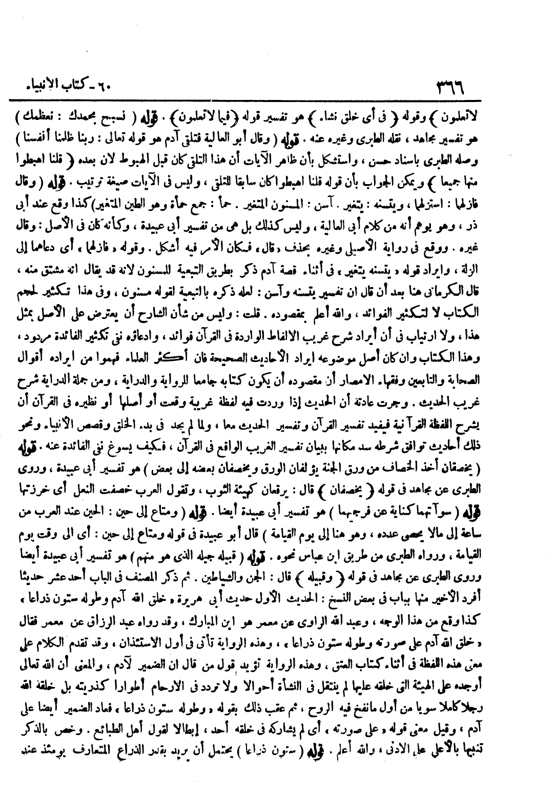 لَا تعلمُونَ وَقَوْلُهُ فِي أَيِّ خَلْقٍ نَشَاءُ هُوَ تَفْسِيرُ قَوْلِهِ فِيمَا لَا تَعْلَمُونَ قَوْلُهُ نُسَبِّحُ بِحَمْدِكَ نُعَظِّمُكَ هُوَ تَفْسِيرُ مُجَاهِدٍ نَقَلَهُ الطَّبَرِيُّ وَغَيْرُهُ عَنْهُ قَوْلُهُ وَقَالَ أَبُو الْعَالِيَةِ فَتَلَقَّى آدَمُ هُوَ قَوْله تَعَالَى رَبنَا ظلمنَا أَنْفُسنَا وَصَلَهُ الطَّبَرِيُّ بِإِسْنَادٍ حَسَنٍ وَاسْتُشْكِلَ بِأَنَّ ظَاهِرَ الْآيَاتِ أَنَّ هَذَا التَّلَقِّيَ كَانَ قَبْلَ الْهُبُوطِ لِأَن بعده قُلْنَا اهبطوا مِنْهَا جَمِيعًا وَيُمْكِنُ الْجَوَابُ بِأَنَّ قَوْلَهُ قُلْنَا اهْبِطُوا كَانَ سَابِقًا لِلتَّلَقِّي وَلَيْسَ فِي الْآيَاتِ صِيغَةُ تَرْتِيبٍ قَوْلُهُ وَقَالَ فَأَزَلَّهُمَا اسْتَزَلَّهُمَا وَيَتَسَنَّهْ يَتَغَيَّرُ آسِنٍ الْمَسْنُونُ الْمُتَغَيِّرُ حَمَأِ جَمْعُ حَمْأَةٍ وَهُوَ الطِّينُ الْمُتَغَيِّرُ كَذَا وَقَعَ عِنْدَ أَبِي ذَرٍّ وَهُوَ يُوهِمُ أَنَّهُ مِنْ كَلَامِ أَبِي الْعَالِيَةِ وَلَيْسَ كَذَلِكَ بَلْ هِيَ مِنْ تَفْسِيرِ أَبِي عُبَيْدَةَ وَكَأَنَّهُ كَانَ فِي الْأَصْلِ وَقَالَ غَيْرُهُ وَوَقَعَ فِي رِوَايَةِ الْأَصِيلِيِّ وَغَيْرِهِ بِحَذْفِ قَالَ فَكَأَنَّ الْأَمْرَ فِيهِ أَشْكَلُ وَقَوْلُهُ فَأَزَلَّهُمَا أَيْ دَعَاهُمَا إِلَى الزَّلَّةِ وَإِيرَادُ قَوْلِهِ يَتَسَنَّهْ يَتَغَيَّرُ فِي أَثْنَاءِ قِصَّةِ آدَمَ ذُكِرَ بِطَرِيقِ التَّبَعِيَّةِ لِلْمَسْنُونِ لِأَنَّهُ قَدْ يُقَالُ إِنَّهُ مُشْتَقٌّ مِنْهُ قَالَ الْكِرْمَانِيُّ هُنَا بَعْدَ أَنْ قَالَ إِنَّ تَفْسِيرَ يَتَسَنَّهْ وَآسِنٍ لَعَلَّهُ ذَكَرَهُ بِالتَّبَعِيَّةِ لِقَوْلِهِ مَسْنُونٍ وَفِي هَذَا تَكْثِيرٌ لِحَجْمِ الْكِتَابِ لَا لِتَكْثِيرِ الْفَوَائِدِ وَاللَّهُ أَعْلَمُ بِمَقْصُودِهِ قُلْتُ وَلَيْسَ مِنْ شَأْنِ الشَّارِحِ أَنْ يَعْتَرِضَ عَلَى الْأَصْلِ بِمِثْلِ هَذَا وَلَا ارْتِيَابَ فِي أَنَّ إِيرَادَ شَرْحِ غَرِيبِ الْأَلْفَاظِ الْوَارِدَةِ فِي الْقُرْآنِ فَوَائِدُ وَادِّعَاؤُهُ نفى تَكْثِير الْفَائِدَةِ مَرْدُودٌ وَهَذَا الْكِتَابُ وَإِنْ كَانَ أَصْلُ مَوْضُوعِهِ إِيرَادَ الْأَحَادِيثِ الصَّحِيحَةِ فَإِنَّ أَكْثَرَ الْعُلَمَاءِ فَهِمُوا مِنْ إِيرَادِهِ أَقْوَالَ الصَّحَابَةِ وَالتَّابِعِينَ وَفُقَهَاءِ الْأَمْصَارِ أَنَّ مَقْصُودَهُ أَنْ يَكُونَ كِتَابُهُ جَامِعًا لِلرِّوَايَةِ وَالدِّرَايَةِ وَمِنْ جُمْلَةِ الدِّرَايَةِ شَرْحُ غَرِيبِ الْحَدِيثِ وَجَرَتْ عَادَتُهُ أَنَّ الْحَدِيثَ إِذَا وَرَدَتْ فِيهِ لَفْظَةٌ غَرِيبَةٌ وَقَعَتْ أَوْ أَصْلُهَا أَوْ نَظِيرُهُ فِي الْقُرْآنِ أَنْ يَشْرَحَ اللَّفْظَةَ الْقُرْآنِيَّةَ فَيُفِيدُ تَفْسِيرَ الْقُرْآنِ وَتَفْسِيرَ الْحَدِيثِ مَعًا وَلَمَّا لَمْ يَجِدْ فِي بَدْءِ الْخَلْقِ وَقَصَصِ الْأَنْبِيَاءِ وَنَحْوِ ذَلِكَ أَحَادِيثَ تُوَافِقُ شَرْطَهُ سَدَّ مَكَانَهَا بِبَيَانِ تَفْسِيرِ الْغَرِيبِ الْوَاقِعِ فِي الْقُرْآنِ فَكَيْفَ يَسُوغُ نَفْيُ الْفَائِدَةِ عَنْهُ قَوْلُهُ يَخْصِفَانِ أَخَذَ الْخِصَافَ مِنْ وَرَقِ الْجَنَّةِ يُؤَلِّفَانِ الْوَرَقَ وَيَخْصِفَانِ بَعْضَهُ إِلَى بَعْضٍ هُوَ تَفْسِيرُ أَبِي عُبَيْدَةَ وَرَوَى الطَّبَرِيُّ عَنْ مُجَاهِدٍ فِي قَوْلِهِ يَخْصِفَانِ قَالَ يُرَقِّعَانِ كَهَيْئَةِ الثَّوْبِ وَتَقُولُ الْعَرَبُ خَصَفْتُ النَّعْلَ أَيْ خَرَزْتُهَا قَوْلُهُ سَوْآتِهِمَا كِنَايَةٌ عَنْ فَرْجَيْهِمَا هُوَ تَفْسِيرُ أَبِي عُبَيْدَةَ أَيْضًا قَوْلُهُ ومتاع إِلَى حِين الْحِينُ عِنْدَ الْعَرَبِ مِنْ سَاعَةٍ إِلَى مَا لَا يُحْصَى عَدَدُهُ وَهُوَ هُنَا إِلَى يَوْمِ الْقِيَامَةِ قَالَ أَبُو عُبَيْدَةَ فِي قَوْلِهِ وَمَتَاعٌ إِلَى حِين أَيْ إِلَى وَقْتِ يَوْ