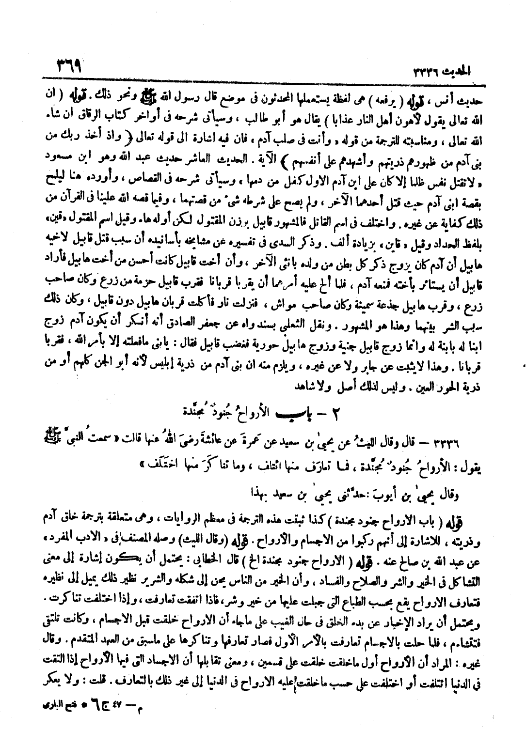 [3336] قَوْلُهُ وَقَالَ اللَّيْثُ وَصَلَهُ الْمُصَنِّفُ فِي الْأَدَبِ الْمُفْرَدِ عَنْ عَبْدِ اللَّهِ بْنِ صَالِحٍ عَنْهُ قَوْلُهُ الْأَرْوَاحُ جُنُودٌ مُجَنَّدَةٌ إِلَخْ قَالَ الْخَطَّابِيُّ يُحْتَمَلُ أَنْ يَكُونَ إِشَارَةً إِلَى مَعْنَى التَّشَاكُلِ فِي الْخَيْرِ وَالشَّرِّ وَالصَّلَاحِ وَالْفَسَادِ وَأَنَّ الْخَيِّرَ مِنَ النَّاسِ يَحِنُّ إِلَى شَكْلِهِ وَالشِّرِّيرَ نَظِيرُ ذَلِكَ يَمِيلُ إِلَى نَظِيرِهِ فَتَعَارُفُ الْأَرْوَاحِ يَقَعُ بِحَسَبِ الطِّبَاعِ الَّتِي جُبِلَتْ عَلَيْهَا مِنْ خَيْرٍ وَشَرٍّ فَإِذَا اتَّفَقَتْ تَعَارَفَتْ وَإِذَا اخْتَلَفَتْ تَنَاكَرَتْ وَيُحْتَمَلُ أَنْ يُرَادَ الْإِخْبَارُ عَنْ بَدْءِ الْخَلْقِ فِي حَالِ الْغَيْبِ عَلَى مَا جَاءَ أَنَّ الْأَرْوَاحَ خُلِقَتْ قَبْلَ الْأَجْسَامِ وَكَانَتْ تَلْتَقِي فَتَتَشَاءَمُ فَلَمَّا حَلَّتْ بِالْأَجْسَامِ تَعَارَفَتْ بِالْأَمْرِ الْأَوَّلِ فَصَارَ تَعَارُفُهَا وَتَنَاكُرُهَا عَلَى مَا سَبَقَ مِنَ الْعَهْدِ الْمُتَقَدِّمِ وَقَالَ غَيْرُهُ الْمُرَادُ أَنَّ الْأَرْوَاحَ أَوَّلُ مَا خُلِقَتْ خُلِقَتْ عَلَى قِسْمَيْنِ وَمَعْنَى تَقَابُلِهَا أَنَّ الْأَجْسَادَ الَّتِي فِيهَا الْأَرْوَاحُ إِذَا الْتَقَتْ فِي الدُّنْيَا ائْتَلَفَتْ أَوِ اخْتَلَفَتْ عَلَى حَسَبِ مَا خُلِقَتْ عَلَيْهِ الْأَرْوَاحُ فِي الدُّنْيَا إِلَى غَيْرِ ذَلِكَ بِالتَّعَارُفِ قُلْتُ وَلَا يُعَكر