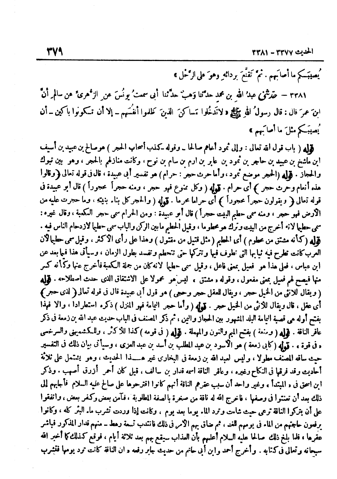 وَقَوله كذب أَصْحَاب الْحجر هُوَ صَالِحُ بْنُ عُبَيْدِ بْنِ أَسِيفِ بْنِ مَاشَخِ بْنِ عُبَيْدِ بْنِ حَاجِرِ بْنِ ثَمُودَ بْنِ عَامرِ بْنِ إِرَمَ بْنِ سَامِ بْنِ نُوحٍ وَكَانَتْ مَنَازِلُهُمْ بِالْحِجْرِ وَهُوَ بَيْنَ تَبُوكَ وَالْحِجَازِ قَوْلُهُ الْحِجْرُ مَوْضِعُ ثَمُودَ وَأَمَّا حَرْثٌ حِجْرٌ حَرَامٌ هُوَ تَفْسِيرُ أَبِي عُبَيْدَةَ قَالَ فِي قَوْلِهِ تَعَالَى وَقَالُوا هَذِهِ أَنْعَامٌ وحرث حجر أَيْ حَرَامٌ قَوْلُهُ وَكُلُّ مَمْنُوعٍ فَهُوَ حِجْرٌ وَمِنْهُ حِجْرًا مَحْجُورًا قَالَ أَبُو عُبَيْدَةَ فِي قَوْله تَعَالَى وَيَقُولُونَ حجرا مَحْجُورا أَيْ حَرَامًا مُحَرَّمًا قَوْلُهُ وَالْحِجْرُ كُلُّ بِنَاءٍ بنيته وَمَا حجرت عَلَيْهِ من الأَرْض فَهُوَ حِجْرٌ وَمِنْهُ سُمِّيَ حَطِيمُ الْبَيْتِ حِجْرًا قَالَ أَبُو عُبَيْدَةَ وَمِنَ الْحَرَامِ سُمِّيَ حِجْرُ الْكَعْبَةِ وَقَالَ غَيْرُهُ سُمِّيَ حُطَامًا لِأَنَّهُ أُخْرِجَ مِنَ الْبَيْتِ وَتُرِكَ هُوَ مَحْطُومًا وَقِيلَ الْحَطِيمُ مَا بَيْنَ الرُّكْنِ وَالْبَابِ سُمِّيَ حَطِيمًا لِازْدِحَامِ النَّاسِ فِيهِ قَوْلُهُ كَأَنَّهُ مُشْتَقٌّ مِنْ مَحْطُومٍ أَيِ الْحَطِيمَ مِثْلُ قَتِيلٍ مِنْ مَقْتُولٍ وَهَذَا عَلَى رَأْيِ الْأَكْثَرِ وَقِيلَ سُمِّيَ حَطِيمًا لِأَنَّ الْعَرَبَ كَانَتْ تَطْرَحُ فِيهِ ثِيَابَهَا الَّتِي تَطُوفُ فِيهَا وَتَتْرُكُهَا حَتَّى تَتَحَطَّمَ وَتَفْسُدَ بِطُولِ الزَّمَانِ وَسَيَأْتِي هَذَا فِيمَا بعد عَن بن عَبَّاسٍ فَعَلَى هَذَا هُوَ فَعِيلٌ بِمَعْنَى فَاعِلٍ وَقِيلَ سُمِّيَ حَطِيمًا لِأَنَّهُ كَانَ مِنْ جُمْلَةِ الْكَعْبَةِ فَأُخْرِجَ عَنْهَا وَكَأَنَّهُ كُسِرَ مِنْهَا فَيَصِحُّ لَهُمْ فَعِيلٌ بِمَعْنَى مَفْعُولٍ وَقَوْلُهُ مُشْتَقٌّ لَيْسَ هُوَ مَحْمُولًا عَلَى الِاشْتِقَاقِ الَّذِي حَدَثَ اصْطِلَاحُهُ قَوْلُهُ وَيُقَالُ لِلْأُنْثَى مِنَ الْخَيْلِ حِجْرٌ وَيُقَالُ لِلْعَقْلِ حجر وحجى هُوَ قَوْلُ أَبِي عُبَيْدَةَ قَالَ فِي قَوْلِهِ تَعَالَى لذِي حجر أَيْ عَقْلٍ قَالَ وَيُقَالُ لِلْأُنْثَى مِنَ الْخَيْلِ حِجْرٌ قَوْلُهُ وَأَمَّا حِجْرُ الْيَمَامَةِ فَهُوَ الْمَنْزِلُ ذَكَرَهُ اسْتِطْرَادًا وَإِلَّا فَهَذَا بِفَتْحِ أَوَّلِهِ هِيَ قَصَبَةُ الْيَمَامَةِ الْبَلَدُ الْمَشْهُورُ بَيْنَ الْحِجَازِ وَالْيَمَنِ ثُمَّ ذَكَرَ الْمُصَنِّفُ فِي الْبَابِ حَدِيثَ عَبْدِ اللَّهِ بْنِ زَمْعَةَ فِي ذِكْرِ عَاقِرِ النَّاقَةِ قَوْلُهُ وَمَنَعَةٍ بِفَتْحِ الْمِيمِ وَالنُّونِ وَالْمُهْمَلَةِ