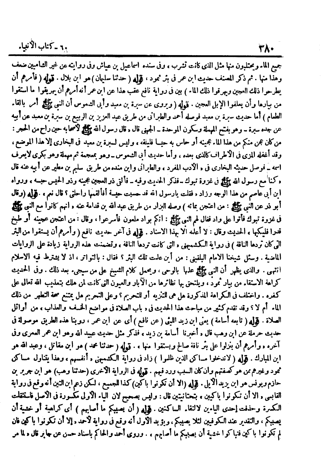 [3379] قَوْلُهُ فِي آخِرِ حَدِيثِ نَافِعٍ وَأَمَرَهُمْ أَنْ يَسْتَقُوا مِنَ الْبِئْرِ الَّتِي كَانَ تَرِدُهَا النَّاقَةُ فِي رِوَايَةِ الْكُشْمِيهَنِيِّ الَّتِي كَانَتْ تَرِدُهَا النَّاقَةُ وَتَضَمَّنَتْ هَذِهِ الرِّوَايَةُ زِيَادَةً عَلَى الرِّوَايَاتِ الْمَاضِيَةِ وَسُئِلَ شَيْخُنَا الْإِمَامُ الْبُلْقِينِيُّ مِنْ أَيْنَ عُلِمَتْ تِلْكَ الْبِئْرُ فَقَالَ بِالتَّوَاتُرِ إِذْ لَا يُشْتَرَطُ فِيهِ الْإِسْلَامُ انْتَهَى وَالَّذِي يَظْهَرُ أَنَّ النَّبِيَّ صَلَّى اللَّهُ عَلَيْهِ وَسَلَّمَ عَلِمَهَا بِالْوَحْيِ وَيُحْمَلُ كَلَامُ الشَّيْخِ عَلَى مَنْ سَيَجِيءُ بَعْدَ ذَلِكَ وَفِي الْحَدِيثِ كَرَاهَةُ الِاسْتِقَاءِ مِنْ بِيَارِ ثَمُودَ وَيَلْتَحِقُ بِهَا نَظَائِرُهَا مِنَ الْآبَارِ وَالْعُيُونِ الَّتِي كَانَتْ لِمَنْ هَلَكَ بِتَعْذِيبِ اللَّهِ تَعَالَى عَلَى كُفْرِهِ وَاخْتُلِفَ فِي الْكَرَاهَةِ الْمَذْكُورَةِ هَلْ هِيَ لِلتَّنْزِيهِ أَوْ لِلتَّحْرِيمِ وَعَلَى التَّحْرِيمِ هَلْ يَمْتَنِعُ صِحَّةُ التَّطَهُّرِ مِنْ ذَلِكَ الْمَاءِ أَمْ لَا وَقَدْ تَقَدَّمَ كَثِيرٌ مِنْ مَبَاحِثِ هَذَا الْحَدِيثِ فِي بَابِ الصَّلَاةِ فِي مَوَاضِعِ الْخَسْفِ وَالْعَذَابِ مِنْ أَوَائِلِ الصَّلَاةِ قَوْلُهُ تَابَعَهُ أُسَامَةُ يَعْنِي بن زيد اللَّيْثِيّ عَن نَافِع أَي عَن بن عُمَرَ رُوِينَا هَذِهِ الطَّرِيقَ مَوْصُولَةً فِي حَدِيثِ حَرْمَلَة عَن بن وَهْبٍ قَالَ أَخْبَرَنَا أُسَامَةُ بْنُ زَيْدٍ فَذَكَرَ مثل حَدِيث عبيد الله وَهُوَ بن عُمَرَ الْعُمَرِيُّ وَفِي آخِرِهِ وَأَمَرَهُمْ أَنْ يَنْزِلُوا عَلَى بِئْرِ نَاقَةِ صَالِحٍ وَيَسْتَقُوا مِنْهَا