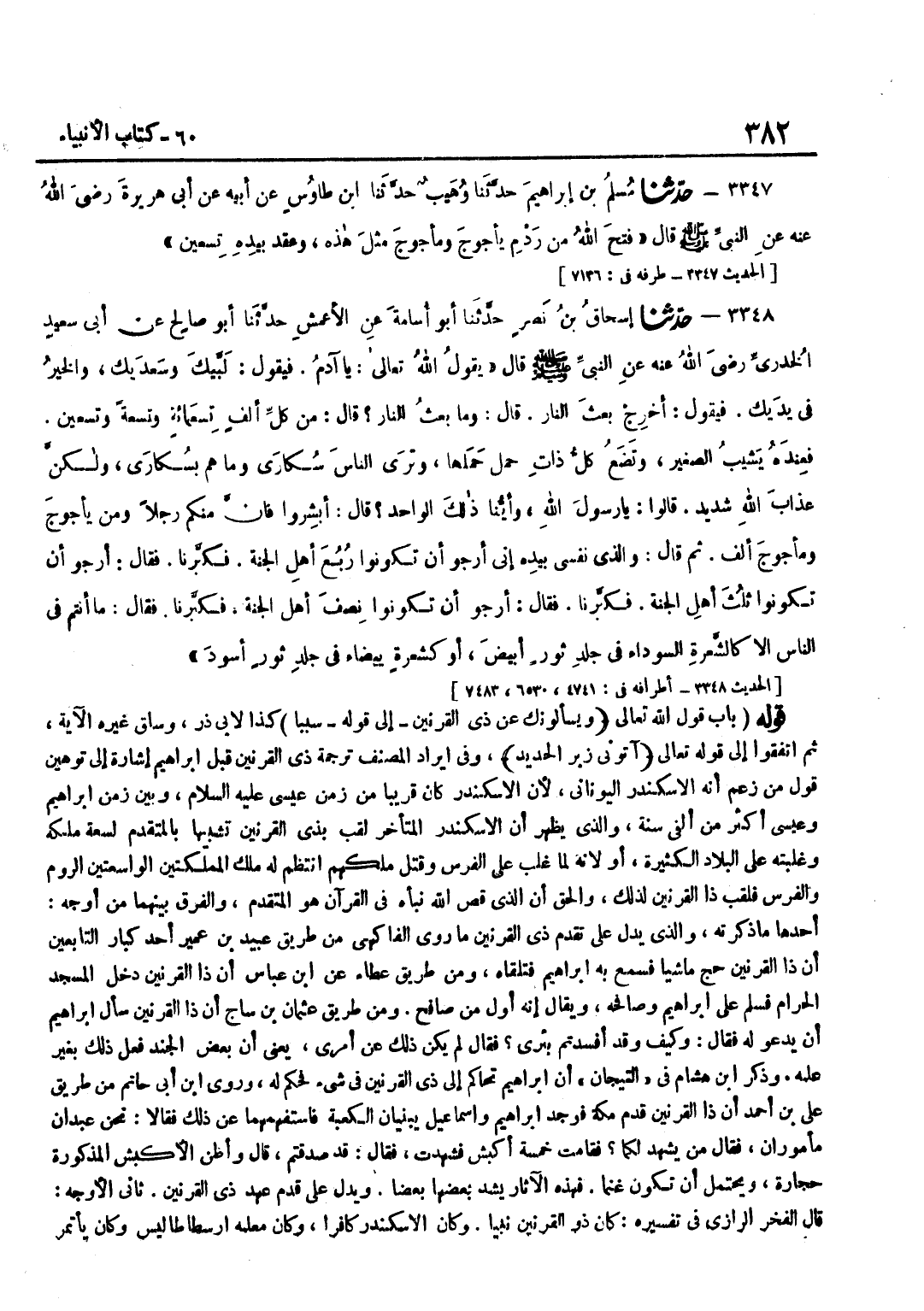 كَذَا لِأَبِي ذَرٍّ وَسَاقَ غَيْرُهُ الْآيَةَ ثُمَّ اتَّفَقُوا إِلَى قَوْلِهِ تَعَالَى آتوني زبر الْحَدِيد وَفِي إِيرَادِ الْمُصَنِّفِ تَرْجَمَةَ ذِي الْقَرْنَيْنِ قَبْلَ إِبْرَاهِيمَ إِشَارَةٌ إِلَى تَوْهِينِ قَوْلِ مَنْ زَعَمَ أَنَّهُ الْإِسْكَنْدَرُ الْيُونَانِيُّ لِأَنَّ الْإِسْكَنْدَرَ كَانَ قَرِيبًا مِنْ زَمَنِ عِيسَى عَلَيْهِ السَّلَامُ وَبَيْنَ زَمَنِ إِبْرَاهِيمَ وَعِيسَى أَكْثَرُ مِنْ أَلْفَيْ سَنَةٍ وَالَّذِي يَظْهَرُ أَنَّ الْإِسْكَنْدَرَ الْمُتَأَخِّرَ لُقِّبَ بِذِي الْقَرْنَيْنِ تَشْبِيهًا بِالْمُتَقَدِّمِ لِسَعَةِ مُلْكِهِ وَغَلَبَتِهِ عَلَى الْبِلَادِ الْكَثِيرَةِ أَوْ لِأَنَّهُ لَمَّا غَلَبَ عَلَى الْفُرْسِ وَقَتَلَ مَلِكَهُمِ انْتَظَمَ لَهُ مُلْكُ الْمَمْلَكَتَيْنِ الْوَاسِعَتَيْنِ الرُّومِ وَالْفُرْسِ فَلُقِّبَ ذَا الْقَرْنَيْنِ لِذَلِكَ وَالْحَقُّ أَنَّ الَّذِي قَصَّ اللَّهُ نَبَأَهُ فِي الْقُرْآنِ هُوَ الْمُتَقَدِّمُ وَالْفَرْقُ بَيْنَهُمَا مِنْ أَوْجُهٍ أَحَدُهَا مَا ذَكَرْتُهُ وَالَّذِي يَدُلُّ عَلَى تَقَدُّمِ ذِي الْقَرْنَيْنِ مَا رَوَى الْفَاكِهِيُّ مِنْ طَرِيقِ عُبَيْدِ بْنِ عُمَيْرٍ أَحَدِ كِبَارِ التَّابِعِينَ أَنَّ ذَا الْقَرْنَيْنِ حَجَّ مَاشِيًا فَسَمِعَ بِهِ إِبْرَاهِيمُ فَتَلَقَّاهُ وَمن طَرِيق عَطاء عَن بن عَبَّاسٍ أَنَّ ذَا الْقَرْنَيْنِ دَخَلَ الْمَسْجِدَ الْحَرَامَ فَسَلَّمَ عَلَى إِبْرَاهِيمَ وَصَافَحَهُ وَيُقَالُ إِنَّهُ أَوَّلُ مَنْ صَافَحَ وَمِنْ طَرِيقِ عُثْمَانَ بْنِ سَاجٍ أَنَّ ذَا الْقَرْنَيْنِ سَأَلَ إِبْرَاهِيمَ أَنْ يَدْعُوَ لَهُ فَقَالَ وَكَيْفَ وَقَدْ أَفْسَدْتُمْ بِئْرِي فَقَالَ لَمْ يَكُنْ ذَلِكَ عَنْ أَمْرِي يَعْنِي أَنَّ بَعْضَ الْجُنْدِ فَعَلَ ذَلِكَ بِغَيْرِ عِلْمِهِ وَذَكَرَ بن هِشَامٍ فِي التِّيجَانِ أَنَّ إِبْرَاهِيمَ تَحَاكَمَ إِلَى ذِي الْقَرْنَيْنِ فِي شَيْءٍ فَحَكَمَ لَهُ وَرَوَى بن أَبِي حَاتِمٍ مِنْ طَرِيقِ عَلِيِّ بْنِ أَحْمَدَ أَنَّ ذَا الْقَرْنَيْنِ قَدِمَ مَكَّةَ فَوَجَدَ إِبْرَاهِيمَ وَإِسْمَاعِيلَ يَبْنِيَانِ الْكَعْبَةَ فَاسْتَفْهَمَهُمَا عَنْ ذَلِكَ فَقَالَا نَحْنُ عَبْدَانِ مَأْمُورَانِ فَقَالَ مَنْ يَشْهَدُ لَكُمَا فَقَامَتْ خَمْسَةُ أَكْبُشٍ فَشَهِدَتْ فَقَالَ قَدْ صَدَقْتُمْ قَالَ وَأَظُنُّ الْأَكْبُشَ الْمَذْكُورَةَ حِجَارَةً وَيُحْتَمَلُ أَنْ تَكُونَ غَنَمًا فَهَذِهِ الْآثَارُ يَشُدُّ بَعْضُهَا بَعْضًا وَيَدُلُّ عَلَى قِدَمِ عَهْدِ ذِي الْقَرْنَيْنِ ثَانِيَ الْأَوْجُهِ قَالَ الْفَخْرُ الرَّازِيُّ فِي تَفْسِيرِهِ كَانَ ذُو الْقَرْنَيْنِ نَبِيًّا وَكَانَ الْإِسْكَنْدَرُ كَافِرًا وَكَانَ معلمه ارسطا طاليس وَكَانَ يأتمر