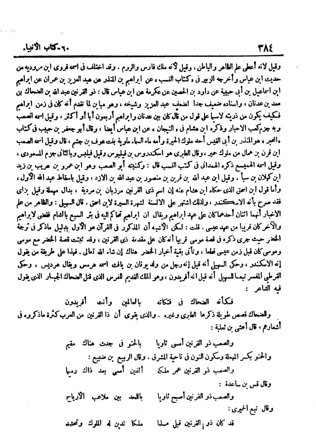 وَقِيلَ لِأَنَّهُ أُعْطِيَ عِلْمَ الظَّاهِرِ وَالْبَاطِنِ وَقِيلَ لِأَنَّهُ مَلَكَ فَارِسَ وَالرُّومِ وَقَدِ اخْتُلِفَ فِي اسْمه فروى بن مرْدَوَيْه من حَدِيث بن عَبَّاسٍ وَأَخْرَجَهُ الزُّبَيْرُ فِي كِتَابِ النَّسَبِ عَنْ إِبْرَاهِيم بن الْمُنْذر عَن عبد الْعَزِيز بن عِمْرَانَ عَنْ إِبْرَاهِيمَ بْنِ إِسْمَاعِيلَ بْنِ أَبِي حَبِيبَةَ عَنْ دَاوُدَ بْنِ الْحُصَيْنِ عَنْ عِكْرِمَةَ عَنِ بن عَبَّاسٍ قَالَ ذُو الْقَرْنَيْنِ عَبْدُ اللَّهِ بْنُ الضَّحَّاكِ بْنِ مَعْدِ بْنِ عَدْنَانَ وَإِسْنَادُهُ ضَعِيفٌ جِدًّا لِضَعْفِ عَبْدِ الْعَزِيزِ وَشَيْخِهِ وَهُوَ مُبَايِنٌ لِمَا تَقَدَّمَ أَنَّهُ كَانَ فِي زَمَنِ إِبْرَاهِيمَ فَكَيْفَ يَكُونُ مِنْ ذُرِّيَّتِهِ لَا سِيَّمَا عَلَى قَوْلِ مَنْ قَالَ كَانَ بَيْنَ عَدْنَانَ وَإِبْرَاهِيمَ أَرْبَعُونَ أَبًا أَوْ أَكْثَرَ وَقِيلَ اسْمُهُ الصَّعْبُ وَبِه جزم كَعْب الْأَحْبَار وَذكره بن هِشَام فِي التيجان عَن بن عَبَّاسٍ أَيْضًا وَقَالَ أَبُو جَعْفَرِ بْنُ حَبِيبٍ فِي كِتَابِ الْمُحَبَّرِ هُوَ الْمُنْذِرُ بْنُ أَبِي الْقَيْسِ أَحَدُ مُلُوكِ الْحِيرَةِ وَأُمُّهُ مَاءُ السَّمَاءِ مَاوِيَّةُ بِنْتُ عَوْفِ بْنِ جُشَمَ قَالَ وَقِيلَ اسْمُهُ الصَّعْبُ بْنُ قَرْنِ بْنِ هُمَّالٍ مِنْ مُلُوكِ حِمْيَرَ وَقَالَ الطَّبَرِيُّ هُوَ إِسْكَنْدَرُوسُ بْنُ فِيلْبُوسَ وَقِيلَ فِيلِبْسُ وَبِالثَّانِي جَزَمَ الْمَسْعُودِيُّ وَقِيلَ اسْمُهُ الْهَمَيْسَعُ ذَكَرَهُ الْهَمْدَانِيُّ فِي كُتُبِ النَّسَبِ قَالَ وكنيته أَبُو الصعب وَهُوَ بن عَمْرِو بْنِ عَرِيبِ بْنِ زَيْدِ بْنِ كَهْلَانَ بْنِ سبأ وَقيل بن عَبْدِ اللَّهِ بْنِ قَرِينِ بْنِ مَنْصُورِ بْنِ عَبْدِ اللَّهِ بْنِ الْأَزْدِ وَقِيلَ بِإِسْقَاطِ عَبْدِ الله الأول وَأما قَول بن إِسْحَاق الَّذِي حَكَاهُ بن هِشَامٍ عَنْهُ أَنَّ اسْمَ ذِي الْقَرْنَيْنِ مَرْزُبَانُ بْنُ مُرْدَيْهِ بِدَالٍ مُهْمَلَةٍ وَقِيلَ بِزَايٍ فَقَدْ صُرِّحَ بِأَنَّهُ الْإِسْكَنْدَرُ وَلِذَلِكَ اشْتُهِرَ عَلَى الْأَلْسِنَةِ لِشُهْرَةِ السِّيرَةِ لِابْنِ إِسْحَاقَ قَالَ السُّهَيْلِيُّ وَالظَّاهِرُ مِنْ عِلْمِ الْأَخْبَارِ أَنَّهُمَا اثْنَانِ أَحَدُهُمَا كَانَ عَلَى عَهْدِ إِبْرَاهِيمَ وَيُقَالُ إِنَّ إِبْرَاهِيمَ تَحَاكَمَ إِلَيْهِ فِي بِئْرِ السَّبُعِ بِالشَّامِ فَقَضَى لِإِبْرَاهِيمَ وَالْآخَرُ كَانَ قَرِيبًا مِنْ عَهْدِ عِيسَى قُلْتُ لَكِنَّ الْأَشْبَهَ أَنَّ الْمَذْكُورَ فِي الْقُرْآنِ هُوَ الْأَوَّلُ بِدَلِيلِ مَا ذُكِرَ فِي تَرْجَمَةِ الْخَضِرِ حَيْثُ جَرَى ذِكْرُهُ فِي قِصَّةِ مُوسَى قَرِيبًا أَنَّهُ كَانَ عَلَى مُقَدِّمَةِ ذِي الْقَرْنَيْنِ وَقَدْ ثَبَتَتْ قِصَّةُ الْخَضِرِ مَعَ مُوسَى وَمُوسَى كَانَ قَبْلَ زَمَنِ عِيسَى قَطْعًا وَتَأْتِي بَقِيَّةُ أَخْبَارِ الْخَضِرِ هُنَاكَ إِنْ شَاءَ اللَّهُ تَعَالَى فَهَذَا على طَريقَة مَنْ يَقُولُ إِنَّهُ الْإِسْكَنْدَرُ وَحَكَى السُّهَيْلِيُّ أَنَّهُ قِيلَ إِنَّهُ رَجُلٌ مِنْ وَلَدِ يُونَانَ بْنِ يَافِثَ اسْمُهُ هَرْمَسُ وَيُقَالُ هِرْدِيسُ وَحَكَى الْقُرْطُبِيُّ الْمُفَسِّرُ تَبَعًا لِلسُّهَيْلِيِّ أَنَّهُ قِيلَ إِنَّهُ أَفْرِيدُونُ وَهُوَ الْمَلِكُ الْقَدِيمُ لِلْفُرْسِ الَّذِي قَتَلَ الضَّحَّاكَ الْجَبَّارَ الَّذِي يَقُولُ فِيهِ الشَّاعِرُ فَكَأَنَّهُ الضَّحَّاكُ فِي فَتَكَاتِهِ بِالْعَالَمِينَ وَأَنْتَ أَفْرِيدُونُ وَلِلضَّحَّاكِ قِصَصٌ طَوِيلَةٌ ذَكَرَهَا الطَّبَرِيُّ وَغَيْرُهُ وَالَّذِي يُقَوِّي أَنَّ ذَا الْقَرْنَيْنِ مِنَ الْعَرَبِ كَثْرَةُ مَا ذَكَرُوهُ فِي أَشْعَارِهِمْ قَالَ أَعْشَى بْنُ ثَعْلَبَةَ وَالصَّعْبُ ذُو الْقَرْنَيْنِ أَمْسَى ثَاوِيًا بِالْحِنْوِ ف
