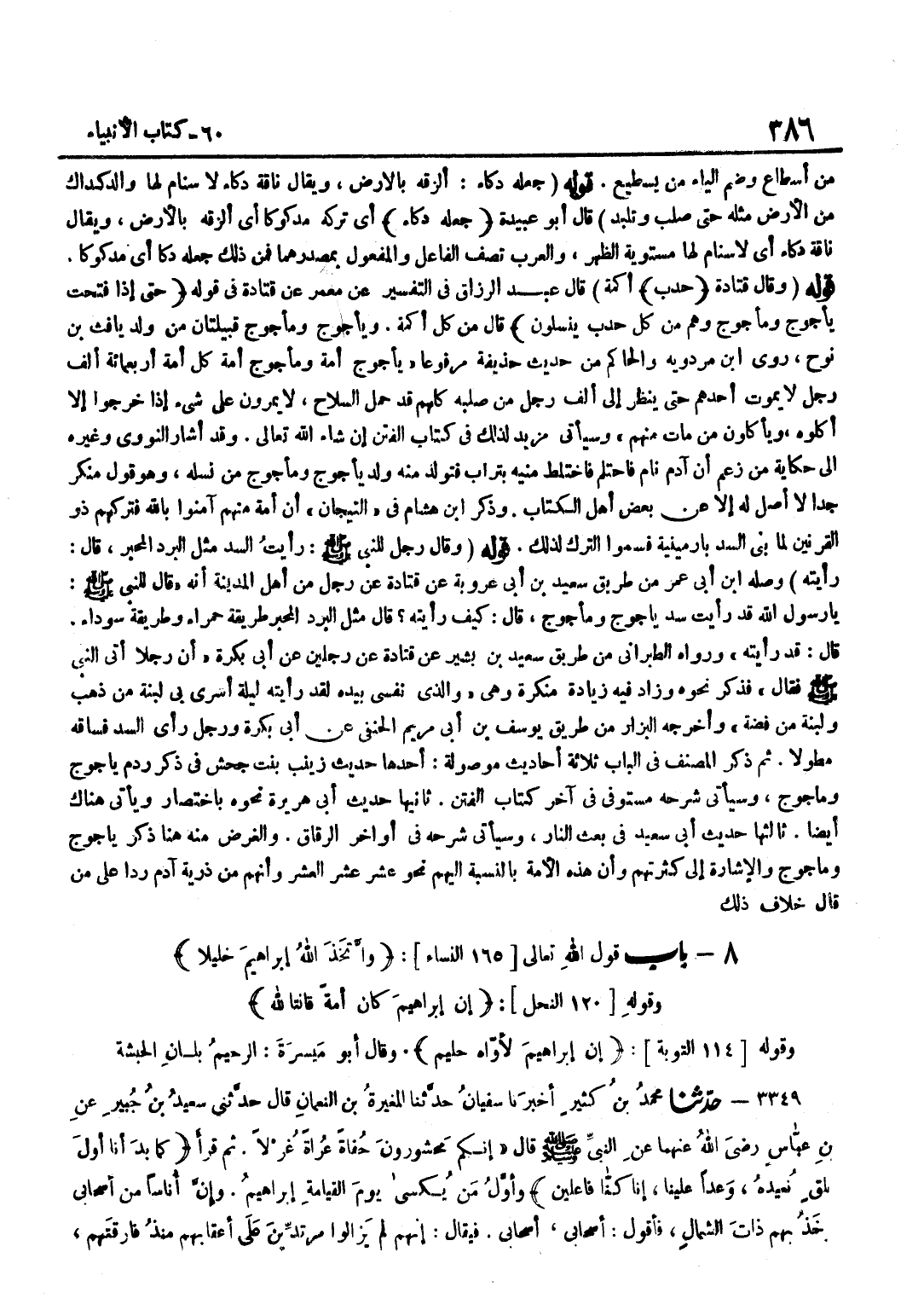 مِنْ أَسْطَاعَ وَضَمِّ الْيَاءِ مِنْ يَسْطِيعُ قَوْلُهُ جعله دكاء أَلْزَقَهُ بِالْأَرْضِ وَيُقَالُ نَاقَةٌ دَكَّاءُ لَا سَنَامَ لَهَا وَالدِّكْدَاكُ مِنَ الْأَرْضِ مِثْلُهُ حَتَّى صَلُبَ وَتَلَبَّدَ قَالَ أَبُو عُبَيْدَة جعله دكاء أَيْ تَرَكَهُ مَدْكُوكًا أَيْ أَلْزَقَهُ بِالْأَرْضِ وَيُقَالُ نَاقَةٌ دَكَّاءَ أَيْ لَا سَنَامَ لَهَا مُسْتَوِيَةُ الظَّهْرِ وَالْعَرَبُ تَصِفُ الْفَاعِلَ وَالْمَفْعُولَ بِمَصْدَرِهِمَا فَمِنْ ذَلِكَ جَعَلَهُ دَكًّا أَيْ مَدْكُوكًا قَوْلُهُ وَقَالَ قَتَادَةُ حَدَبٌ أَكَمَةٌ قَالَ عَبْدُ الرَّزَّاقِ فِي التَّفْسِيرِ عَنْ مَعْمَرٍ عَنْ قَتَادَةَ فِي قَوْلِهِ حَتَّى إِذَا فُتِحَتْ يَأْجُوجُ وَمَأْجُوجُ وَهُمْ مِنْ كل حدب يَنْسلونَ قَالَ مِنْ كُلِّ أَكَمَةٍ وَيَأْجُوجُ وَمَأْجُوجُ قَبِيلَتَانِ من ولد يافث بن نوح روى بن مَرْدُوَيْهِ وَالْحَاكِمُ مِنْ حَدِيثِ حُذَيْفَةَ مَرْفُوعًا يَأْجُوجُ أُمَّةٌ وَمَأْجُوجُ أُمَّةٌ كُلُّ أُمَّةٍ أَرْبَعُمِائَةِ أَلْفِ رَجُلٍ لَا يَمُوتُ أَحَدُهُمْ حَتَّى يَنْظُرَ إِلَى أَلْفِ رَجُلٍ مِنْ صُلْبِهِ كُلُّهُمْ قَدْ حَمَلَ السِّلَاحَ لَا يَمُرُّونَ عَلَى شَيْءٍ إِذَا خَرَجُوا إِلَّا أَكَلُوهُ وَيَأْكُلُونَ مَنْ مَاتَ مِنْهُمْ وَسَيَأْتِي مَزِيدٌ لِذَلِكَ فِي كِتَابِ الْفِتَنِ إِنْ شَاءَ اللَّهُ تَعَالَى وَقَدْ أَشَارَ النَّوَوِيُّ وَغَيْرُهُ إِلَى حِكَايَةِ مَنْ زَعَمَ أَنَّ آدَمَ نَامَ فَاحْتَلَمَ فَاخْتَلَطَ مَنِيُّهُ بِتُرَابٍ فَتَوَلَّدَ مِنْهُ وَلَدٌ يَأْجُوجُ وَمَأْجُوجُ مِنْ نَسْلِهِ وَهُوَ قَوْلٌ مُنْكَرٌ جِدًّا لَا أَصْلَ لَهُ إِلَّا عَنْ بَعْضِ أَهْلِ الْكتاب وَذكر بن هِشَامٍ فِي التِّيجَانِ أَنَّ أُمَّةً مِنْهُمْ آمَنُوا بِاللَّهِ فَتَرَكَهُمْ ذُو الْقَرْنَيْنِ لَمَّا بَنَى السَّدَّ بِأَرْمِينِيَّةَ فَسُمُّوا التُّرْكَ لِذَلِكَ قَوْلُهُ وَقَالَ رَجُلٌ لِلنَّبِيِّ صَلَّى اللَّهُ عَلَيْهِ وَسَلَّمَ رَأَيْتَ السَّدَّ مثل الْبرد المحبر قَالَ رَأَيْته وَصله بن أَبِي عُمَرَ مِنْ طَرِيقِ سَعِيدِ بْنِ أَبِي عَرُوبَةَ عَنْ قَتَادَةَ عَنْ رَجُلٍ مِنْ أَهْلِ الْمَدِينَةِ أَنَّهُ قَالَ لِلنَّبِيِّ صَلَّى اللَّهُ عَلَيْهِ وَسَلَّمَ يَا رَسُولَ اللَّهِ قَدْ رَأَيْتَ سَدَّ يَأْجُوجَ وَمَأْجُوجَ قَالَ كَيْفَ رَأَيْتَهُ قَالَ مِثْلَ الْبُرْدِ الْمُحَبَّرِ طَرِيقَةٌ حَمْرَاءُ وَطَرِيقَةٌ سَوْدَاءُ قَالَ قد رَأَيْته وَرَوَاهُ الطَّبَرَانِيِّ مِنْ طَرِيقِ سَعِيدِ بْنِ بَشِيرٍ عَنْ قَتَادَةَ عَنْ رَجُلَيْنِ عَنْ أَبِي بَكْرَةَ أَنَّ رَجُلًا أَتَى النَّبِيَّ صَلَّى اللَّهُ عَلَيْهِ وَسَلَّمَ فَقَالَ فَذَكَرَ نَحْوَهُ وَزَادَ فِيهِ زِيَادَةً مُنْكَرَةً وَهِيَ وَالَّذِي نَفْسِي بِيَدِهِ لَقَدْ رَأَيْتُهُ لَيْلَةَ أُسْرِيَ بِي لَبِنَةً مِنْ ذَهَبٍ وَلَبِنَةً مِنْ فِضَّةٍ وَأَخْرَجَهُ الْبَزَّارُ مِنْ طَرِيقِ يُوسُفَ بْنِ أَبِي مَرْيَمَ الْحَنَفِيِّ عَنْ أَبِي بَكْرَةَ وَرَجُلٌ رَأَى السَّدَّ فَسَاقَهُ مُطَوَّلًا ثُمَّ ذَكَرَ الْمُصَنِّفُ فِي الْبَابِ ثَلَاثَةَ أَحَادِيثَ مَوْصُولَةً أَحَدُهَا حَدِيثُ زَيْنَبَ بِنْتِ جَحْشٍ فِي ذِكْرِ رَدْمِ يَأْجُوجَ وَمَأْجُوجَ وَسَيَأْتِي شَرْحُهُ مُسْتَوْفًى فِي آخِرِ كِتَابِ الْفِتَنِ ثَانِيهَا حَدِيثُ أَبِي هُرَيْرَةَ نَحْوَهُ بِاخْتِصَارٍ وَيَأْتِي هُنَاكَ أَيْضًا ثَالِثُهَا حَدِيثُ أَبِي سَعِيدٍ فِي بَعْثِ النَّارِ وَسَيَأْتِي شَرْحُهُ فِي أَوَاخِرِ الرِّقَاقِ وَالْغَرَضُ مِنْهُ هُنَا ذِكْرُ يَأْجُوجَ وَمَأْجُوجَ وَالْإِشَارَةُ إِلَى كَثْرَتِهِمْ وَأَنَّ هَذِهِ الْأُمَّةَ بِالنِّسْبَةِ إِلَيْهِمْ نَحْوُ عُشْرِ عُشْرِ الْعُشْرِ وَأَنَّهُمْ مِنْ ذُرِّيَّةِ آد