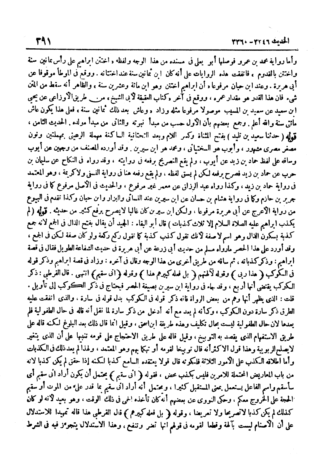 [3357] قَوْلُهُ حَدَّثَنَا سَعِيدُ بْنُ تَلِيدٍ بِفَتْحِ الْمُثَنَّاةِ وَكَسْرِ اللَّامِ وَبَعْدَ التَّحْتَانِيَّةِ السَّاكِنَةِ مُهْمَلَةٌ الرُّعَيْنِيُّ بِمُهْمَلَتَيْنِ وَنُونٍ مُصَغَّرٌ مِصْرِيٌّ مَشْهُورٌ وَأَيُّوبُ هُوَ السّخْتِيَانِيّ وَمُحَمّد هُوَ بن سِيرِينَ وَقَدْ أَوْرَدَهُ الْمُصَنِّفُ مِنْ وَجْهَيْنِ عَنْ أَيُّوبَ وَسَاقَهُ عَلَى لَفْظِ حَمَّادِ بْنِ زَيْدٍ عَنْ أَيُّوبَ وَلَمْ يَقَعِ التَّصْرِيحُ بِرَفْعِهِ فِي رِوَايَتِهِ وَقَدْ رَوَاهُ فِي النِّكَاحِ عَنْ سُلَيْمَانَ بْنِ حَرْبٍ عَنْ حَمَّادِ بْنِ زَيْدٍ فَصَرَّحَ بِرَفْعِهِ لَكِنْ لَمْ يَسُقْ لَفْظَهُ وَلَمْ يَقَعْ رَفْعُهُ هُنَا فِي رِوَايَةِ النَّسَفِيِّ وَلَا كَرِيمَةَ وَهُوَ الْمُعْتَمَدُ فِي رِوَايَةِ حَمَّادِ بْنِ زَيْدٍ وَكَذَا رَوَاهُ عَبْدُ الرَّزَّاقِ عَنْ مَعْمَرٍ غَيْرَ مَرْفُوعٍ وَالْحَدِيثُ فِي الْأَصْلِ مَرْفُوعٌ كَمَا فِي رِوَايَةِ جَرِيرِ بْنِ حَازِمٍ وَكَمَا فِي رِوَايَةِ هِشَام بن حسان عَن بن سِيرِين عِنْد النَّسَائِيّ وَالْبَزَّار وبن حِبَّانَ وَكَذَا تَقَدَّمَ فِي الْبُيُوعِ مِنْ رِوَايَةِ الْأَعْرَج عَن أبي هُرَيْرَة مَرْفُوعا وَلَكِن بن سِيرِينَ كَانَ غَالِبًا لَا يُصَرِّحُ بِرَفْعِ كَثِيرٍ مِنْ حَدِيثِهِ قَوْلُهُ لَمْ يَكْذِبْ إِبْرَاهِيمُ عَلَيْهِ الصَّلَاةُ وَالسَّلَامُ إِلَّا ثَلَاثَ كَذَبَاتٍ قَالَ أَبُو الْبَقَاءِ الْجَيِّدُ أَنْ يُقَالَ بِفَتْحِ الذَّالِ فِي الْجَمْعِ لِأَنَّهُ جَمْعُ كَذْبَةٍ بِسُكُونِ الذَّالِ وَهُوَ اسْمٌ لَا صِفَةٌ لِأَنَّكَ تَقُولُ كَذَبَ كَذْبَةً كَمَا تَقُولُ رَكَعَ رَكْعَةً وَلَوْ كَانَ صِفَةً لَكِن فِي الْجَمْعِ وَقَدْ أَوْرَدَ عَلَى هَذَا الْحَصْرِ مَا رَوَاهُ مُسْلِمٌ مِنْ حَدِيثِ أَبِي زُرْعَةَ عَنْ أَبِي هُرَيْرَةَ فِي حَدِيثِ الشَّفَاعَةِ الطَّوِيلِ فَقَالَ فِي قِصَّةِ إِبْرَاهِيمَ وَذَكَرَ كَذَبَاتِهِ ثُمَّ سَاقَهُ مِنْ طَرِيقٍ أُخْرَى مِنْ هَذَا الْوَجْهِ وَقَالَ فِي آخِرِهِ وَزَادَ فِي قِصَّةِ إِبْرَاهِيمَ وَذَكَرَ قَوْلَهُ فِي الْكَوْكَبِ هَذَا رَبِّي وَقَوْلُهُ لآلهتهم بل فعله كَبِيرهمْ هَذَا وَقَوْلُهُ إِنِّي سَقِيمٌ انْتَهَى قَالَ الْقُرْطُبِيُّ ذِكْرُ الْكَوْكَبِ يَقْتَضِي أَنَّهَا أَرْبَعٌ وَقَدْ جَاءَ فِي رِوَايَة بن سِيرِينَ بِصِيغَةِ الْحَصْرِ فَيَحْتَاجُ فِي ذِكْرِ الْكَوْكَبِ إِلَى تَأْوِيلٍ قُلْتُ الَّذِي يَظْهَرُ أَنَّهَا وَهْمٌ مِنْ بَعْضِ الرُّوَاةِ فَإِنَّهُ ذَكَرَ قَوْلَهُ فِي الْكَوْكَبِ بَدَلَ قَوْلِهِ فِي سَارَةَ وَالَّذِي اتَّفَقَتْ عَلَيْهِ الطُّرُقُ ذِكْرُ سَارَةَ دُونَ الْكَوْكَبِ وَكَأَنَّهُ لَمْ يُعَدَّ مَعَ أَنَّهُ أَدْخَلُ مِنْ ذِكْرِ سَارَةَ لِمَا نُقِلَ أَنَّهُ قَالَهُ فِي حَالِ الطُّفُولِيَّةِ فَلَمْ يَعُدَّهَا لِأَنَّ حَالَ الطُّفُولِيَّةِ لَيْسَتْ بِحَال تَكْلِيف وَهَذِه طَريقَة بن إِسْحَاقَ وَقِيلَ إِنَّمَا قَالَ ذَلِكَ بَعْدَ الْبُلُوغِ لَكِنَّهُ قَالَهُ عَلَى طَرِيقِ الِاسْتِفْهَامِ الَّذِي يُقْصَدُ بِهِ التَّوْبِيخُ وَقِيلَ قَالَهُ عَلَى طَرِيقِ الِاحْتِجَاجِ عَلَى قَوْمِهِ تَنْبِيهًا عَلَى أَنَّ الَّذِي يَتَغَيَّرُ لَا يَصْلُحُ لِلرُّبُوبِيَّةِ وَهَذَا قَوْلُ الْأَكْثَرِ إِنَّهُ قَالَ تَوْبِيخًا لِقَوْمِهِ أَوْ تَهَكُّمًا بِهِمْ وَهُوَ الْمُعْتَمَدُ وَلِهَذَا لَمْ يُعَدَّ ذَلِكَ فِي الْكَذَبَاتِ وَأَمَّا إِطْلَاقُهُ الْكَذِبَ عَلَى الْأُمُورِ الثَّلَاثَةِ فَلِكَوْنِهِ قَالَ قَوْلًا يَعْتَقِدُهُ السَّامِعُ كَذِبًا لَكِنَّهُ إِذَا حُقِّقَ لَمْ يَكُنْ كَذِبًا لِأَنَّهُ مِنْ بَابِ الْمَعَارِيضِ الْمُحْتَمِلَةِ لِلْأَمْرَيْنِ فَلَيْسَ بِكَذِبٍ مَحْضٍ فَقَوْلُهُ إِنِّي سَقِيمٌ