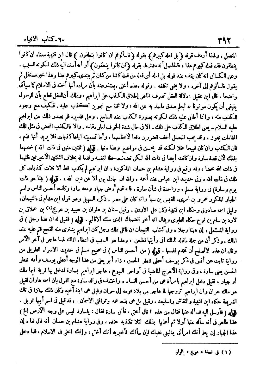 الْمُتَّصِلِ وَلِهَذَا أَرْدَفَ قَوْلَهُ بَلْ فَعَلَهُ كَبِيرُهُمْ بقوله فاسألوهم أَن كَانُوا ينطقون قَالَ بن قُتَيْبَةَ مَعْنَاهُ إِنْ كَانُوا يَنْطِقُونَ فَقَدْ فَعَلَهُ كَبِيرُهُمْ هَذَا فَالْحَاصِلُ أَنَّهُ مُشْتَرَطٌ بِقَوْلِهِ إِنْ كَانُوا ينطقون أَوْ أَنَّهُ أَسْنَدَ إِلَيْهِ ذَلِكَ لِكَوْنِهِ السَّبَبَ وَعَنِ الْكِسَائِيِّ أَنَّهُ كَانَ يَقِفُ عِنْدَ قَوْلِهِ بَلْ فَعَلَهُ أَيْ فَعَلَهُ مَنْ فَعَلَهُ كَائِنًا مَنْ كَانَ ثُمَّ يَبْتَدِئُ كَبِيرُهُمْ هَذَا وَهَذَا خَبَرٌ مُسْتَقِلٌّ ثُمَّ يَقُولُ فَاسْأَلُوهُمْ إِلَى آخِرِهِ وَلَا يَخْفَى تَكَلُّفُهُ وَقَوْلُهُ هَذِهِ أُخْتِي يُعْتَذَرُ عَنْهُ بِأَنَّ مُرَادَهُ أَنَّهَا أُخْتُهُ فِي الْإِسْلَامِ كَمَا سَيَأْتِي وَاضحا قَالَ بن عُقَيْلٍ دَلَالَةُ الْعَقْلِ تَصْرِفُ ظَاهِرَ إِطْلَاقِ الْكَذِبِ عَلَى إِبْرَاهِيمَ وَذَلِكَ أَنَّ الْعَقْلَ قَطَعَ بِأَنَّ الرَّسُولَ يَنْبَغِي أَنْ يَكُونَ مَوْثُوقًا بِهِ لِيُعْلَمَ صِدْقُ مَا جَاءَ بِهِ عَنِ اللَّهِ وَلَا ثِقَةَ مَعَ تَجْوِيزِ الْكَذِبِ عَلَيْهِ فَكَيْفَ مَعَ وجود الْكَذِب مِنْهُ وَإِنَّمَا أَطْلَقَ عَلَيْهِ ذَلِكَ لِكَوْنِهِ بِصُورَةِ الْكَذِبِ عِنْدَ السَّامِعِ وَعَلَى تَقْدِيرِهِ فَلَمْ يَصْدُرْ ذَلِكَ مِنْ إِبْرَاهِيمَ عَلَيْهِ السَّلَامُ يَعْنِي إِطْلَاقَ الْكَذِبِ عَلَى ذَلِكَ إِلَّا فِي حَالِ شِدَّةِ الْخَوْفِ لِعُلُوِّ مَقَامِهِ وَإِلَّا فَالْكَذِبُ الْمَحْضُ فِي مِثْلِ تِلْكَ الْمَقَامَاتِ يَجُوزُ وَقَدْ يَجِبُ لِتَحَمُّلِ أَخَفِّ الضَّرَرَيْنِ دَفْعًا لِأَعْظَمِهِمَا وَأَمَّا تَسْمِيَتُهُ إِيَّاهَا كَذَبَاتٍ فَلَا يُرِيدُ أَنَّهَا تُذَمُّ فَإِنَّ الْكَذِبَ وَإِنْ كَانَ قَبِيحًا مُخِلًّا لَكِنَّهُ قَدْ يَحْسُنُ فِي مَوَاضِعَ وَهَذَا مِنْهَا قَوْلُهُ ثِنْتَيْنِ مِنْهُنَّ فِي ذَاتِ اللَّهِ خَصَّهُمَا بِذَلِكَ لِأَنَّ قِصَّةَ سَارَةَ وَإِنْ كَانَتْ أَيْضًا فِي ذَاتِ اللَّهِ لَكِنْ تَضَمَّنَتْ حَظًّا لِنَفْسِهِ وَنَفْعًا لَهُ بِخِلَافِ الثِّنْتَيْنِ الْأَخِيرَتَيْنِ فَإِنَّهُمَا فِي ذَاتِ اللَّهِ مَحْضًا وَقَدْ وَقَعَ فِي رِوَايَةِ هِشَامِ بْنِ حَسَّانَ الْمَذْكُورَةِ إِنَّ إِبْرَاهِيمَ لَمْ يَكْذِبْ قَطُّ إِلَّا ثَلَاثَ كَذَبَاتٍ كُلُّ ذَلِكَ فِي ذَاتِ اللَّهِ وَفِي حَدِيثِ بن عَبَّاسٍ عِنْدَ أَحْمَدَ وَاللَّهِ إِنْ جَادَلَ بِهِنَّ إِلَّا عَنْ دِينِ اللَّهِ قَوْلُهُ بَيْنَا هُوَ ذَاتَ يَوْمٍ وَسَارَةُ فِي رِوَايَةِ مُسْلِمٍ وَوَاحِدَةٌ فِي شَأْنِ سَارَةَ فَإِنَّهُ قَدِمَ أَرْضَ جَبَّارٍ وَمَعَهُ سَارَةُ وَكَانَتْ أَحْسَنَ النَّاسِ وَاسْمُ الْجَبَّارِ الْمَذْكُورِ عَمْرُو بْنُ امْرِئِ الْقَيْسِ بْنِ سَبَإٍ وَإِنَّهُ كَانَ عَلَى مِصْرَ ذَكَرَهُ السُّهَيْلِيُّ وَهُوَ قَول بن هِشَامٍ فِي التِّيجَانِ وَقِيلَ اسْمُهُ صَادُوقٌ وَحَكَاهُ بن قُتَيْبَةَ وَكَانَ عَلَى الْأُرْدُنِ وَقِيلَ سِنَانُ بْنُ علوان بن عبيد بن عريج بْنِ عِمْلَاقَ بْنِ لَاوِدَ بْنِ سَامِ بْنِ نُوحٍ حَكَاهُ الطَّبَرِيُّ وَيُقَالُ إِنَّهُ أَخُو الضَّحَّاكِ الَّذِي مَلَكَ الْأَقَالِيمَ قَوْلُهُ فَقِيلَ لَهُ إِنَّ هَذَا رجل فِي رِوَايَة الْمُسْتَمْلِي إِن هَا هُنَا رَجُلًا وَفِي كِتَابِ التِّيجَانِ أَنَّ قَائِلَ ذَلِكَ رَجُلٌ كَانَ إِبْرَاهِيمُ يَشْتَرِي مِنْهُ الْقَمْحَ فَنَمَّ عَلَيْهِ عِنْدَ الْمَلِكِ وَذَكَرَ أَنَّ مِنْ جُمْلَةِ مَا قَالَهُ لِلْمَلِكِ إِنِّي رَأَيْتُهَا تَطْحَنُ وَهَذَا هُوَ السَّبَبُ فِي إِعْطَاءِ الْمَلِكِ لَهَا هَاجَرَ فِي آخِرِ الْأَمْرِ وَقَالَ إِنَّ هَذِهِ لَا تَصْلُحُ أَنْ تَخْدُمَ نَفْسَهَا قَوْلُهُ مِنْ أَحْسَنِ النَّاسِ فِي صَحِيحِ مُسْلِمٍ فِي ح