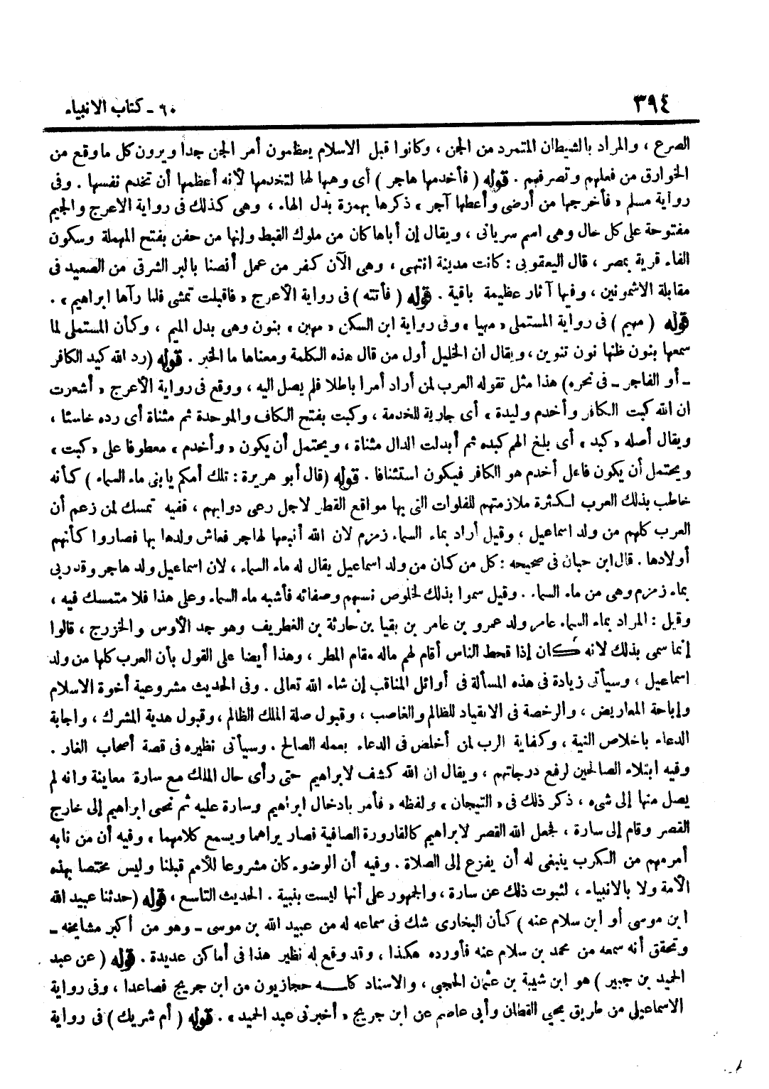 الصَّرَعِ وَالْمُرَادُ بِالشَّيْطَانِ الْمُتَمَرِّدُ مِنَ الْجِنِّ وَكَانُوا قَبْلَ الْإِسْلَامِ يُعَظِّمُونَ أَمْرَ الْجِنِّ جِدًّا وَيَرَوْنَ كُلَّ مَا وَقَعَ مِنَ الْخَوَارِقِ مِنْ فِعْلِهِمْ وَتَصَرُّفِهِمْ قَوْلُهُ فَأَخْدَمَهَا هَاجَرَ أَيْ وَهَبَهَا لَهَا لِتَخْدُمَهَا لِأَنَّهُ أَعْظَمَهَا أَنْ تَخْدِمَ نَفْسَهَا وَفِي رِوَايَةِ مُسْلِمٍ فَأَخْرِجْهَا مِنْ أَرْضِي وَأَعْطِهَا آجَرَ ذَكَرَهَا بِهَمْزَةٍ بَدَلَ الْهَاءِ وَهِيَ كَذَلِكَ فِي رِوَايَةِ الْأَعْرَجِ وَالْجِيمُ مَفْتُوحَةٌ عَلَى كُلِّ حَالٍ وَهِيَ اسْمٌ سُرْيَانِيٌّ وَيُقَالُ إِنَّ أَبَاهَا كَانَ مِنْ مُلُوكِ الْقِبْطِ وَإِنَّهَا مِنْ حَفْنَ بِفَتْحِ الْمُهْمَلَةِ وَسُكُونِ الْفَاءِ قَرْيَةٌ بِمِصْرَ قَالَ الْيَعْقُوبِيُّ كَانَتْ مَدِينَةٌ انْتَهَى وَهِيَ الْآنَ كَفْرٌ مِنْ عمل أنصنا بِالْبَرِّ الشَّرْقِيِّ مِنَ الصَّعِيدِ فِي مُقَابَلَةِ الْأَشْمُونَيْنِ وَفِيهَا آثَارٌ عَظِيمَةٌ بَاقِيَةٌ قَوْلُهُ فَأَتَتْهُ فِي رِوَايَة الْأَعْرَج فَأَقْبَلَتْ تَمْشِي فَلَمَّا رَآهَا إِبْرَاهِيمُ قَوْلُهُ مَهْيَمْ فِي رِوَايَة الْمُسْتَمْلِي مهيا وَفِي رِوَايَة بن السَّكَنِ مَهْيَنْ بِنُونٍ وَهِيَ بَدَلُ الْمِيمِ وَكَأَنَّ الْمُسْتَمْلِيَ لَمَّا سَمِعَهَا بِنُونٍ ظَنَّهَا نُونَ تَنْوِينٍ وَيُقَالُ إِنَّ الْخَلِيلَ أَوَّلُ مَنْ قَالَ هَذِهِ الْكَلِمَةَ وَمَعْنَاهَا مَا الْخَبَرُ قَوْلُهُ رَدَّ اللَّهُ كَيْدَ الْكَافِرِ أَوِ الْفَاجِرِ فِي نَحْرِهِ هَذَا مَثَلٌ تَقُولُهُ الْعَرَبُ لِمَنْ أَرَادَ أَمْرًا بَاطِلًا فَلَمْ يَصِلْ إِلَيْهِ وَوَقَعَ فِي رِوَايَةِ الْأَعْرَجِ أَشَعَرْتَ أَنَّ اللَّهَ كَبَتَ الْكَافِرَ وَأَخْدَمَ وَلِيدَةً أَيْ جَارِيَةً لِلْخِدْمَةِ وَكَبَتَ بِفَتْحِ الْكَافِ وَالْمُوَحَّدَةِ ثُمَّ مُثَنَّاةٍ أَيْ رَدَّهُ خَاسِئًا وَيُقَالُ أَصْلُهُ كَبَدَ أَيْ بَلَغَ الْهَمُّ كَبِدَهُ ثُمَّ أُبْدِلَتِ الدَّالُ مُثَنَّاةً وَيُحْتَمَلُ أَنْ يَكُونَ وَأَخْدَمَ مَعْطُوفًا عَلَى كَبَتَ وَيُحْتَمَلُ أَنْ يَكُونَ فَاعِلُ أَخْدَمَ هُوَ الْكَافِرُ فَيَكُونُ اسْتِئْنَافًا قَوْلُهُ قَالَ أَبُو هُرَيْرَةَ تِلْكَ أُمُّكُمْ يَا بَنِي مَاءِ السَّمَاءِ كَأَنَّهُ خَاطَبَ بِذَلِكَ الْعَرَبَ لِكَثْرَةِ مُلَازَمَتِهِمْ لِلْفَلَوَاتِ الَّتِي بِهَا مَوَاقِعُ الْقَطْرِ لِأَجْلِ رَعْيِ دَوَابِّهِمْ فَفِيهِ تَمَسُّكٌ لِمَنْ زَعَمَ أَنَّ الْعَرَبَ كُلَّهُمْ مِنْ وَلَدِ إِسْمَاعِيلَ وَقِيلَ أَرَادَ بِمَاءِ السَّمَاءِ زَمْزَمَ لِأَنَّ اللَّهَ أَنْبَعَهَا لِهَاجَرَ فَعَاشَ وَلَدُهَا بهَا فصاروا كَأَنَّهُمْ أَوْلَادهَا قَالَ بن حِبَّانَ فِي صَحِيحِهِ كُلُّ مَنْ كَانَ مِنْ وَلَدِ إِسْمَاعِيلَ يُقَالُ لَهُ مَاءُ السَّمَاءِ لِأَنَّ إِسْمَاعِيلَ وَلَدُ هَاجَرَ وَقَدْ رُبِّيَ بِمَاءِ زَمْزَمَ وَهِيَ مِنْ مَاءِ السَّمَاءِ وَقِيلَ سُمُّوا بِذَلِكَ لِخُلُوصِ نَسَبِهِمْ وَصَفَائِهِ فَأَشْبَهَ مَاءَ السَّمَاءِ وَعَلَى هَذَا فَلَا مُتَمَسِّكَ فِيهِ وَقِيلَ الْمُرَادُ بِمَاءِ السَّمَاءِ عَامِرُ وَلَدُ عَمْرِو بْنِ عَامِرِ بْنِ بُقْيَا بْنِ حَارِثَةَ بْنِ الْغِطْرِيفِ وَهُوَ جَدُّ الْأَوْسِ وَالْخَزْرَجِ قَالُوا إِنَّمَا سُمِّيَ بِذَلِكَ لِأَنَّهُ كَانَ إِذَا قَحِطَ النَّاسُ أَقَامَ لَهُمْ مَالَهُ مَقَامَ الْمَطَرِ وَهَذَا أَيْضًا عَلَى الْقَوْلِ بِأَنَّ الْعَرَبَ كُلَّهَا مِنْ وَلَدِ إِسْمَاعِيلَ وَسَيَأْتِي زِيَادَةٌ فِي هَذِهِ الْمَسْأَلَةِ فِي أَوَائِلِ الْمَنَاقِبِ إِنْ شَاءَ اللَّهُ تَعَالَى وَفِي الْحَدِيثِ مَشْرُوعِيَّةُ أُخُوَّةِ الْإِسْلَامِ وَإِبَاحَةُ الْمَعَارِيضِ وَالرُّخْصَةُ فِي الِانْقِيَ