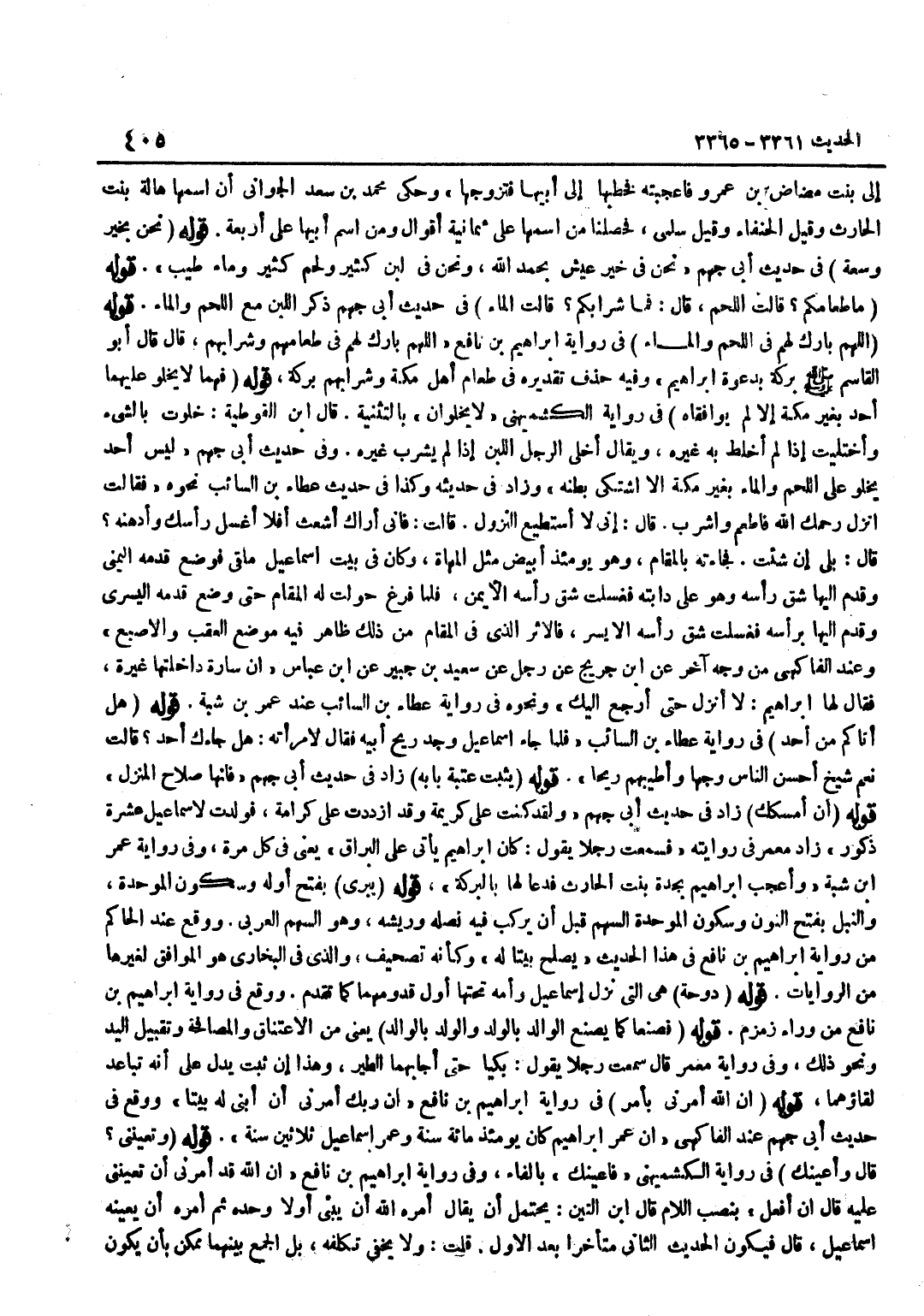 إِلَى بِنْتِ مِضَاضِ بْنِ عَمْرٍو فَأَعْجَبَتْهُ فَخَطَبَهَا إِلَى أَبِيهَا فَتَزَوَّجَهَا وَحَكَى مُحَمَّدُ بْنُ سَعْدٍ الْجَوَّانِيُّ أَنَّ اسْمَهَا هَالَةُ بِنْتُ الْحَارِثِ وَقِيلَ الْحَنْفَاءُ وَقِيلَ سَلْمَى فَحَصَلْنَا مِنَ اسْمِهَا عَلَى ثَمَانِيَة أَقْوَال وَمن اسْم أَبِيهَا عَلَى أَرْبَعَةٍ قَوْلُهُ نَحْنُ بِخَيْرٍ وَسَعَةٍ فِي حَدِيثِ أَبِي جَهْمٍ نَحْنُ فِي خَيْرِ عَيْشٍ بِحَمْدِ اللَّهِ وَنَحْنُ فِي لَبَنٍ كَثِيرٍ وَلَحْمٍ كَثِيرٍ وَمَاءٍ طَيِّبٍ قَوْلُهُ مَا طَعَامُكُمْ قَالَتِ اللَّحْمُ قَالَ فَمَا شَرَابُكُمْ قَالَتِ الْمَاءُ فِي حَدِيثِ أَبِي جَهْمٍ ذَكَرَ اللَّبَنَ مَعَ اللَّحْمِ وَالْمَاءِ قَوْلُهُ اللَّهُمَّ بَارِكْ لَهُمْ فِي اللَّحْمِ وَالْمَاءِ فِي رِوَايَةِ إِبْرَاهِيمَ بْنِ نَافِعٍ اللَّهُمَّ بَارِكْ لَهُمْ فِي طَعَامِهِمْ وَشَرَابِهِمْ قَالَ قَالَ أَبُو الْقَاسِمِ صَلَّى اللَّهُ عَلَيْهِ وَسَلَّمَ بَرَكَةٌ بِدَعْوَةِ إِبْرَاهِيمَ وَفِيهِ حَذْفٌ تَقْدِيرُهُ فِي طَعَامِ أَهْلِ مَكَّةَ وَشَرَابِهِمْ بَرَكَةٌ قَوْلُهُ فَهُمَا لَا يَخْلُو عَلَيْهِمَا أَحَدٌ بِغَيْرِ مَكَّةَ إِلَّا لَمْ يُوَافِقَاهُ فِي رِوَايَةِ الْكُشْمِيهَنِيِّ لَا يَخْلُوَانِ بالتثنية قَالَ بن الْقُوطِيَّةِ خَلَوْتُ بِالشَّيْءِ وَاخْتَلَيْتُ إِذَا لَمْ أَخْلِطْ بِهِ غَيْرَهُ وَيُقَالُ أَخْلَى الرَّجُلُ اللَّبَنَ إِذَا لَمْ يَشْرَبْ غَيْرَهُ وَفِي حَدِيثِ أَبِي جَهْمٍ لَيْسَ أَحَدٌ يَخْلُو عَلَى اللَّحْمِ وَالْمَاءِ بِغَيْرِ مَكَّةَ إِلَّا اشْتَكَى بَطْنَهُ وَزَادَ فِي حَدِيثِهِ وَكَذَا فِي حَدِيثِ عَطَاءِ بْنِ السَّائِبِ نَحْوَهُ فَقَالَتِ انْزِلْ رَحِمَكَ اللَّهُ فَاطْعَمْ وَاشْرَبْ قَالَ إِنِّي لَا أَسْتَطِيعُ النُّزُولَ قَالَتْ فَإِنِّي أَرَاكَ أَشْعَثَ أَفَلَا أَغْسِلُ رَأْسَكَ وَأَدْهُنُهُ قَالَ بَلَى إِنْ شِئْتِ فَجَاءَتْهُ بِالْمَقَامِ وَهُوَ يَوْمَئِذٍ أَبْيَضُ مِثْلُ الْمَهَاةِ وَكَانَ فِي بَيْتِ إِسْمَاعِيلَ مُلْقًى فَوَضَعَ قَدَمَهُ الْيُمْنَى وَقَدَّمَ إِلَيْهَا شِقَّ رَأْسِهِ وَهُوَ عَلَى دَابَّتِهِ فَغَسَلَتْ شِقَّ رَأْسِهِ الْأَيْمَنَ فَلَمَّا فَرَغَ حَوَّلَتْ لَهُ الْمَقَامَ حَتَّى وَضَعَ قَدَمَهُ الْيُسْرَى وَقَدَّمَ إِلَيْهَا بِرَأْسِهِ فَغَسَلَتْ شِقَّ رَأْسِهِ الْأَيْسَرَ فَالْأَثَرُ الَّذِي فِي الْمَقَامِ مِنْ ذَلِكَ ظَاهِرٌ فِيهِ مَوْضِعُ الْعَقِبِ وَالْأُصْبُعِ وَعِنْدَ الفاكهي من وَجه آخر عَن بن جُرَيْجٍ عَنْ رَجُلٍ عَنْ سَعِيدِ بْنِ جُبَيْرٍ عَن بن عَبَّاس أَن سارة داخلتها غيرَة فَقَالَ لَهَا إِبْرَاهِيمُ لَا أَنْزِلُ حَتَّى أَرْجِعَ إِلَيْكِ وَنَحْوَهُ فِي رِوَايَةِ عَطَاءِ بْنِ السَّائِبِ عِنْدَ عُمَرَ بْنِ شَبَّةَ قَوْلُهُ هَلْ أَتَاكُمْ مِنْ أَحَدٍ فِي رِوَايَةِ عَطَاءِ بْنِ السَّائِبِ فَلَمَّا جَاءَ إِسْمَاعِيلُ وَجَدَ رِيحَ أَبِيهِ فَقَالَ لِامْرَأَتِهِ هَلْ جَاءَكِ أَحَدٌ قَالَتْ نَعَمْ شَيْخٌ أَحْسَنُ النَّاسِ وَجْهًا وَأَطْيَبُهُمْ رِيحًا قَوْلُهُ يُثَبِّتُ عَتَبَةَ بَابِهِ زَادَ فِي حَدِيثِ أَبِي جَهْمٍ فَإِنَّهَا صَلَاحُ الْمَنْزِلِ قَوْلُهُ أَنْ أُمْسِكَكِ زَادَ فِي حَدِيثِ أَبِي جَهْمٍ وَلَقَدْ كُنْتِ عَلَيَّ كَرِيمَةً وَقَدِ ازْدَدْتِ عَلَيَّ كَرَامَةً فَوَلَدَتْ لِإِسْمَاعِيلَ عَشَرَةَ ذُكُورٍ زَادَ مَعْمَرٌ فِي رِوَايَتِهِ فَسَمِعْتُ رَجُلًا يَقُولُ كَانَ إِبْرَاهِيمُ يَأْتِي عَلَى الْبُرَاقِ يَعْنِي فِي كُلِّ مَرَّةٍ وَفِي رِوَايَةِ عُمَرَ بْنِ شَبَّةَ وَأُعْجِبَ إِبْرَاهِيمُ بِجَدَّةَ بِنْتِ الْحَارِثِ فَدَعَا لَهَا بِالْبَرَكَةِ قَوْلُهُ يَبْرِي بِفَتْحِ أَوَّلِهِ وَسُكُونِ الْمُوَحَّدَةِ وَالنَّبْلُ ب
