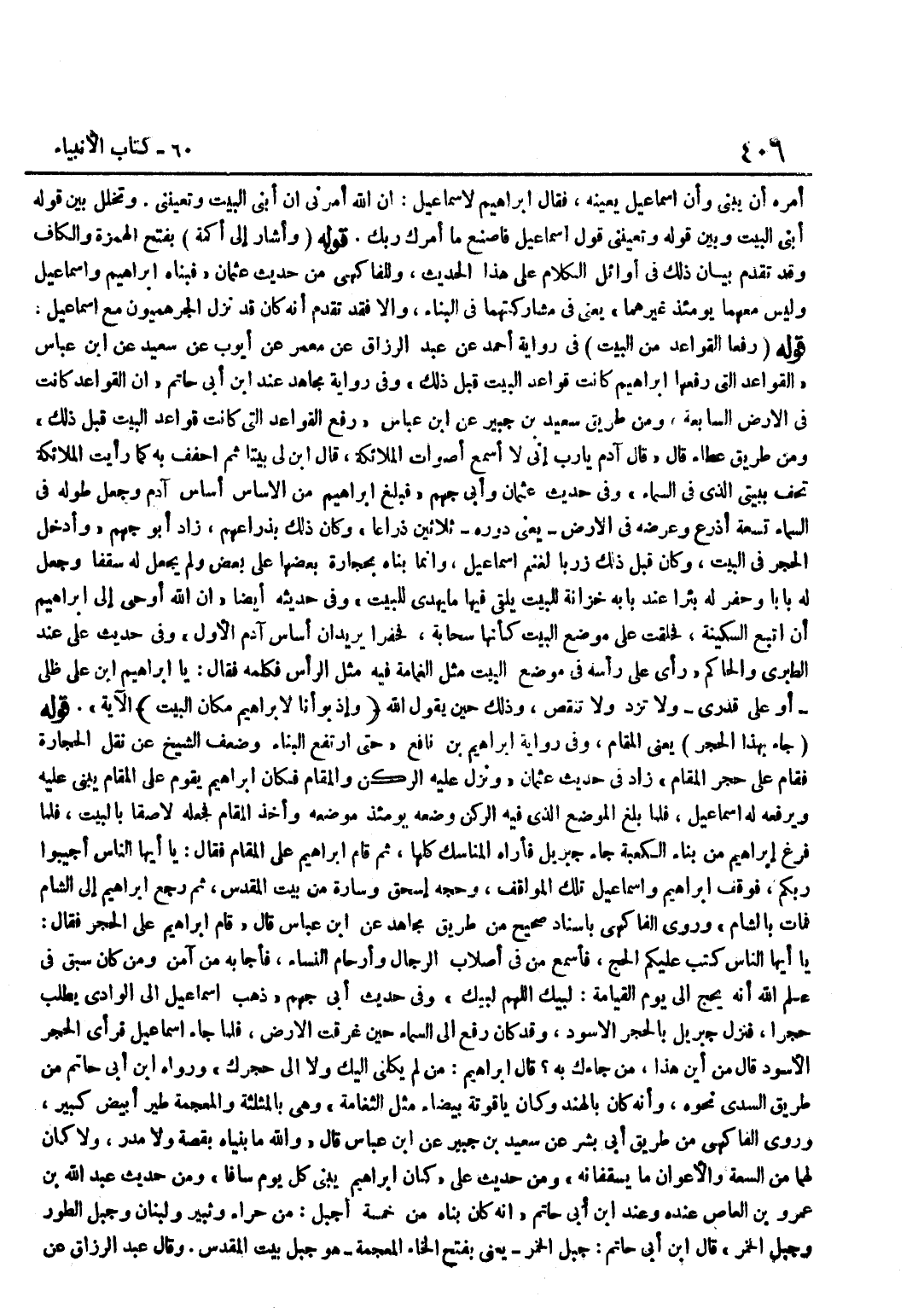 أَمَرَهُ أَنْ يَبْنِيَ وَأَنَّ إِسْمَاعِيلَ يُعِينُهُ فَقَالَ إِبْرَاهِيمُ لِإِسْمَاعِيلَ إِنَّ اللَّهَ أَمَرَنِي أَنْ أَبْنِيَ الْبَيْتَ وَتُعِينَنِي وَتَخَلَّلَ بَيْنَ قَوْلِهِ أَبْنِيَ الْبَيْتَ وَبَيْنَ قَوْلِهِ وَتُعِينَنِي قَوْلُ إِسْمَاعِيلَ فَاصْنَعْ مَا أَمَرَكَ رَبُّكَ قَوْلُهُ وَأَشَارَ إِلَى أَكَمَةٍ بِفَتْحِ الْهَمْزَةِ وَالْكَافِ وَقَدْ تَقَدَّمَ بَيَانُ ذَلِكَ فِي أَوَائِلِ الْكَلَامِ عَلَى هَذَا الْحَدِيثِ وَلِلْفَاكِهِيِّ مِنْ حَدِيثِ عُثْمَانَ فَبَنَاهُ إِبْرَاهِيمُ وَإِسْمَاعِيلُ وَلَيْسَ مَعَهُمَا يَوْمَئِذٍ غَيْرُهُمَا يَعْنِي فِي مُشَارَكَتِهِمَا فِي الْبِنَاءِ وَإِلَّا فَقَدْ تَقَدَّمَ أَنَّهُ كَانَ قَدْ نَزَلَ الْجُرْهُمِيُّونَ مَعَ إِسْمَاعِيلَ قَوْلُهُ رَفَعَا الْقَوَاعِدَ مِنَ الْبَيْتِ فِي رِوَايَةِ أَحْمَدُ عَنْ عَبْدُ الرَّزَّاقِ عَنْ مَعْمَرٍ عَنْ أَيُّوبَ عَنْ سَعِيدٍ عَنِ بن عَبَّاسٍ الْقَوَاعِدُ الَّتِي رَفَعَهَا إِبْرَاهِيمُ كَانَتْ قَوَاعِدَ الْبَيْتِ قَبْلَ ذَلِكَ وَفِي رِوَايَةِ مُجَاهِدٍ عِنْدَ بن أَبِي حَاتِمٍ أَنَّ الْقَوَاعِدَ كَانَتْ فِي الْأَرْضِ السَّابِعَةِ وَمِنْ طَرِيقِ سَعِيدِ بْنِ جُبَيْرٍ عَنِ بن عَبَّاسٍ رَفَعَ الْقَوَاعِدَ الَّتِي كَانَتْ قَوَاعِدَ الْبَيْتِ قَبْلَ ذَلِكَ وَمِنْ طَرِيقِ عَطَاءٍ قَالَ قَالَ آدَمُ يَا رَبِّ إِنِّي لَا أَسْمَعُ أَصْوَاتَ الْمَلَائِكَة قَالَ بن لِي بَيْتًا ثُمَّ احْفُفْ بِهِ كَمَا رَأَيْتَ الْمَلَائِكَةَ تَحُفُّ بَيْتِيَ الَّذِي فِي السَّمَاءِ وَفِي حَدِيثِ عُثْمَانَ وَأَبِي جَهْمٍ فَبَلَغَ إِبْرَاهِيمُ مِنَ الْأَسَاسِ أَسَاسَ آدَمَ وَجَعَلَ طُولَهُ فِي السَّمَاءِ تِسْعَةَ أَذْرُعٍ وَعَرْضَهُ فِي الْأَرْضِ يَعْنِي دَوْرَهُ ثَلَاثِينَ ذِرَاعا وَكَانَ ذَلِك بذراعهم زَاد أَبُو جَهْمٍ وَأَدْخَلَ الْحِجْرَ فِي الْبَيْتِ وَكَانَ قَبْلَ ذَلِكَ زَرْبًا لِغَنَمِ إِسْمَاعِيلَ وَإِنَّمَا بَنَاهُ بِحِجَارَةٍ بَعْضُهَا عَلَى بَعْضٍ وَلَمْ يَجْعَلْ لَهُ سَقْفًا وَجَعَلَ لَهُ بَابًا وَحَفَرَ لَهُ بِئْرًا عِنْدَ بَابِهِ خِزَانَةً لِلْبَيْتِ يُلْقَى فِيهَا مَا يُهْدَى لِلْبَيْتِ وَفِي حَدِيثِهِ أَيْضًا إنَّ اللَّهَ أَوْحَى إِلَى إِبْرَاهِيمَ أَنِ اتَّبِعِ السَّكِينَةَ فَحَلَّقَتْ عَلَى مَوْضِعِ الْبَيْتِ كَأَنَّهَا سَحَابَةٌ فَحَفَرَا يُرِيدَانِ أَسَاسَ آدَمَ الْأَوَّلَ وَفِي حَدِيثِ عَلِيٍّ عِنْدَ الطَّبَرِيِّ وَالْحَاكِمِ رَأَى عَلَى رَأْسِهِ فِي مَوْضِعِ الْبَيْتِ مِثْلَ الْغَمَامَةِ فِيهِ مِثْلَ الرَّأْسِ فَكَلَّمَهُ فَقَالَ يَا إِبْرَاهِيم بن عَلَى ظِلِّي أَوْ عَلَى قَدْرِي وَلَا تَزِدْ وَلَا تَنْقُصْ وَذَلِكَ حِينَ يَقُولُ اللَّهُ وَإِذْ بوأنا لإِبْرَاهِيم مَكَان الْبَيْت الْآيَةَ قَوْلُهُ جَاءَ بِهَذَا الْحَجَرِ يَعْنِي الْمَقَامَ وَفِي رِوَايَةِ إِبْرَاهِيمَ بْنِ نَافِعٍ حَتَّى ارْتَفَعَ الْبِنَاءُ وَضَعُفَ الشَّيْخُ عَنْ نَقْلِ الْحِجَارَةِ فَقَامَ عَلَى حَجَرِ الْمَقَامِ زَادَ فِي حَدِيثِ عُثْمَانَ وَنَزَلَ عَلَيْهِ الرُّكْنُ وَالْمَقَامُ فَكَانَ إِبْرَاهِيمُ يَقُومُ عَلَى الْمَقَامِ يَبْنِي عَلَيْهِ وَيَرْفَعُهُ لَهُ إِسْمَاعِيلُ فَلَمَّا بَلَغَ الْمَوْضِعَ الَّذِي فِيهِ الرُّكْنُ وَضَعَهُ يَوْمَئِذٍ مَوْضِعَهُ وَأَخَذَ الْمَقَامَ فَجَعَلَهُ لَاصِقًا بِالْبَيْتِ فَلَمَّا فَرَغَ إِبْرَاهِيمُ مِنْ بِنَاءِ الْكَعْبَةِ جَاءَ جِبْرِيلُ فَأَرَاهُ الْمَنَاسِكَ كُلَّهَا ثُمَّ قَامَ إِبْرَاهِيمُ عَلَى الْمَقَامِ فَقَالَ يَا أَيُّهَا النَّاسُ أَجِيبُوا رَبَّكُمْ فَوَقَفَ إِبْرَاهِيمُ وَإِسْمَاعِيلُ تِلْكَ الْمَوَاقِفَ وَحَجَّهُ إِسْحَاقُ وَسَارَةُ مِنْ بَيْتِ الْم