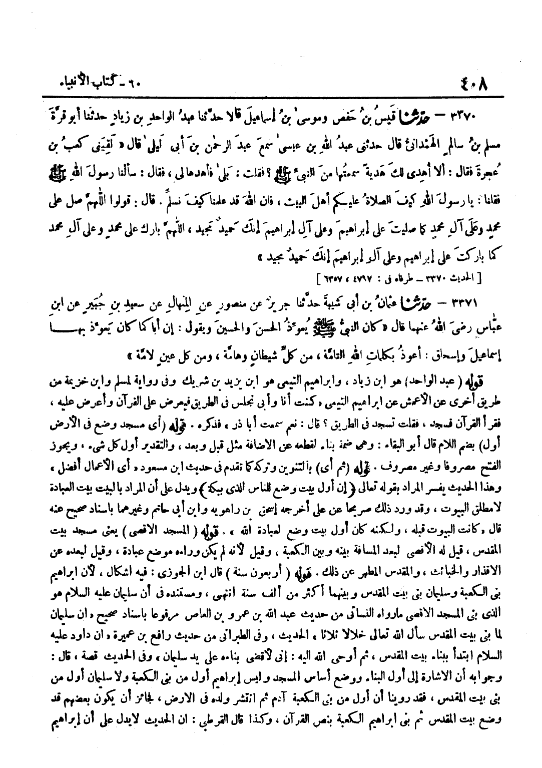 [3366] عبد الْوَاحِد هُوَ بن زِيَاد وَإِبْرَاهِيم التَّيْمِيّ هُوَ بن يزِيد بن شريك وَفِي رِوَايَة لمُسلم وبن خُزَيْمَةَ مِنْ طَرِيقٍ أُخْرَى عَنِ الْأَعْمَشِ عَنْ إِبْرَاهِيمَ التَّيْمِيِّ كُنْتُ أَنَا وَأَبِي نَجْلِسُ فِي الطَّرِيقِ فَيَعْرِضُ عَلَيَّ الْقُرْآنَ وَأَعْرِضُ عَلَيْهِ فَقَرَأَ الْقُرْآنَ فَسَجَدَ فَقُلْتُ تَسْجُدُ فِي الطَّرِيقِ قَالَ نَعَمْ سَمِعْتُ أَبَا ذَرٍّ فَذَكَرَهُ قَوْلُهُ أَيُّ مَسْجِدٍ وُضِعَ فِي الْأَرْضِ أَوَّلُ بِضَمِّ اللَّامِ قَالَ أَبُو الْبَقَاءِ وَهِيَ ضَمَّةُ بِنَاءٍ لِقَطْعِهِ عَنِ الْإِضَافَةِ مِثْلُ قَبْلُ وَبَعْدُ وَالتَّقْدِيرُ أَوَّلُ كُلِّ شَيْءٍ وَيَجُوزُ الْفَتْحُ مَصْرُوفًا وَغَيْرَ مَصْرُوفٍ قَوْلُهُ ثُمَّ أَيٌّ بِالتَّنْوِينِ وَتَرْكِهِ كَمَا تَقَدَّمَ فِي حَدِيث بن مَسْعُودٍ أَيُّ الْأَعْمَالِ أَفْضَلُ وَهَذَا الْحَدِيثُ يُفَسِّرُ الْمُرَادَ بِقَوْلِهِ تَعَالَى إِنَّ أَوَّلَ بَيْتٍ وُضِعَ للنَّاس للَّذي ببكة وَيَدُلُّ عَلَى أَنَّ الْمُرَادَ بِالْبَيْتِ بَيْتُ الْعِبَادَةِ لَا مُطْلَقُ الْبُيُوتِ وَقَدْ وَرَدَ ذَلِكَ صَرِيحًا عَن عَليّ أخرجه إِسْحَاق بن رَاهَوَيْه وبن أَبِي حَاتِمٍ وَغَيْرُهُمَا بِإِسْنَادٍ صَحِيحٍ عَنْهُ قَبْلَهُ قَالَ كَانَتِ الْبُيُوتُ قَبْلَهُ وَلَكِنَّهُ كَانَ أَوَّلَ بَيْتٍ وُضِعَ لِعِبَادَةِ اللَّهِ قَوْلُهُ الْمَسْجِدُ الْأَقْصَى يَعْنِي مَسْجِدَ بَيْتِ الْمَقْدِسِ قِيلَ لَهُ الْأَقْصَى لِبُعْدِ الْمَسَافَةِ بَيْنَهُ وَبَيْنَ الْكَعْبَةِ وَقِيلَ لِأَنَّهُ لَمْ يَكُنْ وَرَاءَهُ مَوْضِعُ عِبَادَةٍ وَقِيلَ لِبُعْدِهِ عَنِ الْأَقْذَارِ وَالْخَبَائِثِ وَالْمُقَدَّسُ الْمُطَهَّرُ عَنْ ذَلِكَ قَوْله أَرْبَعُونَ سنة قَالَ بن الْجَوْزِيِّ فِيهِ إِشْكَالٌ لِأَنَّ إِبْرَاهِيمَ بَنَى الْكَعْبَةَ وَسُلَيْمَانَ بَنَى بَيْتَ الْمَقْدِسِ وَبَيْنَهُمَا أَكْثَرُ مِنْ أَلْفِ سَنَةٍ انْتَهَى وَمُسْتَنَدُهُ فِي أَنَّ سُلَيْمَانَ عَلَيْهِ السَّلَامُ هُوَ الَّذِي بَنَى الْمَسْجِدَ الْأَقْصَى مَا رَوَاهُ النَّسَائِيُّ مِنْ حَدِيثِ عَبْدِ اللَّهِ بْنِ عَمْرِو بْنِ الْعَاصِ مَرْفُوعًا بِإِسْنَادٍ صَحِيحٍ أَنَّ سُلَيْمَانَ لَمَّا بَنَى بَيْتَ الْمَقْدِسِ سَأَلَ اللَّهَ تَعَالَى خِلَالًا ثَلَاثًا الْحَدِيثَ وَفِي الطَّبَرَانِيِّ مِنْ حَدِيثِ رَافِعِ بْنِ عُمَيْرَةَ أَنَّ دَاوُدَ عَلَيْهِ السَّلَامُ ابْتَدَأَ بِبِنَاءِ بَيْتِ الْمَقْدِسِ ثُمَّ أَوْحَى اللَّهُ إِلَيْهِ إِنِّي لَأَقْضِي بِنَاءَهُ عَلَى يَدِ سُلَيْمَانَ وَفِي الْحَدِيثِ قِصَّةٌ قَالَ وَجَوَابُهُ أَنَّ الْإِشَارَةَ إِلَى أَوَّلِ الْبِنَاءِ وَوَضْعِ أَسَاسِ الْمَسْجِدِ وَلَيْسَ إِبْرَاهِيمُ أَوَّلَ مَنْ بَنَى الْكَعْبَةَ وَلَا سُلَيْمَانُ أَوَّلَ مَنْ بَنَى بَيْتَ الْمَقْدِسِ فَقَدْ رُوِينَا أَنَّ أَوَّلَ مَنْ بَنَى الْكَعْبَةَ آدَمُ ثُمَّ انْتَشَرَ وَلَدُهُ فِي الْأَرْضِ فَجَائِزٌ أَنْ يَكُونَ بَعْضُهُمْ قَدْ وَضَعَ بَيْتَ الْمَقْدِسِ ثُمَّ بَنَى إِبْرَاهِيمُ الْكَعْبَةَ بِنَصِّ الْقُرْآنِ وَكَذَا قَالَ الْقُرْطُبِيُّ إِنَّ الْحَدِيثَ لَا يَدُلُّ عَلَى أَن إِبْرَاهِيم