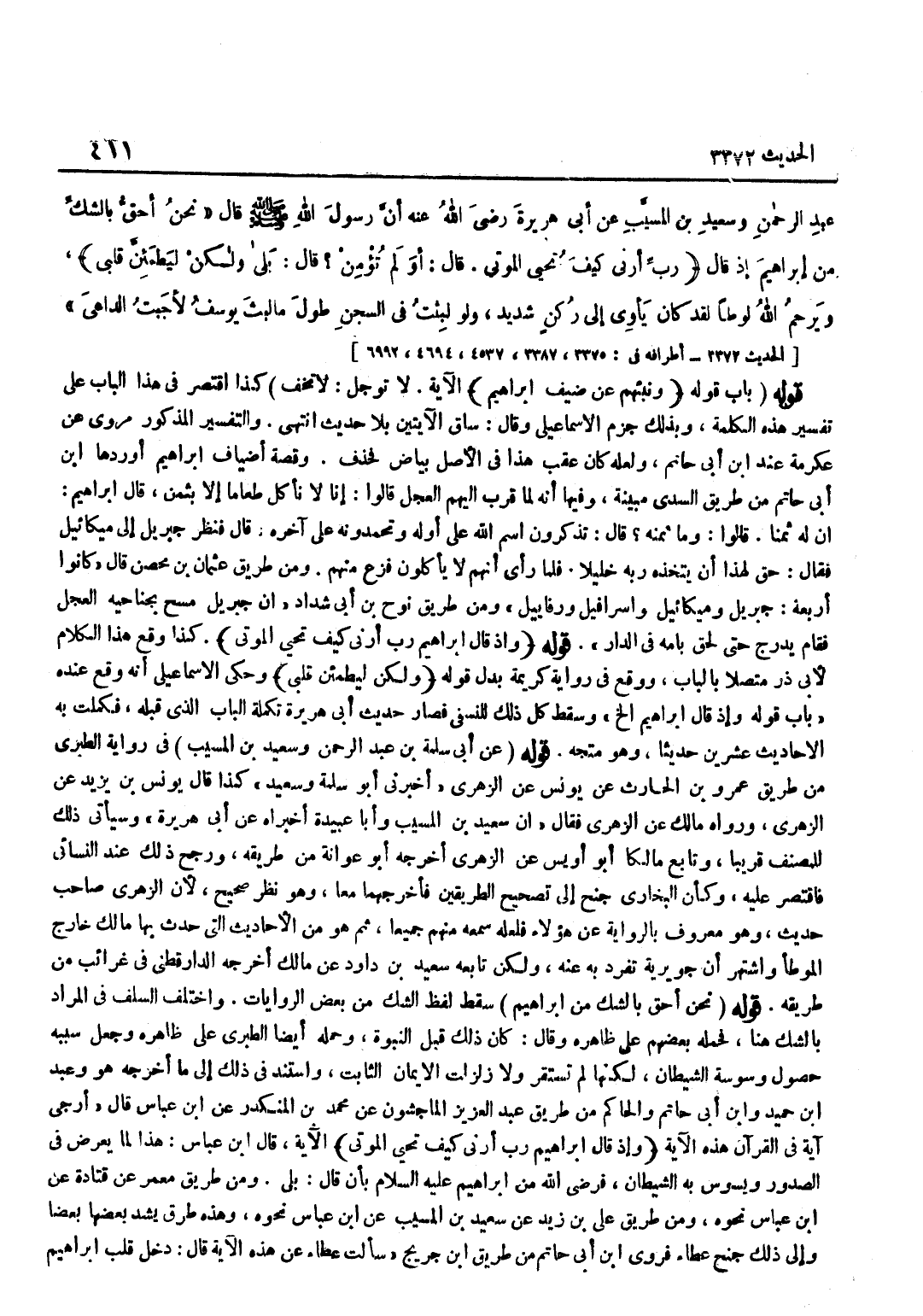 لَا تَوْجَلْ لَا تَخَفْ كَذَا اقْتَصَرَ فِي هَذَا الْبَابِ عَلَى تَفْسِيرِ هَذِهِ الْكَلِمَةِ وَبِذَلِكَ جَزَمَ الْإِسْمَاعِيلِيُّ وَقَالَ سَاقَ الْآيَتَيْنِ بِلَا حَدِيثٍ انْتَهَى وَالتَّفْسِيرُ الْمَذْكُورُ مَرْوِيٌّ عَنْ عِكْرِمَةَ عِنْد بن أَبِي حَاتِمٍ وَلَعَلَّهُ كَانَ عَقِبَ هَذَا فِي الْأَصْلِ بَيَاضٌ فَحُذِفَ وَقِصَّةُ أَضْيَافِ إِبْرَاهِيمَ أَوْرَدَهَا بن أَبِي حَاتِمٍ مِنْ طَرِيقِ السُّدِّيِّ مُبَيَّنَةً وَفِيهَا أَنَّهُ لَمَّا قَرَّبَ إِلَيْهِمُ الْعِجْلَ قَالُوا إِنَّا لَا نَأْكُلُ طَعَامًا إِلَّا بِثَمَنٍ قَالَ إِبْرَاهِيمُ إِنَّ لَهُ ثَمَنًا قَالُوا وَمَا ثَمَنُهُ قَالَ تَذْكُرُونَ اسْمَ اللَّهِ عَلَى أَوَّلِهِ وَتَحْمَدُونَهُ عَلَى آخِرِهِ قَالَ فَنَظَرَ جِبْرِيلُ إِلَى مِيكَائِيلَ فَقَالَ حُقَّ لِهَذَا أَنْ يَتَّخِذَهُ رَبُّهُ خَلِيلًا فَلَمَّا رَأَى أَنَّهُمْ لَا يَأْكُلُونَ فَزِعَ مِنْهُمْ وَمِنْ طَرِيقِ عُثْمَانَ بْنِ مُحْصَنٍ قَالَ كَانُوا أَرْبَعَةً جِبْرِيلُ وَمِيكَائِيلُ وَإِسْرَافِيلُ وَرَفَايِيلُ وَمِنْ طَرِيقِ نُوحِ بْنِ أَبِي شَدَّادٍ أَنَّ جِبْرِيلَ مَسَحَ بِجَنَاحَيْهِ الْعِجْلَ فَقَامَ يَدْرُجُ حَتَّى لَحِقَ بِأُمِّهِ فِي الدَّارِ قَوْلُهُ وَإِذْ قَالَ إِبْرَاهِيمُ رَبِّ أَرِنِي كَيْفَ تُحْيِي الْمَوْتَى كَذَا وَقَعَ هَذَا الْكَلَامُ لِأَبِي ذَرٍّ مُتَّصِلًا بِالْبَابِ وَوَقَعَ فِي رِوَايَةِ كَرِيمَةَ بَدَلَ قَوْلِهِ وَلَكِن لِيَطمَئِن قلبِي وَحَكَى الْإِسْمَاعِيلِيُّ أَنَّهُ وَقَعَ عِنْدَهُ بَابُ قَوْلِهِ وَإِذْ قَالَ إِبْرَاهِيمُ إِلَخْ وَسَقَطَ كُلُّ ذَلِكَ لِلنَّسَفِيِّ فَصَارَ حَدِيثُ أَبِي هُرَيْرَةَ تَكْمِلَةَ الْبَابِ الَّذِي قَبْلَهُ فَكَمُلَتْ بِهِ الْأَحَادِيثُ عِشْرِينَ حَدِيثًا وَهُوَ مُتَّجَهٌ قَوْلُهُ عَنْ أَبِي سَلَمَةَ بْنِ عَبْدِ الرَّحْمَنِ وَسَعِيدِ بْنِ الْمُسَيَّبِ فِي رِوَايَةِ الطَّبَرِيِّ مِنْ طَرِيقِ عَمْرِو بْنِ الْحَارِثِ عَنْ يُونُسَ عَنِ الزُّهْرِيِّ أَخْبَرَنِي أَبُو سَلَمَةَ وَسَعِيدٌ كَذَا قَالَ يُونُسُ بْنُ يَزِيدَ عَنِ الزُّهْرِيِّ وَرَوَاهُ مَالِكٌ عَنِ الزُّهْرِيِّ فَقَالَ إِنَّ سَعِيدَ بْنَ الْمُسَيَّبِ وَأَبَا عُبَيْدَةَ أَخْبَرَاهُ عَنْ أَبِي هُرَيْرَةَ وَسَيَأْتِي ذَلِكَ لِلْمُصَنِّفِ قَرِيبًا وَتَابَعَ مَالِكًا أَبُو أُوَيْسٍ عَنِ الزُّهْرِيِّ أَخْرَجَهُ أَبُو عَوَانَةَ مِنْ طَرِيقِهِ وَرَجَحَ ذَلِكَ عِنْدَ النَّسَائِيِّ فَاقْتَصَرَ عَلَيْهِ وَكَأَنَّ الْبُخَارِيَّ جَنَحَ إِلَى تَصْحِيحِ الطَّرِيقَيْنِ فَأَخْرَجَهُمَا مَعًا وَهُوَ نَظَرٌ صَحِيحٌ لِأَنَّ الزُّهْرِيَّ صَاحِبُ حَدِيثٍ وَهُوَ مَعْرُوفٌ بِالرِّوَايَةِ عَنْ هَؤُلَاءِ فَلَعَلَّهُ سَمِعَهُ مِنْهُمْ جَمِيعًا ثُمَّ هُوَ مِنَ الْأَحَادِيثِ الَّتِي حَدَّثَ بِهَا مَالِكٌ خَارِجَ الْمُوَطَّإِ وَاشْتُهِرَ أَنَّ جُوَيْرِيَةَ تَفَرَّدَ بِهِ عَنْهُ وَلَكِنْ تَابَعَهُ سَعِيدُ بْنُ دَاوُدَ عَنْ مَالِكٍ أَخْرَجَهُ الدَّارَقُطْنِيُّ فِي غَرَائِبَ مِنْ طَرِيقِهِ قَوْلُهُ نَحْنُ أَحَقُّ بِالشَّكِّ مِنْ إِبْرَاهِيمَ سَقَطَ لَفْظُ الشَّكِّ مِنْ بَعْضِ الرِّوَايَاتِ وَاخْتَلَفَ السَّلَفُ فِي الْمُرَادِ بِالشَّكِّ هُنَا فَحَمَلَهُ بَعْضُهُمْ عَلَى ظَاهِرِهِ وَقَالَ كَانَ ذَلِكَ قَبْلَ النُّبُوَّةِ وَحَمَلَهُ أَيْضًا الطَّبَرِيُّ عَلَى ظَاهِرِهِ وَجَعَلَ سَبَبَهُ حُصُولَ وَسْوَسَةِ الشَّيْطَانِ لَكِنَّهَا لَمْ تَسْتَقِرَّ وَلَا زَلْزَلَتِ الْإِيمَانَ الثَّابِتَ وَاسْتَنَدَ فِي ذَلِكَ إِلَى مَا أَخْرَجَهُ هُوَ وَعبد بن حميد وبن أَبِي حَاتِمٍ وَالْحَاكِمُ مِنْ طَرِيقِ عَبْدِ الْعَزِيزِ الْمَاجشون عَن مُحَمَّد بن الْمُنْك