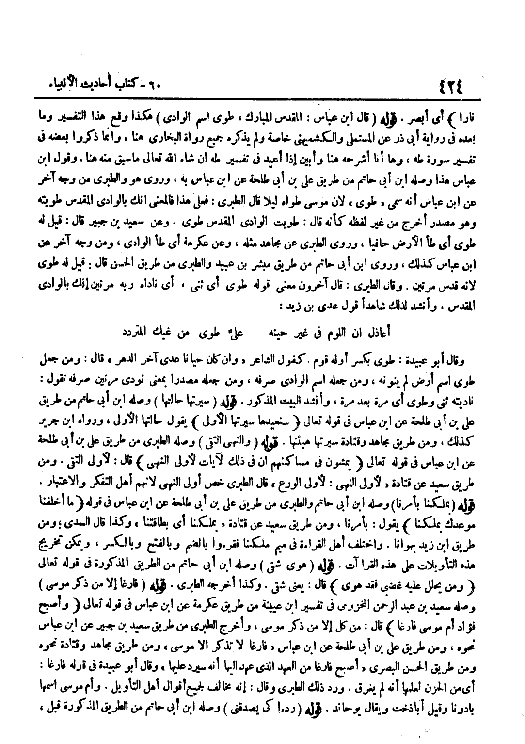 نَارا أَي أبْصر قَوْله قَالَ بن عَبَّاسٍ الْمُقَدَّسُ الْمُبَارَكُ طُوًى اسْمُ الْوَادِي هَكَذَا وَقَعَ هَذَا التَّفْسِيرُ وَمَا بَعْدَهُ فِي رِوَايَةِ أَبِي ذَرٍّ عَنِ الْمُسْتَمْلِي وَالْكُشْمِيهَنِيِّ خَاصَّةً وَلَمْ يَذْكُرْهُ جَمِيعُ رُوَاةِ الْبُخَارِيِّ هُنَا وَإِنَّمَا ذَكَرُوا بَعْضَهُ فِي تَفْسِيرِ سُورَةِ طه وَهَا أَنَا أَشْرَحُهُ هُنَا وَأُبَيِّنُ إِذَا أُعِيدَ فِي تَفْسِيرِ طه إِنْ شَاءَ اللَّهُ تَعَالَى مَا سَبَقَ مِنْهُ هُنَا وَقَول بن عَبَّاس هَذَا وَصله بن أَبِي حَاتِمٍ مِنْ طَرِيقِ عَلِيِّ بْنِ أَبِي طَلْحَةَ عَنِ بن عَبَّاسٍ بِهِ وَرَوَى هُوَ وَالطَّبَرِيُّ مِنْ وَجْهٍ آخر عَن بن عَبَّاسٍ أَنَّهُ سُمِّيَ طُوًى لِأَنَّ مُوسَى طَوَاهُ لَيْلًا قَالَ الطَّبَرِيُّ فَعَلَى هَذَا فَالْمَعْنَى إِنَّكَ بِالْوَادِي الْمُقَدَّسِ طَوَيْتُهُ وَهُوَ مَصْدَرٌ أُخْرِجَ مِنْ غَيْرِ لَفْظِهِ كَأَنَّهُ قَالَ طَوَيْتُ الْوَادِيَ الْمُقَدَّسَ طُوًى وَعَنْ سَعِيدِ بْنِ جُبَيْرٍ قَالَ قِيلَ لَهُ طُوًى أَيْ طَإِ الْأَرْضَ حَافِيًا وَرَوَى الطَّبَرِيُّ عَنْ مُجَاهِدٍ مِثْلَهُ وَعَنْ عِكْرِمَةَ أَيْ طأ بالوادي وَمن وَجه آخر عَن بن عَبَّاس كَذَلِك وروى بن أَبِي حَاتِمٍ مِنْ طَرِيقِ مُبَشِّرِ بْنِ عُبَيْدٍ وَالطَّبَرِيِّ مِنْ طَرِيقِ الْحَسَنِ قَالَ قِيلَ لَهُ طُوًى لِأَنَّهُ قُدِّسَ مَرَّتَيْنِ وَقَالَ الطَّبَرِيُّ قَالَ آخَرُونَ مَعْنَى قَوْلِهِ طُوًى أَيْ ثُنًى أَيْ نَادَاهُ رَبُّهُ مَرَّتَيْنِ إِنَّكَ بِالْوَادِي الْمُقَدَّسِ وَأَنْشَدَ لِذَلِكَ شَاهِدًا قَوْلَ عَدِيِّ بْنِ زَيْدٍ أَعَاذِلُ إِنَّ اللَّوْمَ فِي غَيْرِ حِينِهِ عَلَيَّ طُوًى مِنْ غَيِّكَ الْمُتَرَدِّدِ وَقَالَ أَبُو عُبَيْدَةَ طِوًى بِكَسْر أَوَّلَهُ قَوْمٌ كَقَوْلِ الشَّاعِرِ وَإِنْ كَانَ حَيَّانَا عِدَى آخِرِ الدَّهْرِ قَالَ وَمَنْ جَعَلَ طُوًى اسْمَ أَرْضٍ لَمْ يُنَوِّنْهُ وَمَنْ جَعَلَهُ اسْمَ الْوَادِي صَرَفَهُ وَمَنْ جَعَلَهُ مَصْدَرًا بِمَعْنَى نُودِيَ مَرَّتَيْنِ صَرَفَهُ تَقُولُ نَادَيْتُهُ ثُنًى وَطُوًى أَيْ مَرَّةً بَعْدَ مَرَّةٍ وَأَنْشَدَ الْبَيْتَ الْمَذْكُورَ قَوْلُهُ سيرتها حالتها وَصله بن أَبِي حَاتِمٍ مِنْ طَرِيقِ عَلِيِّ بْنِ أَبِي طَلْحَةَ عَنِ بْنِ عَبَّاسٍ فِي قَوْلِهِ تَعَالَى سَنُعِيدُهَا سِيرَتَهَا الْأُولَى يَقُول حالتها الأولى وَرَوَاهُ بن جَرِيرٍ كَذَلِكَ وَمِنْ طَرِيقِ مُجَاهِدٍ وَقَتَادَةَ سِيرَتَهَا هَيْئَتَهَا قَوْلُهُ وَالنُّهَى التُّقَى وَصَلَهُ الطَّبَرِيُّ مِنْ طَرِيقِ عَلِيِّ بْنِ أَبِي طَلْحَةَ عَنِ بْنِ عَبَّاسٍ فِي قَوْلِهِ تَعَالَى يَمْشُونَ فِي مَسَاكِنِهِمْ أَن فِي ذَلِك لآيَات لأولي النهى قَالَ لِأُولِي التُّقَى وَمِنْ طَرِيقِ سَعِيدٍ عَنْ قَتَادَةَ لِأُولِي النُّهَى لِأُولِي الْوَرَعِ قَالَ الطَّبَرِيُّ خَصَّ أُولِي النُّهَى لِأَنَّهُمْ أَهْلُ التَّفَكُّرِ وَالِاعْتِبَارِ قَوْله بملكنا بأمرنا وَصله بن أَبِي حَاتِمٍ وَالطَّبَرِيُّ مِنْ طَرِيقِ عَلِيِّ بْنِ أَبِي طَلْحَةَ عَنِ بْنِ عَبَّاسٍ فِي قَوْلِهِ مَا أَخْلَفْنَا مَوْعِدَكَ بِمَلْكِنَا يَقُولُ بِأَمْرِنَا وَمِنْ طَرِيقِ سَعِيدٍ عَنْ قَتَادَةَ بِمَلْكِنَا أَيْ بِطَاقَتِنَا وَكَذَا قَالَ السُّدِّيُّ وَمِنْ طَرِيق بن زَيْدٍ بِهَوَانَا وَاخْتَلَفَ أَهْلُ الْقِرَاءَةِ فِي مِيمِ ملكنا فقرؤوا بِالضَّمِّ وَبِالْفَتْحِ وَبِالْكَسْرِ وَيُمْكِنُ تَخْرِيجُ هَذِهِ التَّأْوِيلَاتِ عَلَى هَذِهِ الْقِرَاءَاتِ قَوْلُهُ هَوَى شَقِيَ وَصَلَهُ بن أَبِي حَاتِمٍ مِنَ الطَّرِيقِ الْمَذْكُورَةِ فِي قَوْلِهِ تَعَالَى وَمَنْ يَحْلِلْ عَلَيْهِ غَضَبِي فَقَدْ هَوَى قَالَ يَعْنِي شَقِيَ وَكَذَا أَخْرَجَهُ الطَّبَرِي