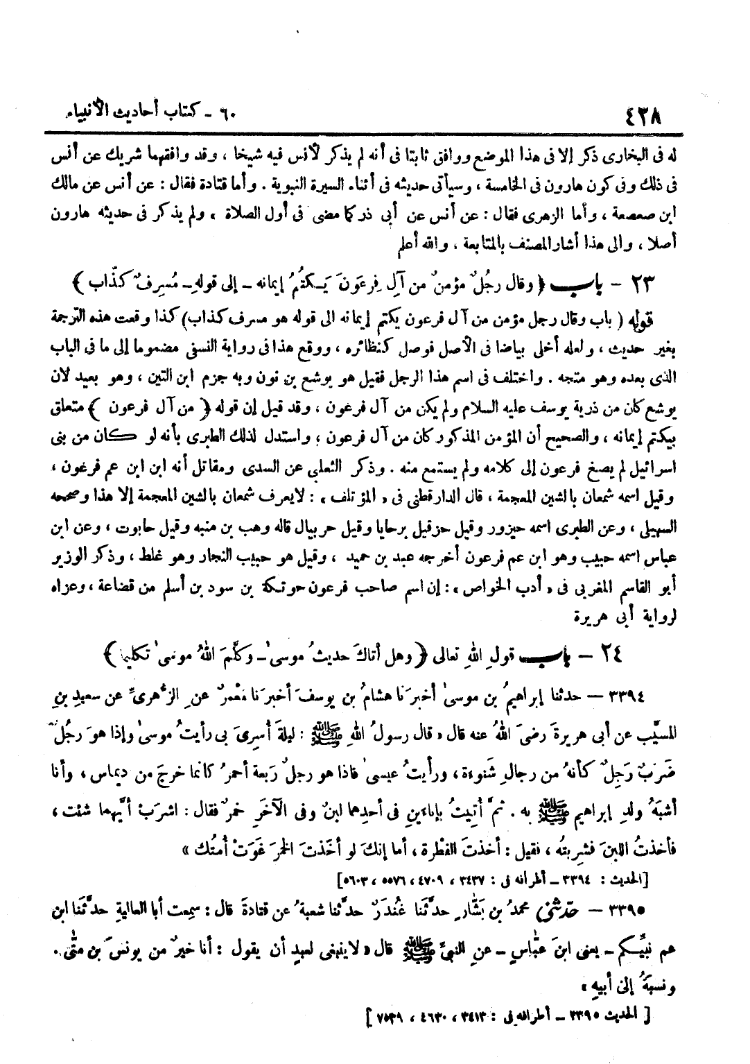 كَذَا وَقَعَتْ هَذِهِ التَّرْجَمَةُ بِغَيْرِ حَدِيثٍ وَلَعَلَّهُ أَخْلَى بَيَاضًا فِي الْأَصْلِ فَوُصِلَ كَنَظَائِرِهِ وَوَقَعَ هَذَا فِي رِوَايَةِ النَّسَفِيِّ مَضْمُومًا إِلَى مَا فِي الْبَابِ الَّذِي بَعْدَهُ وَهُوَ مُتَّجَهٌ وَاخْتُلِفَ فِي اسْمِ هَذَا الرَّجُلِ فَقِيلَ هُوَ يُوشَعُ بن نون وَبِه جزم بن التِّينِ وَهُوَ بَعِيدٌ لِأَنَّ يُوشَعَ كَانَ مِنْ ذُرِّيَّةِ يُوسُفَ عَلَيْهِ السَّلَامُ وَلَمْ يَكُنْ مِنْ آلِ فِرْعَوْنَ وَقَدْ قِيلَ إِنَّ قَوْلَهُ مِنْ آل فِرْعَوْن مُتَعَلق بيكتم إِيمَانَهُ وَالصَّحِيحُ أَنَّ الْمُؤْمِنَ الْمَذْكُورَ كَانَ مِنْ آلِ فِرْعَوْنَ وَاسْتَدَلَّ لِذَلِكَ الطَّبَرِيُّ بِأَنَّهُ لَوْ كَانَ مِنْ بَنِي إِسْرَائِيلَ لَمْ يُصْغِ فِرْعَوْنُ إِلَى كَلَامِهِ وَلَمْ يَسْتَمِعْ مِنْهُ وَذَكَرَ الثَّعْلَبِيُّ عَن السّديّ وَمُقَاتِل أَنه بن بن عَمِّ فِرْعَوْنَ وَقِيلَ اسْمُهُ شَمْعَانُ بِالشِّينِ الْمُعْجَمَةِ قَالَ الدَّارَقُطْنِيُّ فِي الْمُؤْتَلِفِ لَا يُعْرَفُ شَمْعَانُ بِالشِّينِ الْمُعْجَمَةِ إِلَّا هَذَا وَصَحَّحَهُ السُّهَيْلِيُّ وَعَنِ الطَّبَريِّ اسْمُهُ حيزور وَقِيلَ حزقيل برحايا وَقِيلَ حربيال قَالَهُ وَهْبُ بْنُ مُنَبِّهٍ وَقِيلَ حَابُوتُ وَعَن بن عَبَّاس اسْمه حبيب وَهُوَ بن عَمِّ فِرْعَوْنَ أَخْرَجَهُ عَبْدُ بْنُ حُمَيْدٍ وَقِيلَ هُوَ حَبِيبٌ النَّجَّارُ وَهُوَ غَلَطٌ وَذَكَرَ الْوَزِيرُ أَبُو الْقَاسِمِ الْمَغْرِبِيُّ فِي أَدَبِ الْخَوَاصِّ إِنَّ اسْمَ صَاحِبِ فِرْعَوْنَ حَوْتَكَةُ بْنُ سَوْدِ بْنِ أَسْلَمَ مِنْ قُضَاعَةَ وَعَزَاهُ لِرِوَايَةِ أَبِي هُرَيْرَةَ