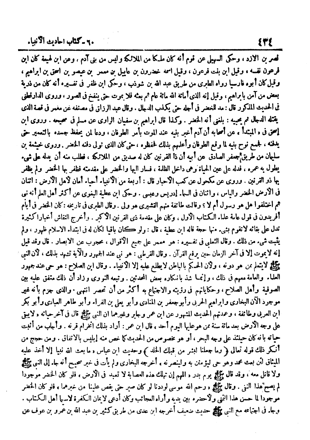 نَصْرِ بْنِ الْأَزْدِ وَحَكَى السُّهَيْلِيُّ عَنْ قَوْمٍ أَنَّهُ كَانَ مَلَكًا مِنَ الْمَلَائِكَةِ وَلَيْسَ مِنْ بني آدم وَعَن بن لَهِيعَة كَانَ بن فِرْعَوْن نَفسه وَقيل بن بِنْتِ فِرْعَوْنَ وَقِيلَ اسْمُهُ خَضِرُونُ بْنُ عَايِيلَ بْنِ مَعْمَرِ بْنِ عِيصُو بْنِ إِسْحَاقَ بْنِ إِبْرَاهِيمَ وَقِيلَ كَانَ أَبُوهُ فَارِسِيًّا رَوَاهُ الطَّبَرِيُّ مِنْ طَرِيقِ عَبْدِ اللَّهِ بْنِ شَوْذَبٍ وَحَكَى بن ظَفَرٍ فِي تَفْسِيرِهِ أَنَّهُ كَانَ مِنْ ذُرِّيَّةِ بَعْضِ مَنْ آمَنَ بِإِبْرَاهِيمَ وَقِيلَ إِنَّهُ الَّذِي أَمَاتَهُ اللَّهُ مِائَةَ عَامٍ ثُمَّ بَعَثَهُ فَلَا يَمُوتُ حَتَّى يُنْفَخَ فِي الصُّورِ وَرَوَى الدَّارَقُطْنِيُّ فِي الْحَدِيثِ الْمَذْكُورِ قَالَ مُدَّ لِلْخَضِرِ فِي أَجَلِهِ حَتَّى يُكَذِّبَ الدَّجَّالَ وَقَالَ عَبْدُ الرَّزَّاقِ فِي مُصَنَّفِهِ عَنْ مَعْمَرٍ فِي قِصَّةِ الَّذِي يَقْتُلُهُ الدَّجَّالُ ثُمَّ يُحْيِيهِ بَلَغَنِي أَنَّهُ الْخَضِرُ وَكَذَا قَالَ إِبْرَاهِيمُ بْنُ سُفْيَانَ الرَّاوِي عَنْ مُسلم فِي صَحِيحه وروى بن إِسْحَاق فِي المبتدىء عَنْ أَصْحَابِهِ أَنَّ آدَمَ أَخْبَرَ بَنِيهِ عِنْدَ الْمَوْت بِأَمْر الطوفان ودعا بِمن يَحْفَظُ جَسَدَهُ بِالتَّعْمِيرِ حَتَّى يَدْفِنَهُ فَجَمَعَ نُوحٌ بَنِيهِ لَمَّا وَقَعَ الطُّوفَانُ وَأَعْلَمَهُمْ بِذَلِكَ فَحَفِظُوهُ حَتَّى كَانَ الَّذِي تَوَلَّى دَفْنَهُ الْخَضِرُ وَرَوَى خَيْثَمَةُ بْنُ سُلَيْمَانَ مِنْ طَرِيقِ جَعْفَرٍ الصَّادِقِ عَنْ أَبِيهِ أَنَّ ذَا الْقَرْنَيْنِ كَانَ لَهُ صَدِيقٌ مِنَ الْمَلَائِكَةِ فَطَلَبَ مِنْهُ أَنْ يَدُلَّهُ عَلَى شَيْءٍ يُطَوِّلُ بِهِ عُمُرَهُ فَدَلَّهُ عَلَى عين الْحَيَاة وَهِي دَاخل الظلمَة فَصَارَ إِلَيْهَا وَالْخَضِرُ عَلَى مُقَدِّمَتِهِ فَظَفِرَ بِهَا الْخَضِرُ وَلَمْ يَظْفَرْ بِهَا ذُو الْقَرْنَيْنِ وَرُوِيَ عَنْ مَكْحُولٍ عَنْ كَعْبِ الْأَحْبَارِ قَالَ أَرْبَعَةٌ مِنَ الْأَنْبِيَاءِ أَحْيَاءٌ أَمَانٌ لِأَهْلِ الْأَرْضِ اثْنَانِ فِي الأَرْض الْخضر والياس واثنبن فِي السَّمَاء إِدْرِيس وَعِيسَى وَحكى بن عَطِيَّةَ الْبَغَوِيُّ عَنْ أَكْثَرِ أَهْلِ الْعِلْمِ أَنَّهُ نَبِيٌّ ثُمَّ اخْتَلَفُوا هَلْ هُوَ رَسُولٌ أَمْ لَا وَقَالَتْ طَائِفَةٌ مِنْهُمُ الْقُشَيرِيُّ هُوَ وَلِيٌّ وَقَالَ الطَّبَرِيُّ فِي تَارِيخِهِ كَانَ الْخَضِرُ فِي أَيَّامِ أَفْرِيدُونَ فِي قَوْلِ عَامَّةِ عُلَمَاءِ الْكِتَابِ الْأَوَّلِ وَكَانَ عَلَى مُقَدِّمَةِ ذِي الْقَرْنَيْنِ الْأَكْبَرِ وَأَخْرَجَ النَّقَّاشُ أَخْبَارًا كَثِيرَةً تَدُلُّ عَلَى بَقَائِهِ لَا تقوم بِشَيْء مِنْهَا حجَّة قَالَه بن عَطِيَّةَ قَالَ وَلَوْ كَانَ بَاقِيًا لَكَانَ لَهُ فِي ابْتِدَاءِ الْإِسْلَامِ ظُهُورٌ وَلَمْ يَثْبُتْ شَيْءٌ مِنْ ذَلِكَ وَقَالَ الثَّعْلَبِيُّ فِي تَفْسِيرِهِ هُوَ مُعَمِّرٌ عَلَى جَمِيعِ الْأَقْوَالِ مَحْجُوبٌ عَنِ الْأَبْصَارِ قَالَ وَقَدْ قِيلَ إِنَّهُ لَا يَمُوتُ إِلَّا فِي آخر الزَّمَان حِين يرفع الْقُرْآن وَقَالَ الْقُرْطُبِيُّ هُوَ نَبِيٌّ عِنْدَ الْجُمْهُورِ وَالْآيَةُ تَشْهَدُ بِذَلِكَ لِأَنَّ النَّبِيَّ صَلَّى اللَّهُ عَلَيْهِ وَسَلَّمَ لَا يَتَعَلَّمُ مِمَّنْ هُوَ دُونَهُ وَلِأَنَّ الْحُكْمَ بِالْبَاطِلِ لَا يطلع عَلَيْهِ إِلَّا الْأَنْبِيَاء وَقَالَ بن الصَّلَاحِ هُوَ حَيٌّ عِنْدَ جُمْهُورِ الْعُلَمَاءِ وَالْعَامَّةِ مَعَهُمْ فِي ذَلِكَ وَإِنَّمَا شَذَّ بِإِنْكَارِهِ بَعْضَ الْمُحَدِّثِينَ وَتَبِعَهُ النَّوَوِيُّ وَزَادَ أَنَّ ذَلِكَ مُتَّفَقٌ عَلَيْهِ بَيْنَ الصُّوفِيَّةِ وَأَهْلِ الصَّلَاحِ وَحِكَايَاتُهُمْ فِي رُؤْيَتِهِ وَالِاجْتِمَاعِ بِهِ أَكْثَرُ مِنْ أَنْ تُحْصَرَ انْتَهَى