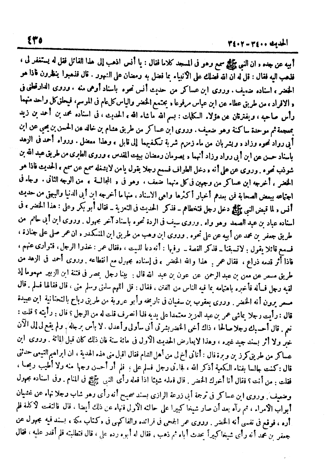 أَبِيهِ عَنْ جَدِّهِ أَنَّ النَّبِيَّ صَلَّى اللَّهُ عَلَيْهِ وَسَلَّمَ سَمِعَ وَهُوَ فِي الْمَسْجِدِ كَلَامًا فَقَالَ يَا أَنَسُ اذْهَبْ إِلَى هَذَا الْقَائِلِ فَقُلْ لَهُ يَسْتَغْفِرْ لِي فَذَهَبَ إِلَيْهِ فَقَالَ قُلْ لَهُ إِنَّ اللَّهَ فَضَّلَكَ عَلَى الْأَنْبِيَاءِ بِمَا فَضَّلَ بِهِ رَمَضَانَ عَلَى الشُّهُورِ قَالَ فَذَهَبُوا يَنْظُرُونَ فَإِذَا هُوَ الْخَضِرُ إِسْنَادُهُ ضَعِيفٌ وروى بن عَسَاكِر من حَدِيث أنس نَحوه بِإِسْنَاد أَو هِيَ مِنْهُ وَرَوَى الدَّارَقُطْنِيُّ فِي الْأَفْرَادِ مِنْ طَرِيقِ عَطاء عَن بن عَبَّاسٍ مَرْفُوعًا يَجْتَمِعُ الْخَضِرُ وَإِلْيَاسُ كُلَّ عَامٍ فِي الْمَوْسِمِ فَيَحْلِقُ كُلُّ وَاحِدٍ مِنْهُمَا رَأْسَ صَاحِبِهِ وَيَفْتَرِقَانِ عَنْ هَؤُلَاءِ الْكَلِمَاتِ بِسْمِ اللَّهِ مَا شَاءَ اللَّهُ الْحَدِيثَ فِي إِسْنَادِهِ مُحَمَّدُ بْنُ أَحْمَدَ بْنِ زَيْدٍ بِمُعْجَمَةٍ ثُمَّ مُوَحَّدَةٍ سَاكِنة وَهُوَ ضَعِيف وروى بن عَسَاكِرَ مِنْ طَرِيقِ هِشَامِ بْنِ خَالِدٍ عَنِ الْحسن بن يحيى عَن بن أَبِي رَوَّادٍ نَحْوَهُ وَزَادَ وَيَشْرَبَانِ مِنْ مَاءِ زَمْزَمَ شَرْبَةً تَكْفِيهِمَا إِلَى قَابِلٍ وَهَذَا مُعْضَلٌ وَرَوَاهُ أَحْمَدُ فِي الزُّهْدِ بِإِسْنَادٍ حَسَنٍ عَنِ بن أَبِي رَوَّادٍ وَزَادَ أَنَّهُمَا يَصُومَانِ رَمَضَانَ بِبَيْتِ الْمَقْدِسِ وَرَوَى الطَّبَرِيُّ مِنْ طَرِيقِ عَبْدِ اللَّهِ بْنِ شَوْذَبٍ نَحْوَهُ وَرُوِيَ عَنْ عَلِيٍّ أَنَّهُ دَخَلَ الطَّوَافَ فَسَمِعَ رَجُلًا يَقُولُ يَا مَنْ لَا يَشْغَلُهُ سَمْعٌ عَنْ سَمْعٍ الْحَدِيثَ فَإِذَا هُوَ الْخضر أخرجه بن عَسَاكِرَ مِنْ وَجْهَيْنِ فِي كُلٍّ مِنْهُمَا ضَعْفٌ وَهُوَ فِي الْمُجَالَسَةِ مِنَ الْوَجْهِ الثَّانِي وَجَاءَ فِي اجْتِمَاعِهِ بِبَعْضِ الصَّحَابَةِ فَمَنْ بَعْدَهُمْ أَخْبَارٌ أَكْثَرهَا واهي الْإِسْنَاد مِنْهَا مَا أخرجه بن أَبِي الدُّنْيَا وَالْبَيْهَقِيُّ مِنْ حَدِيثِ أَنَسٍ لَمَّا قُبِضَ النَّبِيُّ صَلَّى اللَّهُ عَلَيْهِ وَسَلَّمَ دَخَلَ رَجُلٌ فَتَخَطَّاهُمْ فَذَكَرَ الْحَدِيثَ فِي التَّعْزِيَةِ فَقَالَ أَبُو بَكْرٍ وَعَلِيٌّ هَذَا الْخَضِرُ فِي إِسْنَادِهِ عَبَّادُ بْنُ عَبْدِ الصَّمَدِ وَهُوَ وَاهٍ وَرَوَى سَيْفٌ فِي الرِّدَّةِ نَحْوَهُ بِإِسْنَادٍ آخَرَ مَجْهُولٍ وروى بن أَبِي حَاتِمٍ مِنْ طَرِيقِ جَعْفَرِ بْنِ مُحَمَّدٍ عَنْ أَبِيهِ عَنْ عَلِيٍّ نَحوه وروى بن وهب من طَرِيق بن الْمُنْكَدِرِ أَنَّ عُمَرَ صَلَّى عَلَى جِنَازَةٍ فَسَمِعَ قَائِلًا يَقُولُ لَا تَسْبِقْنَا فَذَكَرَ الْقِصَّةَ وَفِيهَا أَنَّهُ دَعَا لِلْمَيِّتِ فَقَالَ عُمَرُ خُذُوا الرَّجُلَ فَتَوَارَى عَنْهُمْ فَإِذَا أَثَرُ قَدَمِهِ ذِرَاعٌ فَقَالَ عُمَرُ هَذَا وَاللَّهِ الْخَضِرُ فِي إِسْنَادِهِ مَجْهُولٌ مَعَ انْقِطَاعِهِ وَرَوَى أَحْمَدُ فِي الزُّهْدِ مِنْ طَرِيقِ مِسْعَرٍ عَنْ مَعْنِ بْنِ عَبْدِ الرَّحْمَنِ عَنْ عَوْنِ بْنِ عَبْدِ اللَّهِ قَالَ بَيْنَا رجل بِمصْر فِي فتْنَة بن الزُّبَيْرِ مَهْمُومًا إِذْ لَقِيَهُ رَجُلٌ فَسَأَلَهُ فَأَخْبَرَهُ بِاهْتِمَامِهِ بِمَا فِيهِ النَّاسُ مِنَ الْفِتَنِ فَقَالَ قُلِ اللَّهُمَّ سَلِّمْنِي وَسَلِّمْ مِنِّي قَالَ فَقَالَهَا فَسَلِمَ قَالَ مِسْعَرٌ يَرَوْنَ أَنَّهُ الْخَضِرُ وَرَوَى يَعْقُوبُ بْنُ سُفْيَانَ فِي تَارِيخِهِ وَأَبُو عَرُوبَةَ من طَرِيق رَبَاح بالتحتانية بن عُبَيْدَةَ قَالَ رَأَيْتُ رَجُلًا يُمَاشِي عُمَرَ بْنَ عَبْدِ الْعَزِيزِ مُعْتَمِدًا عَلَى يَدَيْهِ فَلَمَّا انْصَرَفَ قُلْتُ لَهُ مَنِ الرَّجُلُ قَالَ رَأَيْتَهُ قُلْتُ نَعَمْ قَالَ أَحْسَبُكَ رَجُلًا صَالِحًا ذَاكَ أَخِي الْخَضِرُ بَشَّرَنِي أَنِّي سَأُوَلَّى وَأَعْدِلُ لَا بَأْسَ 