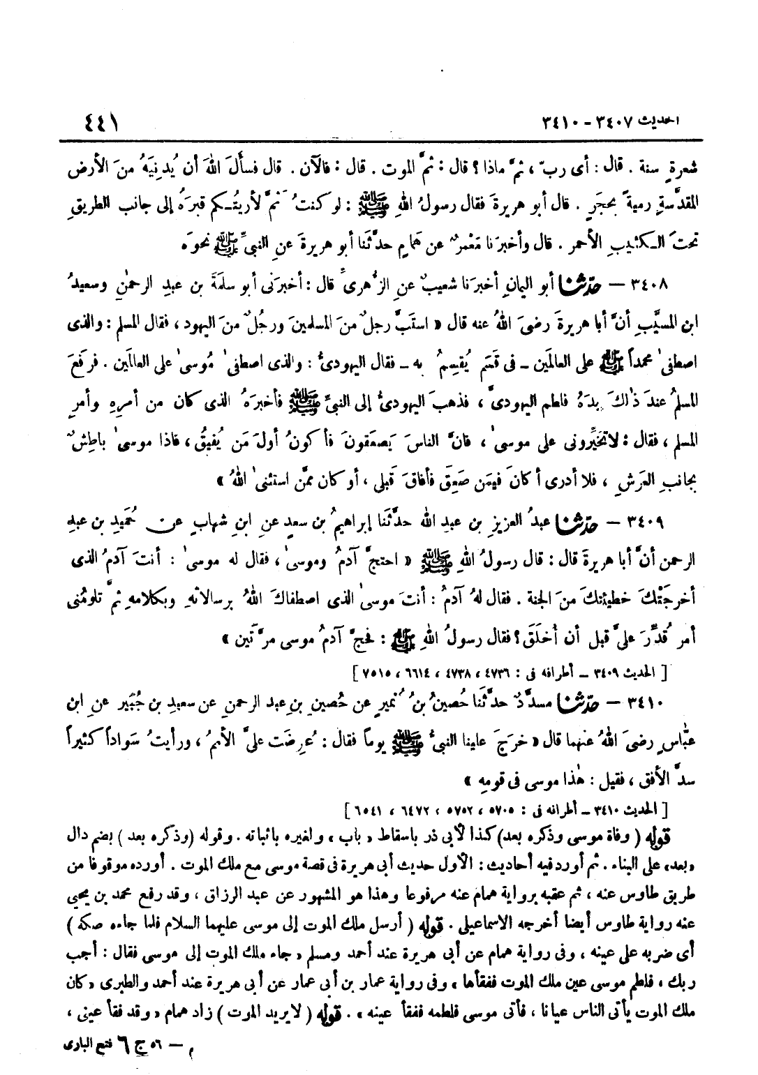 وَذَكَرَهُ بَعْدُ كَذَا لِأَبِي ذَرٍّ بِإِسْقَاطِ بَابٍ وَلِغَيْرِهِ بِإِثْبَاتِهِ وَقَوْلُهُ وَذَكَرَهُ بَعْدُ بِضَمِّ دَالِ بَعْدُ عَلَى الْبِنَاءِ ثُمَّ أَوْرَدَ فِيهِ أَحَادِيثَ الْأَوَّلُ حَدَيثُ أَبِي هُرَيْرَةَ فِي قِصَّةِ مُوسَى مَعَ مَلَكِ الْمَوْتِ أَوْرَدَهُ مَوْقُوفًا مِنْ طَرِيقِ طَاوُسٍ عَنْهُ ثُمَّ عَقَّبَهُ بِرِوَايَةِ هَمَّامٍ عَنْهُ مَرْفُوعًا وَهَذَا هُوَ الْمَشْهُورُ عَنْ عَبْدِ الرَّزَّاقِ وَقَدْ رَفَعَ مُحَمَّدُ بْنُ يَحْيَى عَنْهُ رِوَايَةَ طَاوُسٍ أَيْضًا أَخْرَجَهُ الْإِسْمَاعِيلِيُّ قَوْلُهُ أُرْسِلَ مَلَكُ الْمَوْتِ إِلَى مُوسَى عَلَيْهِمَا السَّلَامُ فَلَمَّا جَاءَهُ صَكَّهُ أَيْ ضَرَبَهُ عَلَى عَيْنِهِ وَفِي رِوَايَةِ هَمَّامٍ عَنْ أَبِي هُرَيْرَةَ عِنْدَ أَحْمَدَ وَمُسْلِمٍ جَاءَ مَلَكُ الْمَوْتِ إِلَى مُوسَى فَقَالَ أَجِبْ رَبَّكَ فَلَطَمَ مُوسَى عَيْنَ مَلَكِ الْمَوْتِ فَفَقَأَهَا وَفِي رِوَايَةِ عَمَّارِ بْنِ أَبِي عَمَّارٍ عَنْ أَبِي هُرَيْرَةَ عِنْدَ أَحْمَدَ وَالطَّبَرِيِّ كَانَ مَلَكُ الْمَوْتِ يَأْتِي النَّاسَ عِيَانًا فَأَتَى مُوسَى فَلَطَمَهُ فَفَقَأَ عَيْنَهُ