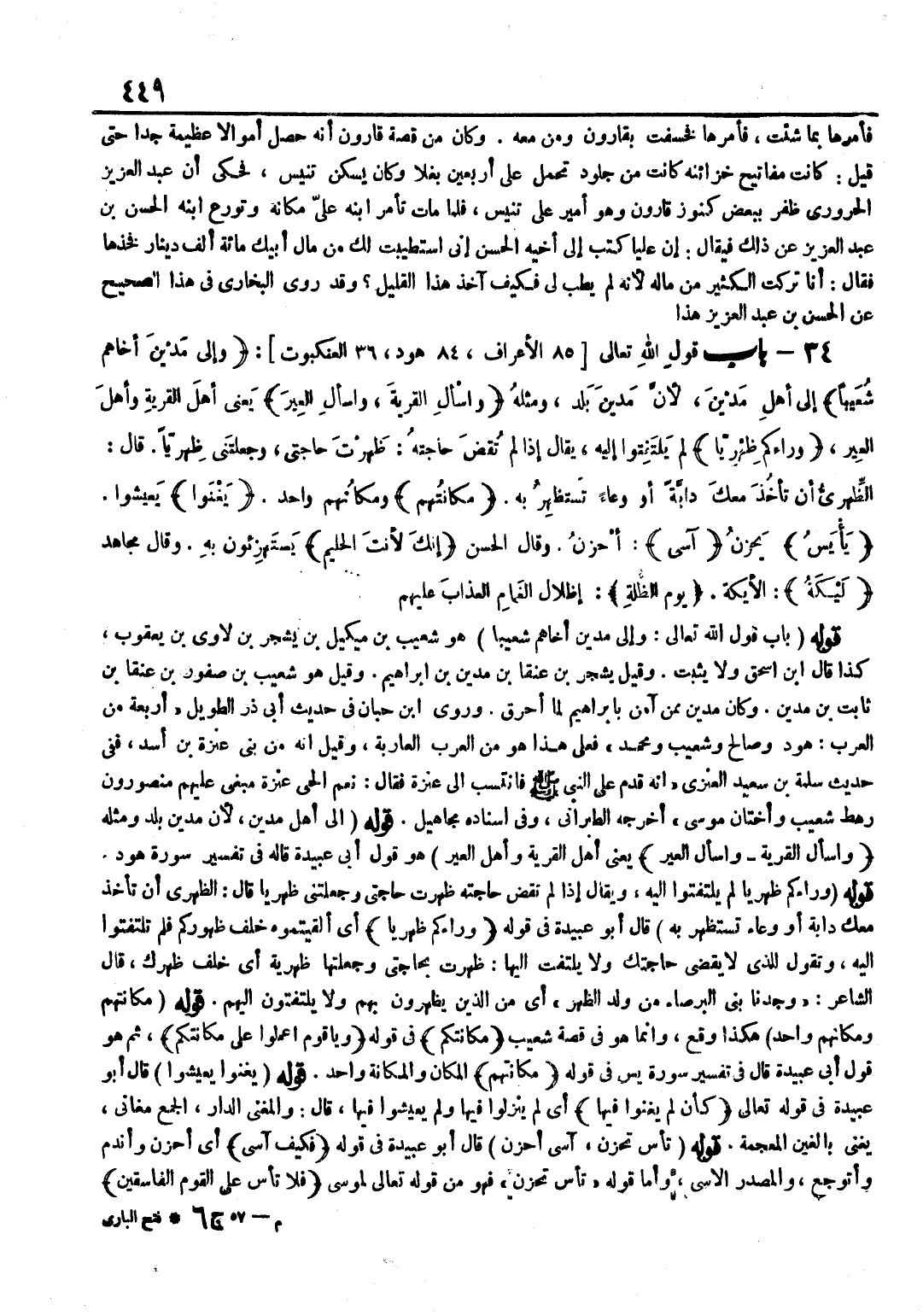 فَأْمُرْهَا بِمَا شِئْتَ فَأَمَرَهَا فَخَسَفَتْ بِقَارُونَ وَمَنْ مَعَهُ وَكَانَ مِنْ قِصَّةِ قَارُونَ أَنَّهُ حَصَّلَ أَمْوَالًا عَظِيمَةً جِدًّا حَتَّى قِيلَ كَانَتْ مَفَاتِيحُ خَزَائِنِهِ كَانَتْ مِنْ جُلُودٍ تُحْمَلُ عَلَى أَرْبَعِينَ بَغْلًا وَكَانَ يَسْكُنُ تِنِّيسَ فَحُكِيَ أَنَّ عَبْدَ الْعَزِيزَ الْحَرُورِيَّ ظَفِرَ بِبَعْضِ كُنُوزِ قَارُونَ وَهُوَ أَمِيرٌ عَلَى تِنِّيسَ فَلَمَّا مَاتَ تَأَمَّرَ ابْنُهُ عَلِيٌّ مَكَانَهُ وَتَوَرَّعَ ابْنُهُ الْحَسَنُ بْنُ عَبْدِ الْعَزِيزِ عَنْ ذَلِكَ فَيُقَالُ إِنَّ عَلِيًّا كَتَبَ إِلَى أَخِيه الْحسن إِنِّي استطيبت لَكَ مِنْ مَالِ أَبِيكَ مِائَةَ أَلْفِ دِينَارٍ فَخُذْهَا فَقَالَ أَنَا تَرَكْتُ الْكَثِيرَ مِنْ مَالِهِ لِأَنَّهُ لَمْ يَطِبْ لِي فَكَيْفَ آخُذُ هَذَا الْقَلِيلَ وَقَدْ رَوَى الْبُخَارِيُّ فِي هَذَا الصَّحِيحِ عَنِ الْحَسَنِ بْنِ عَبْدِ الْعَزِيزِ هَذَا