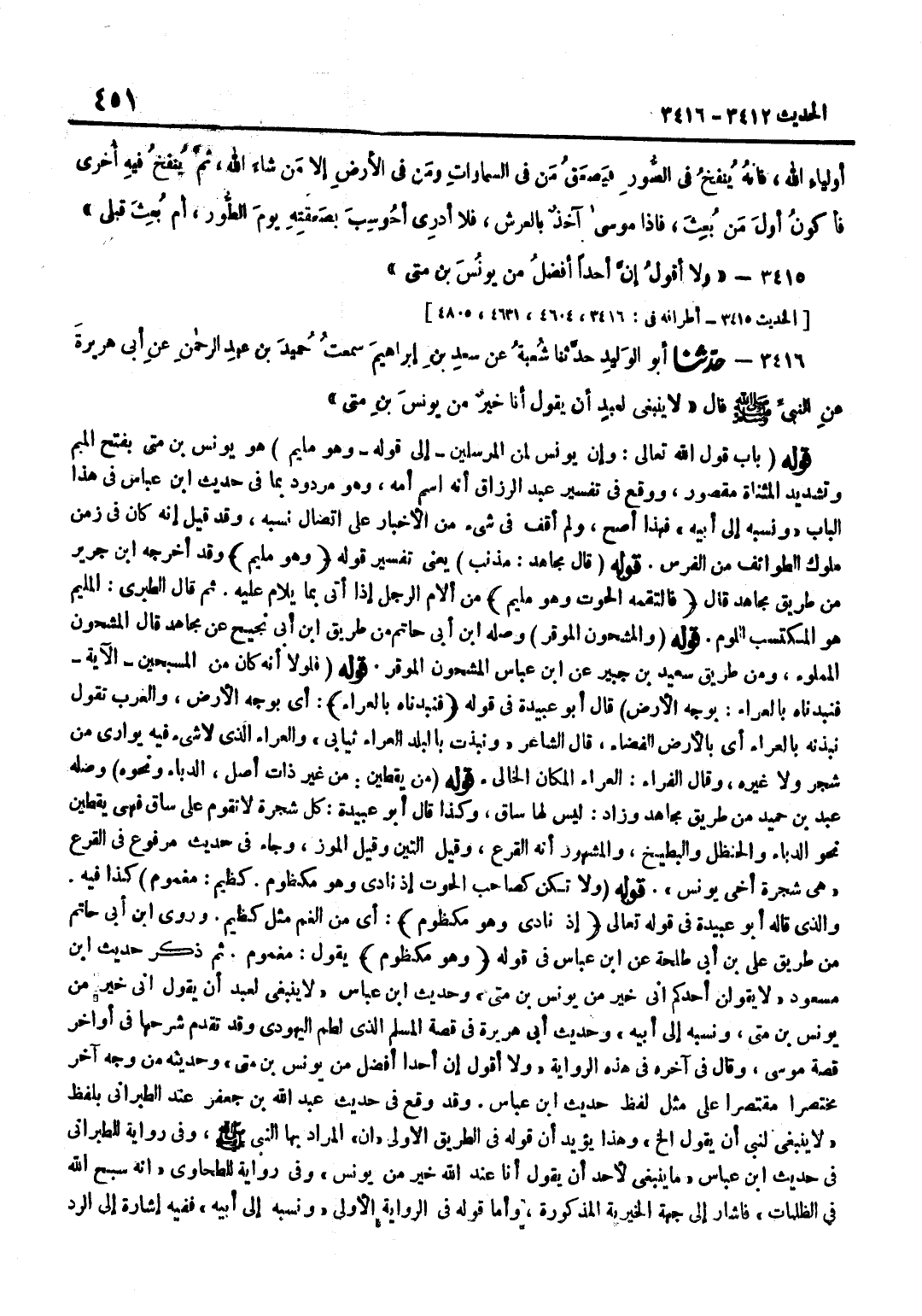 هُوَ يُونُسُ بْنُ مَتَّى بِفَتْحِ الْمِيمِ وَتَشْدِيدِ الْمُثَنَّاةِ مَقْصُورٌ وَوَقَعَ فِي تَفْسِيرِ عَبْدِ الرَّزَّاقِ أَنَّهُ اسْمُ أُمِّهِ وَهُوَ مَرْدُود بِمَا فِي حَدِيث بن عَبَّاسٍ فِي هَذَا الْبَابِ وَنَسَبَهُ إِلَى أَبِيهِ فَهَذَا أَصَحُّ وَلَمْ أَقِفْ فِي شَيْءٍ مِنَ الْأَخْبَارِ عَلَى اتِّصَالِ نَسَبِهِ وَقَدْ قِيلَ إِنَّهُ كَانَ فِي زَمَنِ مُلُوكِ الطَّوَائِفِ مِنَ الْفُرْسِ قَوْلُهُ قَالَ مُجَاهِدٌ مُذْنِبٌ يَعْنِي تَفْسِيرَ قَوْلِهِ وَهُوَ مليم وَقد أخرجه بن جَرِيرٍ مِنْ طَرِيقِ مُجَاهِدٍ قَالَ فَالْتَقَمَهُ الْحُوتُ وَهُوَ مليم مِنْ أَلَامَ الرَّجُلُ إِذَا أَتَى بِمَا يُلَامُ عَلَيْهِ ثُمَّ قَالَ الطَّبَرِيُّ الْمُلِيمُ هُوَ الْمُكْتَسِبُ اللوم قَوْله والمشحون الموقر وَصله بن أبي حَاتِم من طَرِيق بن أَبِي نَجِيحٍ عَنْ مُجَاهِدٍ قَالَ الْمَشْحُونُ الْمَمْلُوءُ وَمن طَرِيق سعيد بن جُبَير عَن بن عَبَّاسٍ الْمَشْحُونُ الْمُوقَرُ قَوْلُهُ فَلَوْلَا أَنَّهُ كَانَ من المسبحين الْآيَة فنبذناه بالعراء بِوَجْهِ الْأَرْضِ قَالَ أَبُو عُبَيْدَةَ فِي قَوْلِهِ فنبذناه بالعراء أَيْ بِوَجْهِ الْأَرْضِ وَالْعَرَبُ تَقُولُ نَبَذْتُهُ بِالْعَرَاءِ أَيْ بِالْأَرْضِ الْفَضَاءِ قَالَ الشَّاعِرُ وَنَبَذْتُ بِالْبَلَدِ الْعَرَاءِ ثِيَابِي وَالْعَرَاءُ الَّذِي لَا شَيْءَ فِيهِ يُوَارِي مِنْ شَجَرٍ وَلَا غَيْرِهِ وَقَالَ الْفَرَّاءُ الْعَرَاءُ الْمَكَانُ الْخَالِي قَوْلُهُ مِنْ يَقْطِينٍ مِنْ غَيْرِ ذَاتِ أَصْلٍ الدُّبَّاءُ وَنَحْوُهُ وَصَلَهُ عَبْدُ بْنُ حُمَيْدٍ مِنْ طَرِيقِ مُجَاهِدٍ وَزَادَ لَيْسَ لَهَا سَاقٌ وَكَذَا قَالَ أَبُو عُبَيْدَةَ كُلُّ شَجَرَةٍ لَا تَقُومُ عَلَى سَاقٍ فَهِيَ يَقْطِينٌ نَحْوُ الدُّبَّاءِ وَالْحَنْظَلِ وَالْبِطِّيخِ وَالْمَشْهُورُ أَنَّهُ الْقَرْعُ وَقِيلَ التِّينُ وَقِيلَ الْمَوْزُ وَجَاءَ فِي حَدِيثٍ مَرْفُوعٍ فِي الْقَرْعِ هِيَ شَجَرَةُ أَخِي يُونُسَ قَوْلُهُ وَلَا تَكُنْ كَصَاحِبِ الْحُوتِ إِذْ نَادَى وَهُوَ مكظوم كَظِيمٌ مَغْمُومٌ كَذَا فِيهِ وَالَّذِي قَالَهُ أَبُو عُبَيْدَةَ فِي قَوْلِهِ تَعَالَى إِذْ نَادَى وَهُوَ مكظوم أَي من الْغم مثل كظيم وروى بن أَبِي حَاتِمٍ مِنْ طَرِيقِ عَلِيِّ بْنِ أَبِي طَلْحَةَ عَنِ بن عَبَّاسٍ فِي قَوْلِهِ وَهُوَ مَكْظُومٌ يَقُولُ مَغْمُومٌ ثمَّ ذكر حَدِيث بن مَسْعُودٍ لَا يَقُولَنَّ أَحَدُكُمْ إِنِّي خَيْرٌ مِنْ يُونُس بن مَتى وَحَدِيث بن عَبَّاسٍ لَا يَنْبَغِي لِعَبْدٍ أَنْ يَقُولَ إِنِّي خَيْرٌ مِنْ يُونُسَ بْنِ مَتَّى وَنَسَبَهُ إِلَى أَبِيهِ وَحَدِيثَ أَبِي هُرَيْرَةَ فِي قِصَّةِ الْمُسْلِمِ الَّذِي لَطَمَ الْيَهُودِيَّ وَقَدْ تَقَدَّمَ شَرْحُهَا فِي أَوَاخِرِ قِصَّةِ مُوسَى وَقَالَ فِي آخِرِهِ فِي هَذِهِ الرِّوَايَةِ وَلَا أَقُولُ إِنَّ أَحَدًا أَفْضَلَ مِنْ يُونُسَ بْنِ مَتَّى وَحَدِيثَهُ مِنْ وَجْهٍ آخَرَ مُخْتَصَرًا مُقْتَصِرًا عَلَى مِثْلِ لَفْظِ حَدِيثِ بن عَبَّاسٍ وَقَدْ وَقَعَ فِي حَدِيثِ عَبْدِ اللَّهِ بْنِ جَعْفَرٍ عِنْدَ الطَّبَرَانِيِّ بِلَفْظِ لَا يَنْبَغِي لِنَبِيٍّ أَنْ يَقُولَ إِلَخْ وَهَذَا يُؤَيِّدُ أَنَّ قَوْلَهُ فِي الطَّرِيقِ الْأُولَى إِنَّ الْمُرَادَ بِهَا النَّبِيَّ صَلَّى اللَّهُ عَلَيْهِ وَسَلَّمَ وَفِي رِوَايَةِ للطبراني فِي حَدِيث بن عَبَّاسٍ مَا يَنْبَغِي لِأَحَدٍ أَنْ يَقُولَ أَنَا عِنْدَ اللَّهِ خَيْرٌ مِنْ يُونُسَ وَفِي رِوَايَةٍ لِلطَّحَاوِيِّ أَنَّهُ سَبَّحَ اللَّهَ فِي الظُّلُمَاتِ فَأَشَارَ إِلَى جِهَةِ الْخَيْرِيَّةِ الْمَذْكُورَةِ وَأَمَّا