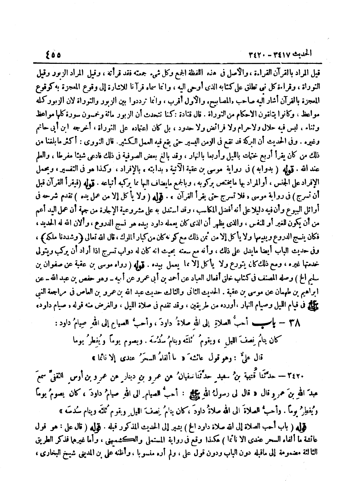 [3417] قَوْلُهُ بِدَوَابِّهِ فِي رِوَايَةِ مُوسَى بْنِ عُقْبَةَ الْآتِيَةِ بِدَابَّتِهِ بِالْإِفْرَادِ وَكَذَا هُوَ فِي التَّفْسِيرِ وَيُحْمَلُ الْإِفْرَادُ عَلَى الْجِنْسِ أَوِ الْمُرَادُ بِهَا مَا يَخْتَصُّ بِرُكُوبِهِ وَبِالْجَمْعِ مَا يُضَافُ إِلَيْهَا مِمَّا يَرْكَبُهُ أَتْبَاعُهُ قَوْلُهُ فَيَقْرَأُ الْقُرْآنَ قَبْلَ أَنْ تُسْرَجَ فِي رِوَايَةِ مُوسَى فَلَا تُسْرَجُ حَتَّى يَقْرَأَ الْقُرْآنَ قَوْلُهُ وَلَا يَأْكُلُ إِلَّا مِنْ عَمَلِ يَدِهِ تَقَدَّمَ شَرْحُهُ فِي أَوَائِلِ الْبُيُوعِ وَأَنَّ فِيهِ دَلِيلًا عَلَى أَنَّهُ أَفْضَلُ الْمَكَاسِبِ وَقَدِ اسْتَدَلَّ بِهِ عَلَى مَشْرُوعِيَّةِ الْإِجَارَةِ مِنْ جِهَةِ أَنَّ عَمَلَ الْيَدِ أَعَمُّ مِنْ أَنْ يَكُونَ لِلْغَيْرِ أَوْ لِلنَّفْسِ وَالَّذِي يَظْهَرُ أَنَّ الَّذِي كَانَ يَعْمَلُهُ دَاوُدُ بِيَدِهِ هُوَ نَسْجُ الدُّرُوعِ وَأَلَانَ اللَّهُ لَهُ الْحَدِيدَ فَكَانَ يَنْسِجُ الدُّرُوعَ وَيَبِيعُهَا وَلَا يَأْكُلُ إِلَّا مِنْ ثَمَنِ ذَلِكَ مَعَ كَوْنِهِ كَانَ مِنْ كِبَارِ الْمُلُوكِ قَالَ اللَّهُ تَعَالَى وَشَدَدْنَا ملكه وَفِي حَدِيثِ الْبَابِ أَيْضًا مَا يَدُلُّ عَلَى ذَلِكَ وَأَنَّهُ مَعَ سَعَتِهِ بِحَيْثُ أَنَّهُ كَانَ لَهُ دَوَابٌّ تُسْرَجُ إِذَا أَرَادَ أَنْ يَرْكَبَ وَيَتَوَلَّى خِدْمَتَهَا غَيْرُهُ وَمَعَ ذَلِكَ كَانَ يَتَوَرَّعُ وَلَا يَأْكُلُ إِلَّا مِمَّا يَعْمَلُ بِيَدِهِ قَوْلُهُ رَوَاهُ مُوسَى بْنُ عُقْبَةَ عَنْ صَفْوَانَ بْنِ سُلَيْمٍ إِلَخْ وَصَلَهُ الْمُصَنِّفُ فِي كِتَابِ خَلْقِ أَفْعَالِ الْعِبَادِ عَنْ أَحْمَدَ بْنِ أَبِي عَمْرٍو عَنْ أَبِيهِ وَهُوَ حَفْصُ بْنُ عَبْدِ اللَّهِ عَنْ إِبْرَاهِيمَ بْنِ طَهْمَانَ عَنْ مُوسَى بْنِ عُقْبَةَ الْحَدِيثُ الثَّانِي وَالثَّالِثُ حَدِيثِ عَبْدِ اللَّهِ بْنِ عَمْرِو بْنِ الْعَاصِ فِي مُرَاجَعَةِ النَّبِيِّ صَلَّى اللَّهُ عَلَيْهِ وَسَلَّمَ فِي قِيَامِ اللَّيْلِ وَصِيَامِ النَّهَارِ أَوْرَدَهُ مِنْ طَرِيقَيْنِ وَقَدْ تَقَدَّمَ فِي صَلَاةِ اللَّيْلِ وَالْغَرَضُ مِنْهُ
