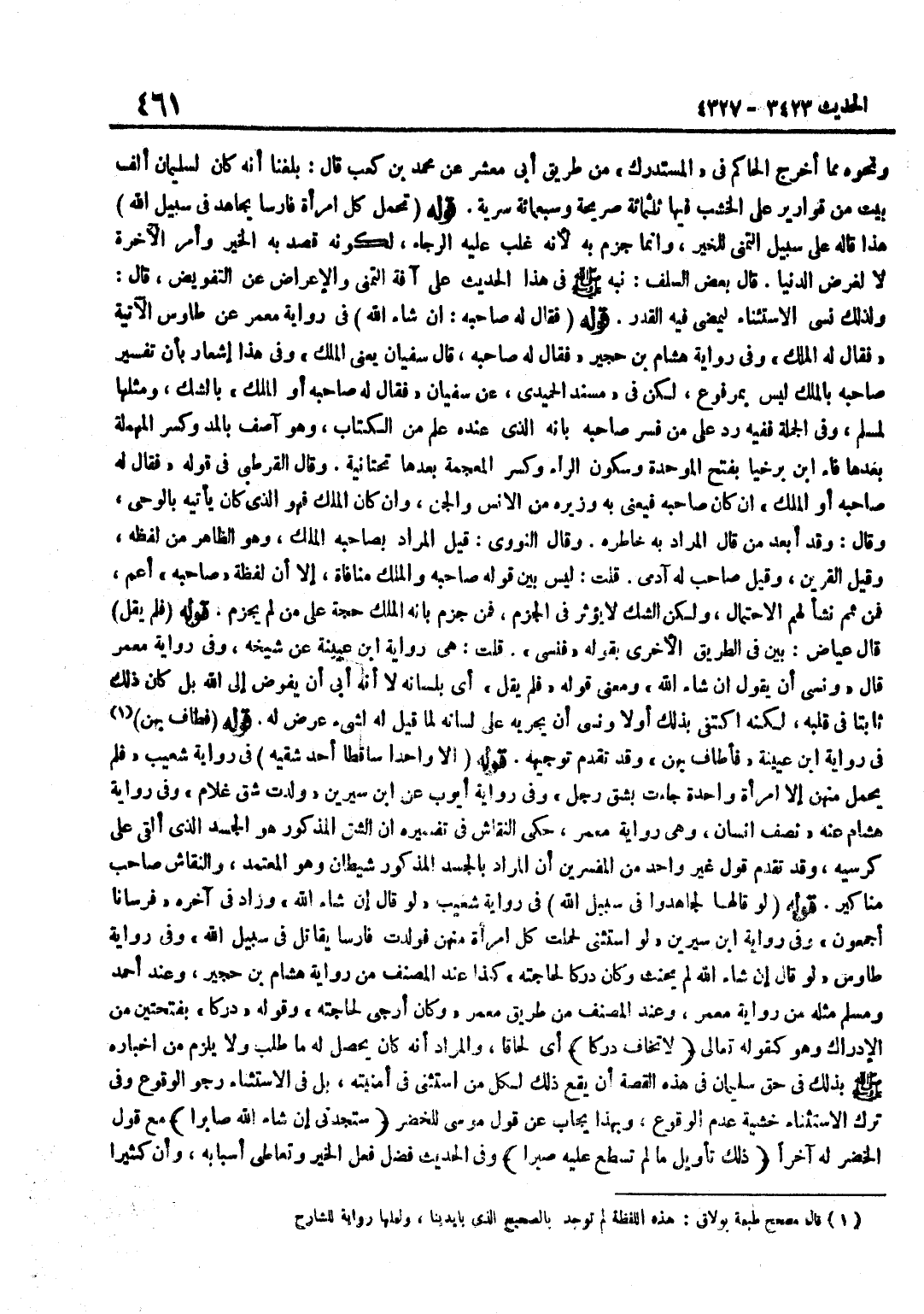 وَنَحْوُهُ مِمَّا أَخْرَجَ الْحَاكِمُ فِي الْمُسْتَدْرَكِ مِنْ طَرِيقِ أَبِي مَعْشَرٍ عَنْ مُحَمَّدِ بْنِ كَعْبٍ قَالَ بَلَغَنَا أَنَّهُ كَانَ لِسُلَيْمَانَ أَلْفُ بَيْتٍ من قَوَارِير على الْخشب فِيهَا ثَلَاثمِائَة صَرِيحَة وَسَبْعُمِائَةِ سَرِيَّةٍ قَوْلُهُ تَحْمِلُ كُلُّ امْرَأَةٍ فَارِسًا يُجَاهِدُ فِي سَبِيلِ اللَّهِ هَذَا قَالَهُ عَلَى سَبِيلِ التَّمَنِّي لِلْخَيْرِ وَإِنَّمَا جَزَمَ بِهِ لِأَنَّهُ غَلَبَ عَلَيْهِ الرَّجَاءُ لِكَوْنِهِ قَصَدَ بِهِ الْخَيْرَ وَأَمْرَ الْآخِرَةِ لَا لِغَرَضِ الدُّنْيَا قَالَ بَعْضُ السَّلَفِ نَبَّهَ صَلَّى اللَّهُ عَلَيْهِ وَسَلَّمَ فِي هَذَا الْحَدِيثِ عَلَى آفَةِ التَّمَنِّي وَالْإِعْرَاضِ عَنِ التَّفْوِيضِ قَالَ وَلِذَلِكَ نَسِيَ الِاسْتِثْنَاءَ لِيَمْضِيَ فِيهِ الْقَدْرُ قَوْلُهُ فَقَالَ لَهُ صَاحِبُهُ إِنْ شَاءَ اللَّهُ فِي رِوَايَةِ مَعْمَرٍ عَنْ طَاوُسٍ الْآتِيَةِ فَقَالَ لَهُ الْمَلَكُ وَفِي رِوَايَةِ هِشَامِ بْنِ حُجَيْرٍ فَقَالَ لَهُ صَاحِبُهُ قَالَ سُفْيَانُ يَعْنِي الْمَلَكَ وَفِي هَذَا إِشْعَارٌ بِأَنَّ تَفْسِيرَ صَاحِبِهِ بِالْمَلَكِ لَيْسَ بِمَرْفُوعٍ لَكِنْ فِي مُسْنَدِ الْحُمَيْدِيِّ عَنْ سُفْيَانَ فَقَالَ لَهُ صَاحِبُهُ أَوِ الْمَلَكُ بِالشَّكِّ وَمِثْلُهَا لِمُسْلِمٍ وَفِي الْجُمْلَةِ فَفِيهِ رَدٌّ عَلَى مَنْ فَسَّرَ صَاحِبَهُ بِأَنَّهُ الَّذِي عِنْدَهُ عِلْمٌ مِنَ الْكِتَابِ وَهُوَ آصِفُ بِالْمَدِّ وَكَسْرِ الْمُهْملَة بعْدهَا فَاء بن بَرْخِيَا بِفَتْحِ الْمُوَحَّدَةِ وَسُكُونِ الرَّاءِ وَكَسْرِ الْمُعْجَمَةِ بَعْدَهَا تَحْتَانِيَّةٌ وَقَالَ الْقُرْطُبِيُّ فِي قَوْلِهِ فَقَالَ لَهُ صَاحِبُهُ أَوِ الْمَلَكُ إِنْ كَانَ صَاحِبُهُ فَيَعْنِي بِهِ وَزِيرَهُ مِنَ الْإِنْسِ وَالْجِنِّ وَإِنْ كَانَ الْمَلَكُ فَهُوَ الَّذِي كَانَ يَأْتِيهِ بِالْوَحْيِ وَقَالَ وَقَدْ أَبْعَدَ مَنْ قَالَ الْمُرَادُ بِهِ خَاطِرُهُ وَقَالَ النَّوَوِيُّ قِيلَ الْمُرَادُ بِصَاحِبِهِ الْمَلَكُ وَهُوَ الظَّاهِرُ مِنْ لَفْظِهِ وَقِيلَ الْقَرِينُ وَقِيلَ صَاحِبٌ لَهُ آدَمِيٌّ قُلْتُ لَيْسَ بَيْنَ قَوْلِهِ صَاحِبُهُ وَالْمَلَكُ مُنَافَاةٌ إِلَّا أَنَّ لَفْظَةَ صَاحِبُهُ أَعَمُّ فَمِنْ ثَمَّ نَشَأَ لَهُمْ الِاحْتِمَالُ وَلَكِنَّ الشَّكَّ لَا يُؤَثِّرُ فِي الْجَزْمِ فَمَنْ جَزَمَ بِأَنَّهُ الْمَلَكُ حُجَّةٌ عَلَى مَنْ لَمْ يَجْزِمْ قَوْلُهُ فَلَمْ يَقُلْ قَالَ عِيَاضٌ بُيِّنَ فِي الطَّرِيقِ الْأُخْرَى بِقَوْلِهِ فَنَسِيَ قُلْتُ هِيَ رِوَايَةُ بن عُيَيْنَةَ عَنْ شَيْخِهِ وَفِي رِوَايَةِ مَعْمَرٍ قَالَ وَنَسِيَ أَنْ يَقُولَ إِنْ شَاءَ اللَّهُ وَمَعْنَى قَوْلِهِ فَلَمْ يَقُلْ أَيْ بِلِسَانِهِ لَا أَنَّهُ أَبَى أَنْ يُفَوِّضَ إِلَى اللَّهِ بَلْ كَانَ ذَلِكَ ثَابِتًا فِي قَلْبِهِ لَكِنَّهُ اكْتَفَى بِذَلِكَ أَوَّلًا وَنَسِيَ أَنْ يُجْرِيَهُ عَلَى لِسَانِهِ لَمَّا قِيلَ لَهُ لِشَيْءٍ عَرَضَ لَهُ قَوْلُهُ فَطَافَ بِهن فِي رِوَايَة بن عُيَيْنَةَ فَأَطَافَ بِهِنَّ وَقَدْ تَقَدَّمَ تَوْجِيهُهُ قَوْلُهُ إِلَّا وَاحِدًا سَاقِطًا أَحَدُ شِقَّيْهِ فِي رِوَايَةِ شُعَيْبٍ فَلَمْ يَحْمِلْ مِنْهُنَّ إِلَّا امْرَأَةٌ وَاحِدَةٌ جَاءَتْ بِشِقِّ رَجُلٍ وَفِي رِوَايَةِ أَيُّوبَ عَنِ بن سِيرِينَ وَلَدَتْ شِقَّ غُلَامٍ وَفِي رِوَايَةِ هِشَامٍ عَنْهُ نِصْفَ إِنْسَانٍ وَهِيَ رِوَايَةُ مَعْمَرٍ حَكَى النَّقَّاشُ فِي تَفْسِيرِهِ أَنَّ الشِّقَّ الْمَذْكُورَ هُوَ الْجَسَدُ الَّذِي أُلْقِيَ عَلَى كُرْسِيِّهِ وَقَدْ تَقَدَّمَ قَوْلُ غَيْرِ وَاحِدٍ مِنَ الْمُفَسِّرِينَ أنَّ الْمُرَادَ بِالْجَسَدِ الْمَذْكُورِ شَيْطَانٌ وَهُوَ الْمُعْتَمَدُ وَالنَّقَّاش