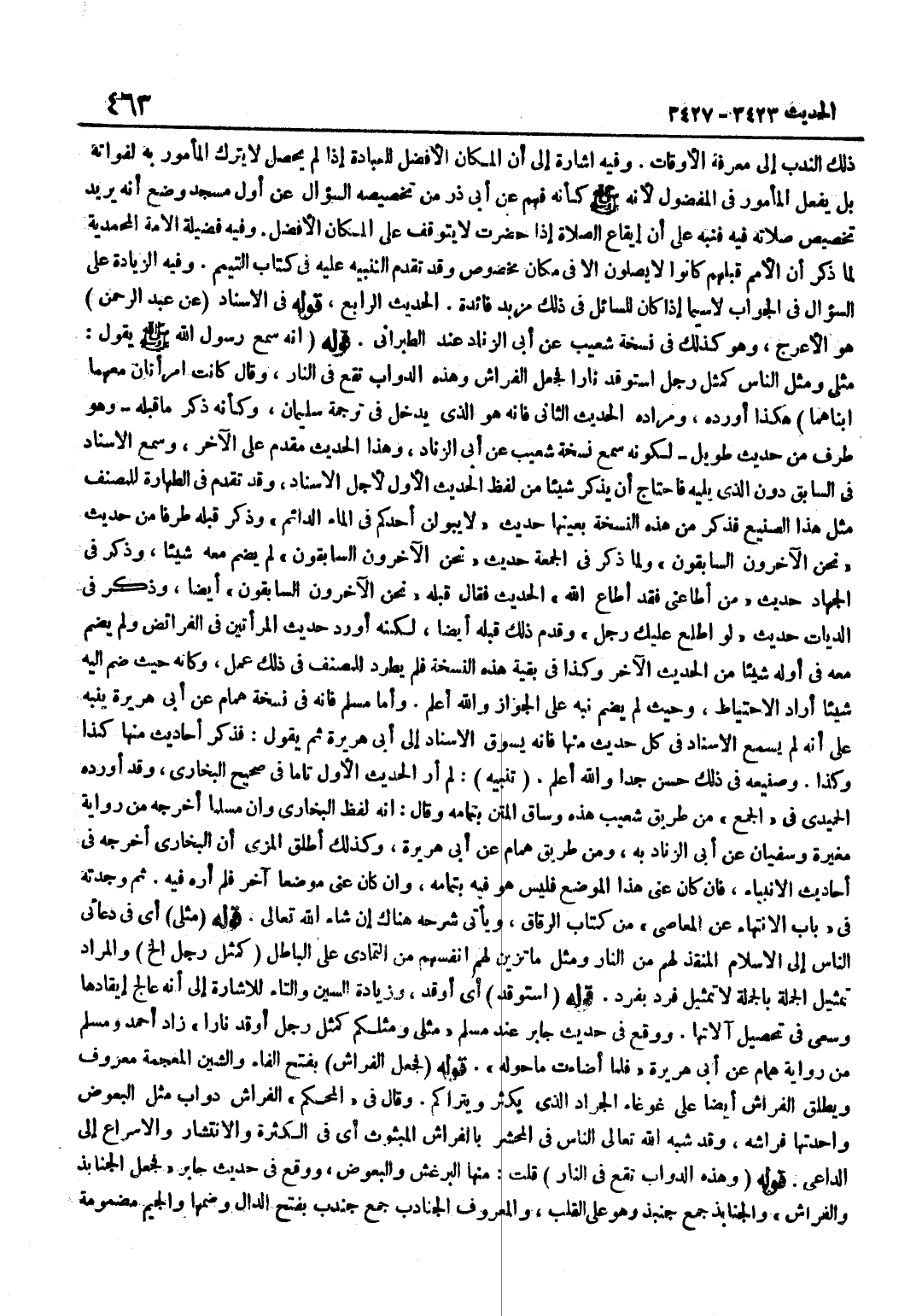 [3426] عَنْ عَبْدِ الرَّحْمَنِ هُوَ الْأَعْرَجُ وَهُوَ كَذَلِكَ فِي نُسْخَةِ شُعَيْبٍ عَنْ أَبِي الزِّنَادِ عِنْدَ الطَّبَرَانِيِّ قَوْلُهُ أَنَّهُ سَمِعَ رَسُولَ اللَّهِ صَلَّى اللَّهُ عَلَيْهِ وَسَلَّمَ يَقُولُ مَثَلِي وَمَثَلُ النَّاسِ كَمَثَلِ رَجُلٍ اسْتَوْقَدَ نَارًا فَجَعَلَ الْفَرَاشُ وَهَذِهِ الدَّوَابُّ تَقَعُ فِي النَّارِ وَقَالَ كَانَتِ امْرَأَتَانِ مَعَهُمَا ابْنَاهُمَا هَكَذَا أَوْرَدَهُ وَمُرَادُهُ الْحَدِيثُ الثَّانِي فَإِنَّهُ هُوَ الَّذِي يَدْخُلُ فِي تَرْجَمَةِ سُلَيْمَانَ وَكَأَنَّهُ ذَكَرَ مَا قَبْلَهُ وَهُوَ طَرَفٌ مِنْ حَدِيثٍ طَوِيلٍ لِكَوْنِهِ سَمِعَ نُسْخَةَ شُعَيْبٍ عَنْ أَبِي الزِّنَادِ وَهَذَا الْحَدِيثُ مُقَدَّمٌ عَلَى الْآخَرِ وَسَمِعَ الْإِسْنَادَ فِي السَّابِقِ دُونَ الَّذِي يَلِيهِ فَاحْتَاجَ أَنْ يَذْكُرَ شَيْئًا مِنْ لَفْظِ الْحَدِيثِ الْأَوَّلِ لِأَجْلِ الْإِسْنَادِ وَقَدْ تَقَدَّمَ فِي الطَّهَارَةِ لِلْمُصَنِّفِ مِثْلُ هَذَا الصَّنِيعِ فَذَكَرَ مِنْ هَذِهِ النُّسْخَةِ بِعَيْنِهَا حَدِيثَ لَا يَبُولَنَّ أَحَدُكُمْ فِي الْمَاءِ الدَّائِمِ وَذَكَرَ قَبْلَهُ طَرَفًا مِنْ حَدِيثِ نَحْنُ الْآخِرُونَ السَّابِقُونَ وَلَمَّا ذَكَرَ فِي الْجُمُعَةِ حَدِيثَ نَحْنُ الْآخِرُونَ السَّابِقُونَ لَمْ يَضُمَّ مَعَهُ شَيْئًا وَذَكَرَ فِي الْجِهَادِ حَدِيثَ مَنْ أَطَاعَنِي فَقَدْ أَطَاعَ اللَّهَ الْحَدِيثَ فَقَالَ قَبْلَهُ نَحْنُ الْآخِرُونَ السَّابِقُونَ أَيْضًا وَذَكَرَ فِي الدِّيَاتِ حَدِيثَ لَوِ اطَّلَعَ عَلَيْكَ رَجُلٌ وَقَدَّمَ ذَلِكَ قَبْلَهُ أَيْضًا لَكِنَّهُ أَوْرَدَ حَدِيثَ الْمَرْأَتَيْنِ فِي الْفَرَائِضِ وَلَمْ يَضُمَّ مَعَهُ فِي أَوَّلِهِ شَيْئًا مِنَ الْحَدِيثِ الْآخَرِ وَكَذَا فِي بَقِيَّةِ هَذِهِ النُّسْخَةِ فَلَمْ يَطَّرِدْ لِلْمُصَنِّفِ فِي ذَلِكَ عَمَلٌ وَكَأَنَّهُ حَيْثُ ضَمَّ إِلَيْهِ شَيْئًا أَرَادَ الِاحْتِيَاطَ وَحَيْثُ لَمْ يَضُمَّ نَبَّهَ عَلَى الْجَوَازِ وَاللَّهُ أَعْلَمُ وَأَمَّا مُسْلِمٌ فَإِنَّهُ فِي نُسْخَةِ هَمَّامٍ عَنْ أَبِي هُرَيْرَةَ يُنَبِّهُ عَلَى أَنَّهُ لَمْ يَسْمَعِ الْإِسْنَادَ فِي كُلِّ حَدِيثٍ مِنْهَا فَإِنَّهُ يَسُوقُ الْإِسْنَادَ إِلَى أَبِي هُرَيْرَةَ ثُمَّ يَقُولُ فَذَكَرَ أَحَادِيثَ مِنْهَا كَذَا وَكَذَا وَصَنِيعُهُ فِي ذَلِكَ حَسَنٌ جِدًّا وَاللَّهُ أَعْلَمُ تَنْبِيهٌ لَمْ أَرَ الْحَدِيثَ الْأَوَّلَ تَامًّا فِي صَحِيحِ الْبُخَارِيِّ وَقَدْ أَوْرَدَهُ الْحُمَيْدِيُّ فِي الْجَمْعِ مِنْ طَرِيقِ شُعَيْبٍ هَذِهِ وَسَاقَ الْمَتْنَ بِتَمَامِهِ وَقَالَ إِنَّهُ لَفْظُ الْبُخَارِيِّ وَإِنَّ مُسْلِمًا أَخْرَجَهُ مِنْ رِوَايَةِ مُغِيرَةَ وَسُفْيَانَ عَنْ أَبِي الزِّنَادِ بِهِ وَمِنْ طَرِيقِ هَمَّامٍ عَنْ أَبِي هُرَيْرَةَ وَكَذَلِكَ أَطْلَقَ الْمِزِّيُّ أَنَّ الْبُخَارِيَّ أَخْرَجَهُ فِي أَحَادِيثِ الْأَنْبِيَاءِ فَإِنْ كَانَ عَنَى هَذَا الْمَوْضِعَ فَلَيْسَ هُوَ فِيهِ بِتَمَامِهِ وَإِنْ كَانَ عَنَى مَوْضِعًا آخَرَ فَلَمْ أَرَهُ فِيهِ ثُمَّ وَجَدْتُهُ فِي بَابِ الِانْتِهَاءِ عَنِ الْمَعَاصِي مِنْ كِتَابِ الرِّقَاقِ وَيَأْتِي شَرْحُهُ هُنَاكَ إِنْ شَاءَ اللَّهُ تَعَالَى قَوْلُهُ مَثَلِي أَيْ فِي دُعَائِيَ النَّاسَ إِلَى الْإِسْلَامِ الْمُنْقِذِ لَهُمْ مِنَ النَّارِ وَمَثَلُ مَا تُزَيِّنُ لَهُمْ أَنْفُسُهُمْ مِنَ التَّمَادِي عَلَى الْبَاطِلِ كَمَثَلِ رَجُلٍ إِلَخْ وَالْمُرَادُ تَمْثِيلُ الْجُمْلَةِ بِالْجُمْلَةِ لَا تَمْثِيلَ فَرْدٍ بِفَرْدٍ قَوْلُهُ اسْتَوْقَدَ أَيْ أَوْقَدَ وَزِيَادَةُ السِّينِ وَالتَّاءِ لِلْإِشَارَةِ إِلَى أَنَّهُ عَالَجَ إِيقَادَهَا وَسَعَى فِي تَحْصِيلِ آلَ
