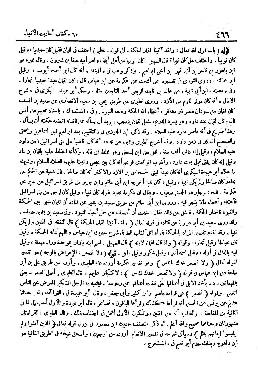 اخْتُلِفَ فِي لُقْمَانَ فَقِيلَ كَانَ حَبَشِيًّا وَقِيلَ كَانَ نُوبِيًّا وَاخْتُلِفَ هَلْ كَانَ نَبِيًّا قَالَ السُّهَيْلِيُّ كَانَ نُوبِيًّا مِنْ أَهْلِ أَيْلَةَ وَاسْمُ أَبِيهِ عنقًا بْنُ شيرون وَقَالَ غَيْرُهُ هُوَ بن بأعور بن ناحر بن آزر فَهُوَ بن أَخِي إِبْرَاهِيمَ وَذَكَرَ وَهْبٌ فِي الْمُبْتَدَإِ أَنَّهُ كَانَ بن أُخْت أَيُّوب وَقيل بن خَالَتِهِ وَرَوَى الثَّوْرِيُّ فِي تَفْسِيرِهِ عَنْ أَشْعَثَ عَن عِكْرِمَة عَن بن عَبَّاسٍ قَالَ كَانَ لُقْمَانُ عَبْدًا حَبَشِيًّا نَجَّارًا وَفِي مُصَنف بن أَبِي شَيْبَةَ عَنْ خَالِدِ بْنِ ثَابِتٍ الرَّبَعِيِّ أَحَدِ التَّابِعِينَ مِثْلُهُ وَحَكَى أَبُو عُبَيْدٍ الْبَكْرِيُّ فِي شَرْحِ الْأَمَالِي أَنَّهُ كَانَ مَوْلًى لِقَوْمٍ مِنَ الْأَزْدِ وَرَوَى الطَّبَرِيُّ مِنْ طَرِيقِ يَحْيَى بْنِ سَعِيدٍ الْأَنْصَارِيِّ عَنْ سَعِيدِ بْنِ الْمُسَيَّبِ كَانَ لُقْمَان من سودان مصر ذومشافر أَعْطَاهُ اللَّهُ الْحِكْمَةَ وَمَنَعَهُ النُّبُوَّةَ وَفِي الْمُسْتَدْرَكِ بِإِسْنَادٍ صَحِيحٍ عَنْ أَنَسٍ قَالَ كَانَ لُقْمَانُ عِنْدَ دَاوُدَ وَهُوَ يَسْرُدُ الدِّرْعَ فَجَعَلَ لُقْمَانُ يَتَعَجَّبُ وَيُرِيدُ أَنْ يَسْأَلَهُ عَنْ فَائِدَتِهِ فَتَمْنَعُهُ حِكْمَتُهُ أَنْ يَسْأَلَ وَهَذَا صَرِيحٌ فِي أَنَّهُ عاصر دَاوُد عَلَيْهِ السَّلَام وَقد ذكره بن الْجَوْزِيِّ فِي التَّلْقِيحِ بَعْدَ إِبْرَاهِيمَ قَبْلَ إِسْمَاعِيلَ وَإِسْحَاقَ وَالصَّحِيحُ أَنَّهُ كَانَ فِي زَمَنِ دَاوُدَ وَقَدْ أَخْرَجَ الطَّبَرِيُّ وَغَيْرُهُ عَنْ مُجَاهِدٍ أَنَّهُ كَانَ قَاضِيًا عَلَى بَنِي إِسْرَائِيلَ زَمَنَ دَاوُدَ عَلَيْهِ السَّلَامُ وَقِيلَ إِنَّهُ عَاشَ أَلْفَ سَنَةٍ نقل عَن بن إِسْحَاقَ وَهُوَ غَلَطٌ مِمَّنْ قَالَهُ وَكَأَنَّهُ اخْتَلَطَ عَلَيْهِ بِلُقْمَانَ بْنِ عَادٍ وَقِيلَ إِنَّهُ كَانَ يُفْتِي قَبْلَ بَعْثِ دَاوُدَ وَأَغْرَبَ الْوَاقِدِيُّ فَزَعَمَ أَنَّهُ كَانَ بَيْنَ عِيسَى وَنَبِيِّنَا عَلَيْهِمَا الصَّلَاةُ وَالسَّلَامُ وَشُبْهَتُهُ مَا حَكَاهُ أَبُو عُبَيْدَةَ الْبَكْرِيُّ أَنَّهُ كَانَ عَبْدًا لِبَنِي الْحِسْحَاسِ بْنِ الْأَزْدِ وَالْأَكْثَرُ أَنَّهُ كَانَ صَالِحًا قَالَ شُعْبَةُ عَنِ الْحَكَمِ عَنْ مُجَاهِدٍ كَانَ صَالِحًا وَلَمْ يَكُنْ نَبيا وَقيل كَانَ نَبيا أخرجه بن أبي حَاتِم وبن جَرِيرٍ مِنْ طَرِيقِ إِسْرَائِيلَ عَنْ جَابِرٍ عَنْ عِكْرِمَةَ قُلْتُ وَجَابِرٌ هُوَ الْجُعْفِيُّ ضَعِيفٌ وَيُقَالُ إِنَّ عِكْرِمَةَ تَفَرَّدَ بِقَوْلِهِ كَانَ نَبِيًّا وَقِيلَ كَانَ لِرَجُلٍ مِنْ بَنِي إِسْرَائِيلَ فَأَعْتَقَهُ وَأَعْطَاهُ مَا لَا يتجر فِيهِ وروى بن أَبِي حَاتِمٍ مِنْ طَرِيقِ سَعِيدِ بْنِ بَشِيرٍ عَنْ قَتَادَةَ أَنَّ لُقْمَانَ خُيِّرَ بَيْنَ الْحِكْمَةِ وَالنُّبُوَّةِ فَاخْتَارَ الْحِكْمَةَ فَسُئِلَ عَنْ ذَلِكَ فَقَالَ خِفْتُ أَنْ أَضْعُفَ عَنْ حَمْلِ أَعْبَاءِ النُّبُوَّةِ وَفِي سَعِيدِ بْنِ بَشِيرٍ ضَعْفٌ وَقَدْ رَوَى سَعِيدُ بْنُ أَبِي عَرُوبَةَ عَنْ قَتَادَةَ فِي قَوْله تَعَالَى وَلَقَد آتَيْنَا لُقْمَان الْحِكْمَة قَالَ التَّفَقُّهَ فِي الدِّينِ وَلَمْ يَكُنْ نَبِيًّا وَقَدْ تَقَدَّمَ تَفْسِيرُ الْمُرَادِ بِالْحِكْمَةِ فِي أَوَائِلِ كتاب الْعلم فِي شرح حَدِيث بن عَبَّاسٍ اللَّهُمَّ عَلِّمْهُ الْحِكْمَةَ وَقِيلَ كَانَ خَيَّاطًا وَقِيلَ نَجَّارًا وَقَوْلُهُ وَإِذْ قَالَ لُقْمَانُ لِابْنِهِ قَالَ السُّهَيْلِيُّ اسْمُ ابْنِهِ بَارَانُ بِمُوَحَّدَةٍ وَرَاءٍ مُهْمَلَةٍ وَقِيلَ فِيهِ بِالدَّالِ فِي أَوَّلِهِ وَقِيلَ اسْمُهُ أَنْعَمُ وَقِيلَ شَكُورٌ وَقِيلَ بَابِلِيٌّ قَوْلُهُ وَلَا تُصَعِّرْ الْإِعْرَاضُ بِالْوَجْهِ هُوَ تَفْسِيرٌ لِقَوْل