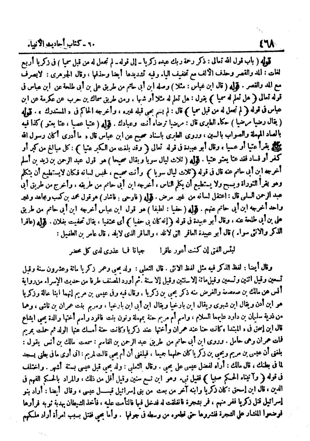 فِي زَكَرِيَّا أَرْبَعُ لُغَاتٍ الْمَدُّ وَالْقَصْرُ وَحَذْفُ الْأَلْفِ مَعَ تَخْفِيفِ الْيَاءِ وَفِيهِ تَشْدِيدُهَا أَيْضًا وَحَذْفُهَا وَقَالَ الْجَوْهَرِيُّ لَا يُصْرَفُ مَعَ الْمَدِّ وَالْقصر قَوْله قَالَ بن عَبَّاس مثلا وَصله بن أَبِي حَاتِمٍ مِنْ طَرِيقِ عَلِيِّ بْنِ أَبِي طَلْحَةَ عَنِ بْنِ عَبَّاسٍ فِي قَوْلِهِ تَعَالَى هَلْ تَعْلَمُ لَهُ سميا يَقُولُ هَلْ تَعْلَمُ لَهُ مِثْلًا أَوْ شَبَهًا وَمِنْ طَرِيقِ سِمَاكِ بْنِ حَرْبٍ عَنْ عِكْرِمَةَ عَنِ بن عَبَّاسٍ فِي قَوْلِهِ لَمْ نَجْعَلْ لَهُ مِنْ قبل سميا قَالَ لَمْ يُسَمَّ يَحْيَى قَبْلَهُ غَيْرَهُ وَأَخْرَجَهُ الْحَاكِمُ فِي الْمُسْتَدْرَكِ قَوْلُهُ يُقَالُ رَضِيًّا مَرْضِيًّا حَكَاهُ الطَّبَرِيُّ قَالَ مَرْضِيًّا تَرْضَاهُ أَنْتَ وَعِبَادُكَ قَوْلُهُ عِتِيًّا عِصِيًّا عَتَا يَعْتُو كَذَا فِيهِ بِالصَّادِ الْمُهْمَلَةِ وَالصَّوَابُ بِالسِّينِ وَرَوَى الطَّبَرِيُّ بِإِسْنَادٍ صَحِيح عَن بن عَبَّاسٍ قَالَ مَا أَدْرِي أَكَانَ رَسُولُ اللَّهِ صَلَّى اللَّهُ عَلَيْهِ وَسَلَّمَ يَقْرَأُ عِتِيًّا أَوْ عِسِيًّا وَقَالَ أَبُو عُبَيْدَةَ فِي قَوْلِهِ تَعَالَى وَقد بلغت من الْكبر عتيا كُلُّ مُبَالِغٍ مِنْ كِبْرٍ أَوْ كُفْرٍ أَوْ فَسَادٍ فَقَدْ عَتَا يَعْتُو عِتِيًّا قَوْلُهُ ثَلَاثَ لَيَال سويا وَيُقَالُ صَحِيحًا هُوَ قَوْلُ عَبْدِ الرَّحْمَنِ بْنِ زيد بن أسلم أخرجه بن أَبِي حَاتِمٍ عَنْهُ قَالَ فِي قَوْلِهِ ثَلَاثَ لَيَال سويا وَأَنْتَ صَحِيحٌ فَحُبِسَ لِسَانُهُ فَكَانَ لَا يَسْتَطِيعُ أَنْ يَتَكَلَّمَ وَهُوَ يَقْرَأُ التَّوْرَاةَ وَيُسَبِّحُ وَلَا يَسْتَطِيع أَن يكلم النَّاس أخرجه بن أَبِي حَاتِمٍ مِنْ طَرِيقِهِ وَأَخْرَجَ مِنْ طَرِيقِ أَبِي عَبْدِ الرَّحْمَنِ السُّلَمِيِّ قَالَ اعْتُقِلَ لِسَانُهُ مِنْ غَيْرِ مَرَضٍ قَوْلُهُ فَأَوْحَى فَأَشَارَ هُوَ قَوْلُ مُحَمَّدِ بْنِ كَعْبٍ وَمُجَاهِدٍ وَغَيْرِ وَاحِدٍ أخرجه بن أَبِي حَاتِمٍ عَنْهُمْ قَوْلُهُ حَفِيًّا لَطِيفًا هُوَ قَول بن عَبَّاس أخرجه بن أَبِي حَاتِمٍ مِنْ طَرِيقِ عَلِيِّ بْنِ أَبِي طَلْحَةَ عَنْهُ وَقَالَ أَبُو عُبَيْدَةَ فِي قَوْلِهِ إِنَّه كَانَ بِي حفيا أَيْ مُحْتَفِيَا يُقَالُ تَحَفَّيْتُ بِفُلَانٍ قَوْلُهُ عَاقِرًا الذَّكَرُ وَالْأُنْثَى سَوَاءٌ قَالَ أَبُو عُبَيْدَةَ الْعَاقِرُ الَّتِي لَا تَلِدُ وَالْعَاقِرُ الَّذِي لَا يَلِدُ قَالَ عَامِرُ بْنُ الطُّفَيْلِ لَبِئْسَ الْفَتَى إِنْ كنت أَعْوَرَ عَاقِرًا جَبَانًا فَمَا عُذْرِي لَدَى كُلِّ مَحْضَرِ وَقَالَ أَيْضًا لَفْظُ الذَّكَرِ فِيهِ مِثْلُ لَفْظِ الْأُنْثَى قَالَ الثَّعْلَبِيُّ وُلِدَ يَحْيَى وَعَمَّرَ زَكَرِيَّا مائَة وَعِشْرُونَ سَنَةً وَقِيلَ تِسْعِينَ وَقِيلَ اثْنَيْنِ وَتِسْعِينَ وَقِيلَ مِائَةً إِلَّا سَنَتَيْنِ وَقِيلَ إِلَّا سَنَةً ثُمَّ أَوْرَدَ الْمُصَنِّفُ طَرَفًا مِنْ حَدِيثِ الْإِسْرَاءِ مِنْ رِوَايَةِ أَنَسٍ عَنْ مَالِكِ بْنِ صَعْصَعَةَ وَالْغَرَضُ مِنْهُ ذِكْرُ يَحْيَى بْنِ زَكَرِيَّا وَقَالَ فِيهِ وَفِي عِيسَى بن مَرْيَم إنَّهُمَا ابْنا خَالَة وزَكَرِيا هُوَ بن ادن وَيُقَال بن شبوي وَيُقَال بن بارخيا وَيُقَال بن أبي بن بَارْخِيَا وَمَرْيَمُ بِنْتُ عِمْرَانَ بْنِ نَاشِي وَهُمَا مِنْ ذُرِّيَّةِ سُلَيْمَانَ بْنِ دَاوُدَ عَلَيْهِمَا السَّلَامُ وَاسْمُ أُمِّ مَرْيَمَ حِنَةُ بِمُهْمَلَةٍ وَنُونٍ بِنْتُ فَاقُودَ وَاسْمُ أُخْتِهَا وَالِدَةُ يَحْيَى إِيشَاعُ قَالَ بن إِسْحَاقَ فِي الْمُبْتَدَإِ كَانَتْ حِنَةُ عِنْدَ عِمْرَانَ وَأُخْتُهَا عِنْدَ زَكَرِيَّا وَكَانَتْ حِنَةُ أَمْسَكَ عَنْهَا الْوَلَدُ ثُمَّ حَمَلَتْ بِمَرْيَمَ فَمَاتَ عِمْرَانُ وَهِيَ حَامِل وروى بن أَبِي حَاتِمٍ مِن