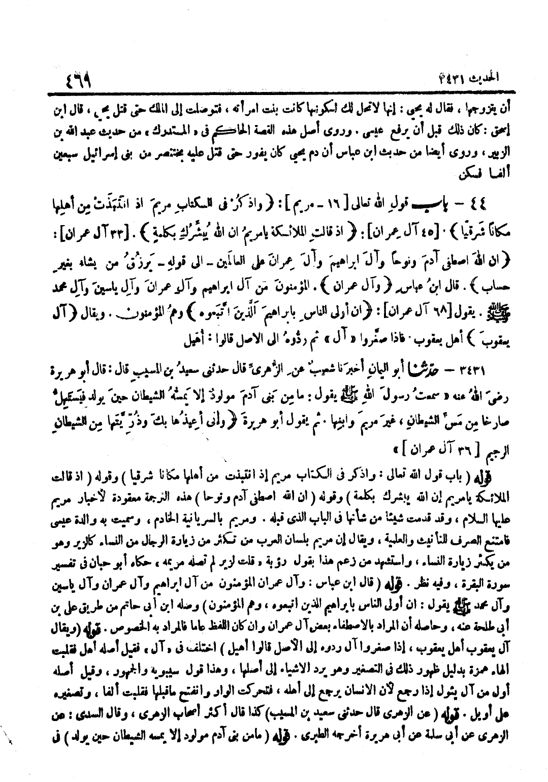 وَقَوْلُهُ إِذْ قَالَتِ الْمَلَائِكَةُ يَا مَرْيَمُ إِنَّ الله يبشرك بِكَلِمَة وَقَوله ان الله اصْطفى آدم ونوحا هَذِهِ التَّرْجَمَةُ مَعْقُودَةٌ لِأَخْبَارِ مَرْيَمَ عَلَيْهَا السَّلَامُ وَقَدْ قَدَّمْتُ شَيْئًا مِنْ شَأْنِهَا فِي الْبَابِ الَّذِي قَبْلَهُ وَمَرْيَمُ بِالسُّرْيَانِيَّةِ الْخَادِمُ وَسُمِّيتْ بِهِ وَالِدَةُ عِيسَى فَامْتَنَعَ الصَّرْفُ لِلتَّأْنِيثِ وَالْعَلَمِيَّةِ وَيُقَالُ إِنَّ مَرْيَمَ بِلِسَانِ الْعَرَبِ مَنْ تُكْثِرُ مِنْ زِيَارَةِ الرِّجَالِ مِنَ النِّسَاءِ كَالزِّيرِ وَهُوَ مَنْ يُكْثِرُ زِيَارَةَ النِّسَاءِ وَاسْتَشْهَدَ مَنْ زَعَمَ هَذَا بِقَوْلِ رُؤْبَةَ قُلْتُ لِزِيرٍ لَمْ تَصِلْهُ مَرْيَمُهُ حَكَاهُ أَبُو حبَان فِي تَفْسِيرِ سُورَةِ الْبَقَرَةِ وَفِيهِ نَظَرٌ قَوْلُهُ قَالَ بن عَبَّاسٍ وَآلُ عِمْرَانَ الْمُؤْمِنُونَ مِنْ آلِ إِبْرَاهِيمَ وَآلِ عِمْرَانَ وَآلِ يَاسِينَ وَآلِ مُحَمَّدٍ صَلَّى الله عَلَيْهِ وَسلم يَقُولَانِ أولى النَّاس بإبراهيم الَّذين اتَّبعُوهُ وهم الْمُؤْمِنُونَ وَصله بن أَبِي حَاتِمٍ مِنْ طَرِيقِ عَلِيِّ بْنِ أَبِي طَلْحَةَ عَنْهُ وَحَاصِلُهُ أَنَّ الْمُرَادَ بِالِاصْطِفَاءِ بَعْضُ آلِ عِمْرَانَ وَإِنْ كَانَ اللَّفْظُ عَامًّا فَالْمُرَادُ بِهِ الْخُصُوصُ قَوْلُهُ وَيُقَالُ آلُ يَعْقُوبَ أَهْلُ يَعْقُوبَ إِذَا صَغَّرُوا آلَ رَدُّوهُ إِلَى الْأَصْلِ قَالُوا أُهَيْلُ اخْتُلِفَ فِي آلَ فَقِيلَ أَصْلُهُ أَهْلُ فَقُلِبَتِ الْهَاءُ هَمْزَةً بِدَلِيلِ ظُهُورِ ذَلِكَ فِي التَّصْغِيرِ وَهُوَ يَرُدُّ الْأَشْيَاءَ إِلَى أَصْلِهَا وَهَذَا قَوْلُ سِيبَوَيْهِ وَالْجُمْهُورِ وَقِيلَ أَصْلُهُ أَوْلُ مِنْ آلَ يَئُولُ إِذَا رَجَعَ لِأَنَّ الْإِنْسَانَ يَرْجِعُ إِلَى أَهْلِهِ فَتَحَرَّكَتِ الْوَاوُ وَانْفَتَحَ مَا قَبْلَهَا فَقُلِبَتْ أَلِفًا وَتَصْغِيرُهُ عَلَى أُوَيْلٍ