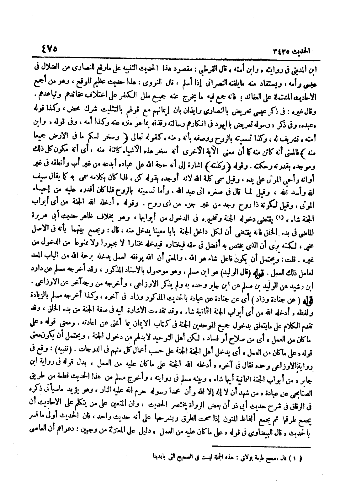 بن الْمَدِينِيّ فِي رِوَايَته وبن أَمَتِهِ قَالَ الْقُرْطُبِيُّ مَقْصُودُ هَذَا الْحَدِيثِ التَّنْبِيهُ عَلَى مَا وَقَعَ لِلنَّصَارَى مِنَ الضَّلَالِ فِي عِيسَى وَأُمِّهِ وَيُسْتَفَادُ مِنْهُ مَا يُلَقَّنُهُ النَّصْرَانِيُّ إِذَا أَسْلَمَ قَالَ النَّوَوِيُّ هَذَا حَدِيثٌ عَظِيمُ الْمَوْقِعِ وَهُوَ مِنْ أَجْمَعِ الْأَحَادِيثِ الْمُشْتَمِلَةِ عَلَى الْعَقَائِدِ فَإِنَّهُ جُمِعَ فِيهِ مَا يَخْرُجُ عَنْهُ جَمِيعُ مِلَلِ الْكُفْرِ عَلَى اخْتِلَافِ عَقَائِدِهِمْ وَتَبَاعُدِهِمْ وَقَالَ غَيْرُهُ فِي ذِكْرِ عِيسَى تَعْرِيضٌ بِالنَّصَارَى وَإِيذَانٌ بِأَنَّ إِيمَانَهُمْ مَعَ قَوْلِهِمْ بِالتَّثْلِيثِ شِرْكٌ مَحْضٌ وَكَذَا قَوْلُهُ عَبْدُهُ وَفِي ذِكْرِ رَسُولُهُ تَعْرِيضٌ بِالْيَهُودِ فِي إِنْكَارِهِمْ رِسَالَتَهُ وَقَذْفِهِ بِمَا هُوَ مُنَزَّهٌ عَنْهُ وَكَذَا أُمُّهُ وَفِي قَوْلِهِ وبن أَمَتِهِ تَشْرِيفٌ لَهُ وَكَذَا تَسْمِيَتُهُ بِالرُّوحِ وَوَصْفُهُ بِأَنَّهُ مِنْهُ كَقَوْلِهِ تَعَالَى وَسَخَّرَ لَكُمْ مَا فِي الأَرْض جَمِيعًا مِنْهُ فَالْمَعْنَى أَنَّهُ كَائِنٌ مِنْهُ كَمَا أَنَّ مَعْنَى الْآيَةِ الْأُخْرَى أَنَّهُ سَخَّرَ هَذِهِ الْأَشْيَاءَ كَائِنَةً مِنْهُ أَيْ أَنَّهُ مُكَوِّنُ كُلِّ ذَلِكَ وَمُوجِدُهُ بِقُدْرَتِهِ وَحِكْمَتِهِ وَقَوْلُهُ وَكَلِمَتُهُ إِشَارَةٌ إِلَى أَنَّهُ حُجَّةُ اللَّهِ عَلَى عِبَادِهِ أَبْدَعَهُ مِنْ غَيْرِ أَب وأنطقه فِي غير أَوَانه وأحيى الْمَوْتَى عَلَى يَدِهِ وَقِيلَ سُمِّيَ كَلِمَةَ اللَّهِ لِأَنَّهُ أَوْجَدَهُ بِقَوْلِهِ كُنْ فَلَمَّا كَانَ بِكَلَامِهِ سُمِّيَ بِهِ كَمَا يُقَالُ سَيْفُ اللَّهِ وَأَسَدُ اللَّهِ وَقِيلَ لِمَا قَالَ فِي صِغَرِهِ إِنِّي عَبْدُ اللَّهِ وَأَمَّا تَسْمِيَتُهُ بِالرُّوحِ فَلِمَا كَانَ أَقْدَرَهُ عَلَيْهِ مِنْ إِحْيَاءِ الْمَوْتَى وَقِيلَ لِكَوْنِهِ ذَا رُوحٍ وُجِدَ مِنْ غَيْرِ جُزْءٍ مِنْ ذِي رُوحٍ وَقَوْلُهُ أَدْخَلَهُ اللَّهُ الْجَنَّةَ مِنْ أَي أَبْوَاب الْجنَّة شَاءَ يَقْتَضِي دُخُولَهُ الْجَنَّةَ وَتَخْيِيرَهُ فِي الدُّخُولِ مِنْ أَبْوَابِهَا وَهُوَ بِخِلَافِ ظَاهِرِ حَدِيثِ أَبِي هُرَيْرَةَ الْمَاضِي فِي بَدْءِ الْخَلْقِ فَإِنَّهُ يَقْتَضِي أَنَّ لِكُلِّ دَاخِلٍ الْجَنَّةَ بَابًا مُعَيَّنًا يَدْخُلُ مِنْهُ قَالَ وَيُجْمَعُ بَيْنَهُمَا بِأَنَّهُ فِي الْأَصْلِ مُخَيَّرٌ لَكِنَّهُ يَرَى أَنَّ الَّذِي يَخْتَصُّ بِهِ أَفْضَلُ فِي حَقِّهِ فَيَخْتَارُهُ فَيَدْخُلُهُ مُخْتَارًا لَا مَجْبُورًا وَلَا مَمْنُوعًا مِنَ الدُّخُولِ مِنْ غَيْرِهِ قُلْتُ وَيُحْتَمَلُ أَنْ يَكُونَ فَاعِلُ شَاءَ هُوَ اللَّهُ وَالْمَعْنَى أَنَّ اللَّهَ يُوَفِّقُهُ لِعَمَلٍ يُدْخِلُهُ بِرَحْمَةِ اللَّهِ مِنَ الْبَابِ الْمُعَدِّ لِعَامِلِ ذَلِكَ الْعَمَلِ قَوْله قَالَ الْوَلِيد هُوَ بن مُسْلِمٍ وَهُوَ مَوْصُولٌ بِالْإِسْنَادِ الْمَذْكُورِ وَقَدْ أَخْرَجَهُ مُسْلِمٌ عَنْ دَاوُدَ بْنِ رُشَيْدٍ عَنِ الْوَلِيدِ بْنِ مُسلم عَن بن جَابِرٍ وَحَدَّهُ بِهِ وَلَمْ يَذْكُرِ الْأَوْزَاعِيَّ وَأَخْرَجَهُ مِنْ وَجْهٍ آخَرَ عَنِ الْأَوْزَاعِيِّ قَوْلُهُ عَنْ جُنَادَةَ وَزَادَ أَيْ عَنْ جُنَادَةَ عَنْ عُبَادَةَ بِالْحَدِيثِ الْمَذْكُورِ وَزَادَ فِي آخِرِهِ وَكَذَا أَخْرَجَهُ مُسْلِمٌ بِالزِّيَادَةِ وَلَفْظُهُ أَدْخَلَهُ اللَّهُ مِنْ أَيِّ أَبْوَابِ الْجَنَّةِ الثَّمَانِيَةِ شَاءَ وَقَدْ تَقَدَّمَتِ الْإِشَارَةُ إِلَيْهِ فِي صِفَةِ الْجَنَّةِ مِنْ بَدْءِ الْخَلْقِ وَقَدْ تَقَدَّمَ الْكَلَامُ عَلَى مَا يَتَعَلَّقُ بِدُخُولِ جَمِيعِ الْمُوَحِّدِينَ الْجَنَّةَ فِي كِتَابِ الْإِيمَانِ بِمَا أَغْنَى عَنْ إِعَادَتِهِ وَمَعْنَى قَوْلِ