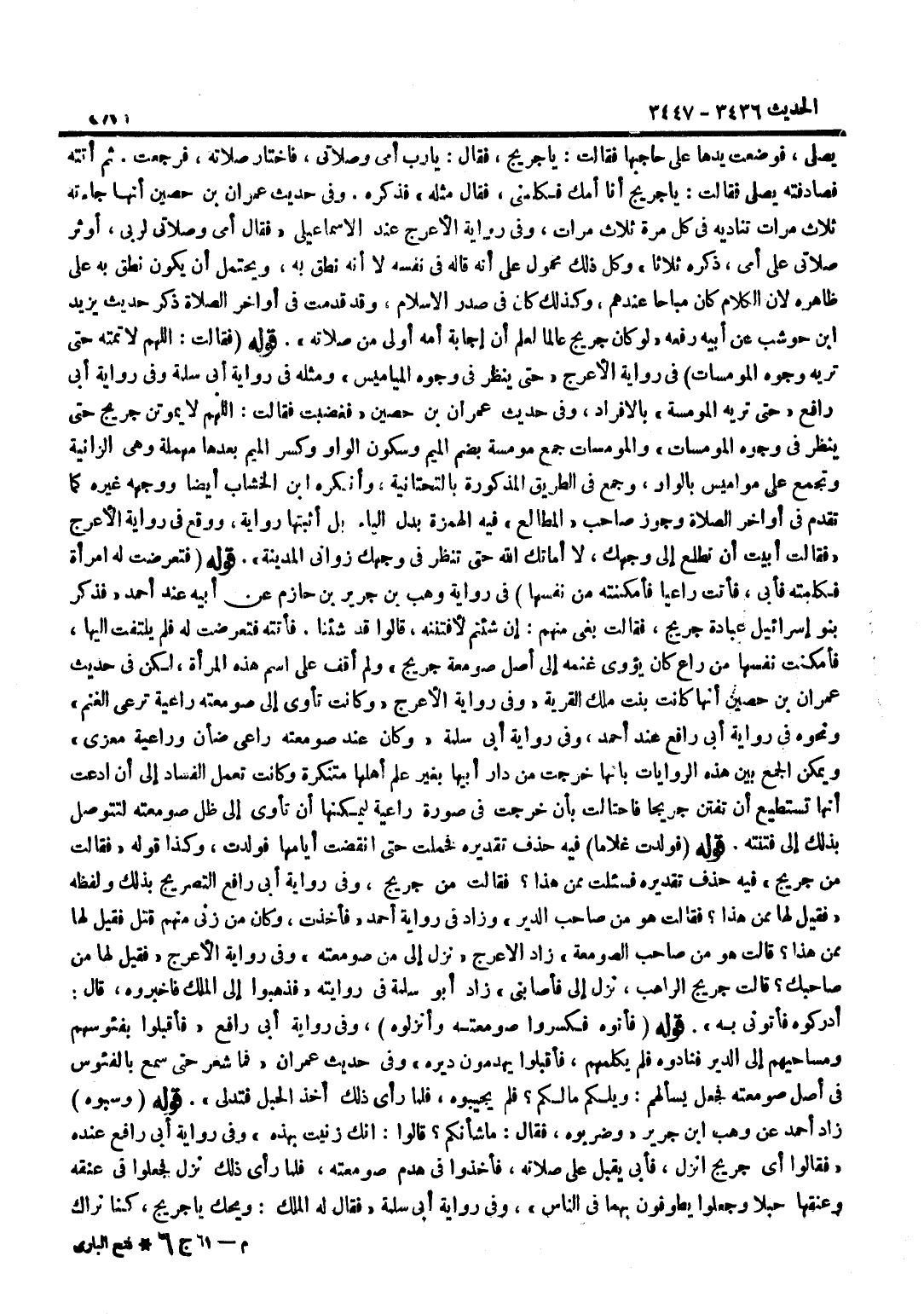 يُصَلِّي فَوَضَعَتْ يَدَهَا عَلَى حَاجِبِهَا فَقَالَتْ يَا جُرَيْجُ فَقَالَ يَا رَبِّ أُمِّي وَصَلَاتِي فَاخْتَارَ صَلَاتَهُ فَرَجَعَتْ ثُمَّ أَتَتْهُ فَصَادَفَتْهُ يُصَلِّي فَقَالَتْ يَا جُرَيْجُ أَنَا أُمُّكَ فَكَلِّمْنِي فَقَالَ مِثْلَهُ فَذَكَرَهُ وَفِي حَدِيثِ عِمْرَانَ بْنِ حُصَيْنٍ أَنَّهَا جَاءَتْهُ ثَلَاثَ مَرَّاتٍ تُنَادِيهِ فِي كُلِّ مَرَّةٍ ثَلَاثَ مَرَّاتٍ وَفِي رِوَايَةِ الْأَعْرَجِ عِنْدَ الْإِسْمَاعِيلِيِّ فَقَالَ أُمِّي وَصَلَاتِي لِرَبِّي أُوثِرُ صَلَاتِي عَلَى أُمِّي ذَكَرَهُ ثَلَاثًا وَكُلُّ ذَلِكَ مَحْمُولٌ عَلَى أَنَّهُ قَالَهُ فِي نَفْسِهِ لَا أَنَّهُ نَطَقَ بِهِ وَيُحْتَمَلُ أَنْ يَكُونَ نَطَقَ بِهِ عَلَى ظَاهِرِهِ لِأَنَّ الْكَلَامَ كَانَ مُبَاحًا عِنْدَهُمْ وَكَذَلِكَ كَانَ فِي صَدْرِ الْإِسْلَامِ وَقَدْ قَدَّمْتُ فِي أَوَاخِرِ الصَّلَاةِ ذِكْرَ حَدِيثِ يَزِيدَ بْنِ حَوْشَبٍ عَنْ أَبِيهِ رَفَعَهُ لَوْ كَانَ جُرَيْجٌ عَالِمًا لَعَلِمَ أَنَّ إِجَابَةَ أُمِّهِ أَوْلَى مِنْ صَلَاتِهِ قَوْلُهُ فَقَالَتْ اللَّهُمَّ لَا تُمِتْهُ حَتَّى تُرِيَهُ وُجُوه المومسات وَفِي رِوَايَةِ الْأَعْرَجِ حَتَّى يَنْظُرَ فِي وُجُوهِ الْمَيَامِيسِ وَمِثْلُهُ فِي رِوَايَةِ أَبِي سَلَمَةَ وَفِي رِوَايَةِ أَبِي رَافِعٍ حَتَّى تُرِيَهُ الْمُومِسَةَ بِالْإِفْرَادِ وَفِي حَدِيثِ عِمْرَانَ بْنِ حُصَيْنٍ فَغَضِبَتْ فَقَالَتْ اللَّهُمَّ لَا يَمُوتَنَّ جُرَيْجٌ حَتَّى يَنْظُرَ فِي وُجُوهِ الْمُومِسَاتِ وَالْمُومِسَاتُ جَمْعُ مُومِسَةٍ بِضَمِّ الْمِيمِ وَسُكُونِ الْوَاوِ وَكَسْرِ الْمِيمِ بَعْدَهَا مُهْمَلَةٌ وَهِيَ الزَّانِيَةُ وَتُجْمَعُ عَلَى مَوَامِيسَ بِالْوَاوِ وَجُمِعَ فِي الطَّرِيقِ الْمَذْكُورَة بالتحتانية وَأنْكرهُ بن الْخَشَّابِ أَيْضًا وَوَجَّهَهُ غَيْرُهُ كَمَا تَقَدَّمَ فِي أَوَاخِرِ الصَّلَاةِ وَجَوَّزَ صَاحِبُ الْمَطَالِعِ فِيهِ الْهَمْزَةَ بَدَلَ الْيَاءِ بَلْ أَثْبَتَهَا رِوَايَةً وَوَقَعَ فِي رِوَايَةِ الْأَعْرَجِ فَقَالَتْ أَبَيْتَ أَنْ تُطْلِعَ إِلَيَّ وَجْهَكَ لَا أَمَاتَكَ اللَّهُ حَتَّى تَنْظُرَ فِي وَجْهِكَ زَوَانِي الْمَدِينَةِ قَوْلُهُ فَتَعَرَّضَتْ لَهُ امْرَأَةٌ فَكَلَّمَتْهُ فَأَبَى فَأَتَتْ رَاعِيًا فَأَمْكَنَتْهُ مِنْ نَفْسِهَا وَفِي رِوَايَةِ وَهْبِ بْنِ جَرِيرِ بْنِ حَازِمٍ عَنْ أَبِيهِ عِنْدَ أَحْمَدَ فَذَكَرَ بَنُو إِسْرَائِيلَ عِبَادَةَ جُرَيْجٍ فَقَالَتْ بَغِيٌّ مِنْهُمْ إِنْ شِئْتُمْ لَأَفْتِنَنَّهُ قَالُوا قَدْ شِئْنَا فَأَتَتْهُ فَتَعَرَّضَتْ لَهُ فَلَمْ يَلْتَفِتْ إِلَيْهَا فَأَمْكَنَتْ نَفْسَهَا مِنْ رَاعٍ كَانَ يؤوي غَنَمَهُ إِلَى أَصْلِ صَوْمَعَةِ جُرَيْجٍ وَلَمْ أَقِفْ عَلَى اسْمِ هَذِهِ الْمَرْأَةِ لَكِنْ فِي حَدِيثِ عِمْرَانَ بْنِ حُصَيْنٍ أَنَّهَا كَانَتْ بِنْتَ مَلِكِ الْقَرْيَةِ وَفِي رِوَايَةِ الْأَعْرَجِ وَكَانَتْ تَأْوِي إِلَى صَوْمَعَتِهِ رَاعِيَةٌ تَرْعَى الْغَنَمَ وَنَحْوَهُ فِي رِوَايَةِ أَبِي رَافِعٍ عِنْدَ أَحْمَدَ وَفِي رِوَايَةِ أَبِي سَلَمَةَ وَكَانَ عِنْدَ صَوْمَعَتِهِ رَاعِي ضَأْنٍ وَرَاعِيَةُ مِعْزَى وَيُمْكِنُ الْجَمْعُ بَيْنَ هَذِهِ الرِّوَايَاتِ بِأَنَّهَا خَرَجَتْ مِنْ دَارِ أَبِيهَا بِغَيْرِ عِلْمِ أَهْلِهَا مُتَنَكِّرَةً وَكَانَتْ تَعْمَلُ الْفَسَادَ إِلَى أَنِ ادَّعَتْ أَنَّهَا تَسْتَطِيعُ أَنْ تَفْتِنَ جُرَيْجًا فَاحْتَالَتْ بِأَنْ خَرَجَتْ فِي صُورَةِ رَاعِيَةٍ لِيُمْكِنَهَا أَنْ تَأوِيَ إِلَى ظِلِّ صَوْمَعَتِهِ لِتَتَوَصَّلَ بِذَلِكَ إِلَى فِتْنَتِهِ قَوْلُهُ فَوَلَدَتْ غُلَامًا فِيهِ حَذْفٌ تَقْدِيرُهُ فَحَمَلَتْ حَتَّى انْقَضَتْ أَيَّامُهَا فَوَلَدَتْ وَكَذَا قَ