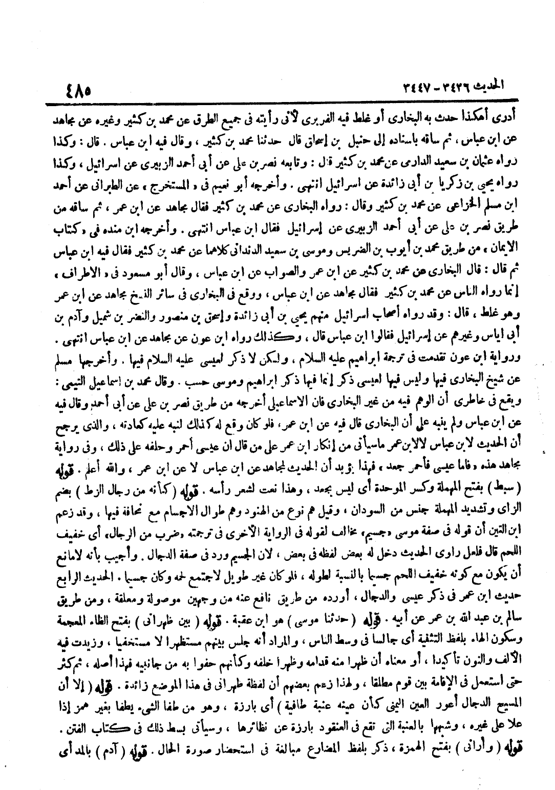أَدْرِي أَهَكَذَا حَدَّثَ بِهِ الْبُخَارِيُّ أَوْ غَلِطَ فِيهِ الْفَرَبْرِيُّ لِأَنِّي رَأَيْتُهُ فِي جَمِيعِ الطُّرُقِ عَنْ مُحَمَّدِ بْنِ كَثِيرٍ وَغَيْرِهِ عَنْ مُجَاهِدٍ عَن بن عَبَّاسٍ ثُمَّ سَاقَهُ بِإِسْنَادِهِ إِلَى حَنْبَلِ بْنِ إِسْحَاقَ قَالَ حَدَّثَنَا مُحَمَّدُ بْنُ كَثِيرٍ وَقَالَ فِيهِ بن عَبَّاسٍ قَالَ وَكَذَا رَوَاهُ عُثْمَانُ بْنُ سَعِيدٍ الدَّارِمِيُّ عَنْ مُحَمَّدِ بْنِ كَثِيرٍ قَالَ وَتَابَعَهُ نصر بن عَليّ عَن أبي أَحْمد الزبيرِي عَنْ إِسْرَائِيلَ وَكَذَا رَوَاهُ يَحْيَى بْنُ زَكَرِيَّا بْنِ أَبِي زَائِدَةَ عَنْ إِسْرَائِيلَ انْتَهَى وَأَخْرَجَهُ أَبُو نُعَيْمٍ فِي الْمُسْتَخْرَجِ عَنِ الطَّبَرَانِيِّ عَنْ أَحْمَدَ بْنِ مُسْلِمٍ الْخُزَاعِيِّ عَنْ مُحَمَّدِ بْنِ كَثِيرٍ وَقَالَ رَوَاهُ الْبُخَارِيُّ عَنْ مُحَمَّدِ بْنِ كثير فَقَالَ مُجَاهِد عَن بن عُمَرَ ثُمَّ سَاقَهُ مِنْ طَرِيقِ نَصْرِ بْنِ عَلِيٍّ عَنْ أَبِي أَحْمَدَ الزُّبَيْرِيِّ عَنْ إِسْرَائِيلَ فَقَالَ بن عَبَّاس انْتهى وَأخرجه بن مَنْدَهْ فِي كِتَابِ الْإِيمَانِ مِنْ طَرِيقِ مُحَمَّدِ بْنِ أَيُّوبَ بْنِ الضُّرَيْسِ وَمُوسَى بْنِ سَعِيدٍ الدَّنْدَانِيِّ كِلَاهُمَا عَنْ مُحَمَّدِ بْنِ كَثِيرٍ فَقَالَ فِيهِ بن عَبَّاسٍ ثُمَّ قَالَ قَالَ الْبُخَارِيُّ عَنْ مُحَمَّدِ بن كثير عَن بن عمر وَالصَّوَاب عَن بن عَبَّاسٍ وَقَالَ أَبُو مَسْعُودٍ فِي الْأَطْرَافِ إِنَّمَا رَوَاهُ النَّاسُ عَنْ مُحَمَّدِ بْنِ كَثِيرٍ فَقَالَ مُجَاهِد عَن بن عَبَّاسٍ وَوَقَعَ فِي الْبُخَارِيِّ فِي سَائِرِ النُّسَخِ مُجَاهِد عَن بن عُمَرَ وَهُوَ غَلَطٌ قَالَ وَقَدْ رَوَاهُ أَصْحَابُ إِسْرَائِيلَ مِنْهُمْ يَحْيَى بْنُ أَبِي زَائِدَةَ وَإِسْحَاقُ بْنُ مَنْصُورٍ وَالنَّضْرُ بْنُ شُمَيْلٍ وَآدَمُ بْنُ أبي إِيَاس وَغَيرهم عَن إِسْرَائِيل فَقَالُوا بن عَبَّاس قَالَ وَكَذَلِكَ رَوَاهُ بن عون عَن مُجَاهِد عَن بن عَبَّاس انْتهى وَرِوَايَة بن عَوْنٍ تَقَدَّمَتْ فِي تَرْجَمَةِ إِبْرَاهِيمَ عَلَيْهِ السَّلَامُ وَلَكِنْ لَا ذِكْرَ لِعِيسَى عَلَيْهِ السَّلَامُ فِيهَا وَأَخْرَجَهَا مُسْلِمٌ عَنْ شَيْخِ الْبُخَارِيِّ فِيهَا وَلَيْسَ فِيهَا لِعِيسَى ذِكْرٌ إِنَّمَا فِيهَا ذِكْرُ إِبْرَاهِيمَ وَمُوسَى حَسْبُ وَقَالَ مُحَمَّدُ بْنُ إِسْمَاعِيلَ التَّيْمِيُّ وَيَقَعُ فِي خَاطِرِي أَنَّ الْوَهْمَ فِيهِ مِنْ غَيْرِ الْبُخَارِيِّ فَإِنَّ الْإِسْمَاعِيلِيَّ أَخْرَجَهُ مِنْ طَرِيقِ نَصْرِ بْنِ عَلِيٍّ عَنْ أَبِي أَحْمَدَ وَقَالَ فِيهِ عَن بن عَبَّاسٍ وَلَمْ يُنَبِّهْ عَلَى أَنَّ الْبُخَارِيَّ قَالَ فِيهِ عَن بن عمر فَلَو كَانَ وَقع لَهُ كَذَلِكَ لَنَبَّهَ عَلَيْهِ كَعَادَتِهِ وَالَّذِي يُرَجِّحُ أَنَّ الْحَدِيثَ لِابْنِ عَبَّاسٍ لَا لِابْنِ عُمَرَ مَا سَيَأْتِي من إِنْكَار بن عُمَرَ عَلَى مَنْ قَالَ إِنَّ عِيسَى أَحْمَرُ وَحَلَّفَهُ عَلَى ذَلِكَ وَفِي رِوَايَةِ مُجَاهِدٍ هَذِهِ فَأَمَّا عِيسَى فَأَحْمَرُ جَعْدٌ فَهَذَا يُؤَيِّدُ أَنَّ الحَدِيث لمجاهد عَن بن عَبَّاس لَا عَن بن عُمَرَ وَاللَّهُ أَعْلَمُ قَوْلُهُ سَبِطٌ بِفَتْحِ الْمُهْمَلَةِ وَكَسْرِ الْمُوَحَّدَةِ أَيْ لَيْسَ بِجَعْدٍ وَهَذَا نَعْتٌ لِشَعْرِ رَأْسِهِ قَوْلُهُ كَأَنَّهُ مِنْ رِجَالِ الزُّطِّ بِضَمِّ الزَّايِ وَتَشْدِيدِ الْمُهْمَلَةِ جِنْسٌ مِنَ السُّودَانِ وَقِيلَ هُمْ نَوْعٌ مِنَ الْهُنُودِ وَهُمْ طِوَالُ الْأَجْسَام مَعَ نحافة فِيهَا وَقد زعم بن التِّينِ أَنَّ قَوْلَهُ فِي صِفَةِ مُوسَى جَسِيمٌ مُخَالِفٌ لِقَوْلِهِ فِي الرِّوَايَةِ الْأُخْرَى فِي تَرْجَمَتِهِ ضَرْبٌ مِنَ الرِّجَالِ أَيْ خَفِيفُ اللَّحْمِ قَالَ فَلَعَلَّ رَاوِيَ الْحَدِيثِ دَخَلَ لَهُ بَعْضُ لَف