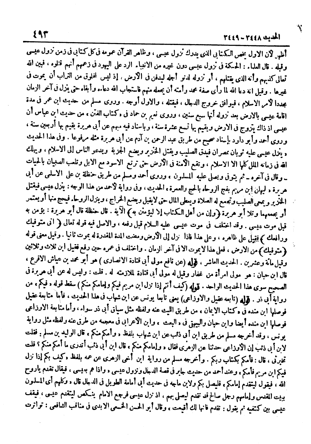 أَظْهَرُ لِأَنَّ الْأَوَّلَ يَخُصُّ الْكِتَابِيَّ الَّذِي يُدْرِكُ نُزُولَ عِيسَى وَظَاهِرُ الْقُرْآنِ عُمُومُهُ فِي كُلِّ كِتَابِيٍّ فِي زَمَنِ نُزُولِ عِيسَى وَقَبْلَهُ قَالَ الْعُلَمَاءُ الْحِكْمَةُ فِي نُزُولِ عِيسَى دُونَ غَيْرِهِ مِنَ الْأَنْبِيَاءِ الرَّدُّ عَلَى الْيَهُودِ فِي زَعْمِهِمْ أَنَّهُمْ قَتَلُوهُ فَبَيَّنَ اللَّهُ تَعَالَى كَذِبَهُمْ وَأَنَّهُ الَّذِي يَقْتُلُهُمْ أَوْ نُزُولُهُ لِدُنُوِّ أَجَلِهِ لِيُدْفَنَ فِي الْأَرْضِ إِذْ لَيْسَ لِمَخْلُوقٍ مِنَ التُّرَابِ أَنْ يَمُوتَ فِي غَيْرِهَا وَقِيلَ إِنَّهُ دَعَا اللَّهَ لَمَّا رَأَى صِفَةَ مُحَمَّدٍ وَأُمَّتِهِ أَنْ يَجْعَلَهُ مِنْهُمْ فَاسْتَجَابَ اللَّهُ دُعَاءَهُ وَأَبْقَاهُ حَتَّى يَنْزِلَ فِي آخِرِ الزَّمَانِ مُجَدِّدًا لِأَمْرِ الْإِسْلَامِ فَيُوَافِقُ خُرُوجَ الدَّجَّالِ فَيَقْتُلُهُ وَالْأَوَّلُ أَوْجَهُ وَرَوَى مُسلم من حَدِيث بن عُمَرَ فِي مُدَّةِ إِقَامَةِ عِيسَى بِالْأَرْضِ بَعْدَ نُزُولِهِ أَنَّهَا سَبْعُ سِنِينَ وَرَوَى نُعَيْمُ بْنُ حَمَّادٍ فِي كِتَابِ الْفِتَنِ مِنْ حَدِيث بن عَبَّاسٍ أَنَّ عِيسَى إِذْ ذَاكَ يَتَزَوَّجُ فِي الْأَرْضِ وَيُقِيمُ بِهَا تِسْعَ عَشْرَةَ سَنَةً وَبِإِسْنَادٍ فِيهِ مُبْهَمٌ عَنْ أَبِي هُرَيْرَةَ يُقِيمُ بِهَا أَرْبَعِينَ سَنَةً وَرَوَى أَحْمَدُ وَأَبُو دَاوُدَ بِإِسْنَادٍ صَحِيحٍ مِنْ طَرِيقِ عَبْدِ الرَّحْمَنِ بْنِ آدَمَ عَنْ أَبِي هُرَيْرَةَ مِثْلَهُ مَرْفُوعًا وَفِي هَذَا الْحَدِيثِ يَنْزِلُ عِيسَى عَلَيْهِ ثَوْبَانِ مُمَصَّرَانِ فَيَدُقُّ الصَّلِيبَ وَيَقْتُلُ الْخِنْزِيرَ وَيَضَعُ الْجِزْيَةَ وَيَدْعُو النَّاسَ إِلَى الْإِسْلَامِ وَيُهْلِكُ اللَّهُ فِي زَمَانِهِ الْمِلَلَ كُلَّهَا إِلَّا الْإِسْلَامَ وَتَقَعُ الْأَمَنَةُ فِي الْأَرْضِ حَتَّى تَرْتَعَ الْأُسُودُ مَعَ الْإِبِلِ وَتَلْعَبُ الصِّبْيَانُ بِالْحَيَّاتِ وَقَالَ فِي آخِرِهِ ثُمَّ يُتَوَفَّى وَيُصَلِّي عَلَيْهِ الْمُسْلِمُونَ وَرَوَى أَحْمَدُ وَمُسْلِمٌ مِنْ طَرِيقِ حَنْظَلَةَ بْنَ عَلِيٍّ الْأَسْلَمِيِّ عَنْ أَبِي هُرَيْرَةَ ليهلن بن مَرْيَمَ بِفَجِّ الرَّوْحَاءِ بِالْحَجِّ وَالْعُمْرَةِ الْحَدِيثَ وَفِي رِوَايَةٍ لِأَحْمَدَ مِنْ هَذَا الْوَجْهِ يَنْزِلُ عِيسَى فَيَقْتُلُ الْخِنْزِيرَ وَيُمْحِي الصَّلِيبَ وَتُجْمَعُ لَهُ الصَّلَاةُ وَيُعْطِي الْمَالَ حَتَّى لَا يُقْبَلَ وَيَضَعُ الْخَرَاجَ وَيَنْزِلُ الرَّوْحَاءَ فَيَحُجُّ مِنْهَا أَوْ يَعْتَمِرُ أَوْ يَجْمَعُهُمَا وَتَلَا أَبُو هُرَيْرَةَ وَإِنْ مِنْ أَهْلِ الْكِتَابِ إِلَّا لَيُؤْمِنَنَّ بِهِ الْآيَةَ قَالَ حَنْظَلَةُ قَالَ أَبُو هُرَيْرَةَ يُؤْمِنُ بِهِ قَبْلَ مَوْتِ عِيسَى وَقَدِ اخْتُلِفَ فِي مَوْتِ عِيسَى عَلَيْهِ السَّلَامُ قَبْلَ رَفْعِهِ وَالْأَصْلُ فِيهِ قَوْله تَعَالَى أَنِّي متوفيك ورافعك فَقِيلَ عَلَى ظَاهِرِهِ وَعَلَى هَذَا فَإِذَا نَزَلَ إِلَى الْأَرْضِ وَمَضَتِ الْمُدَّةُ الْمُقَدَّرَةُ لَهُ يَمُوتُ ثَانِيًا وَقِيلَ مَعْنَى قَوْلِهِ مُتَوَفِّيكَ مِنَ الْأَرْضِ فَعَلَى هَذَا لَا يَمُوتُ إِلَّا فِي آخِرِ الزَّمَانِ وَاخْتُلِفَ فِي عُمُرِهِ حِينَ رُفِعَ فَقِيلَ بن ثَلَاثٍ وَثَلَاثِينَ وَقِيلَ مِائَةٍ وَعِشْرِينَ الْحَدِيثُ الْعَاشِرُ