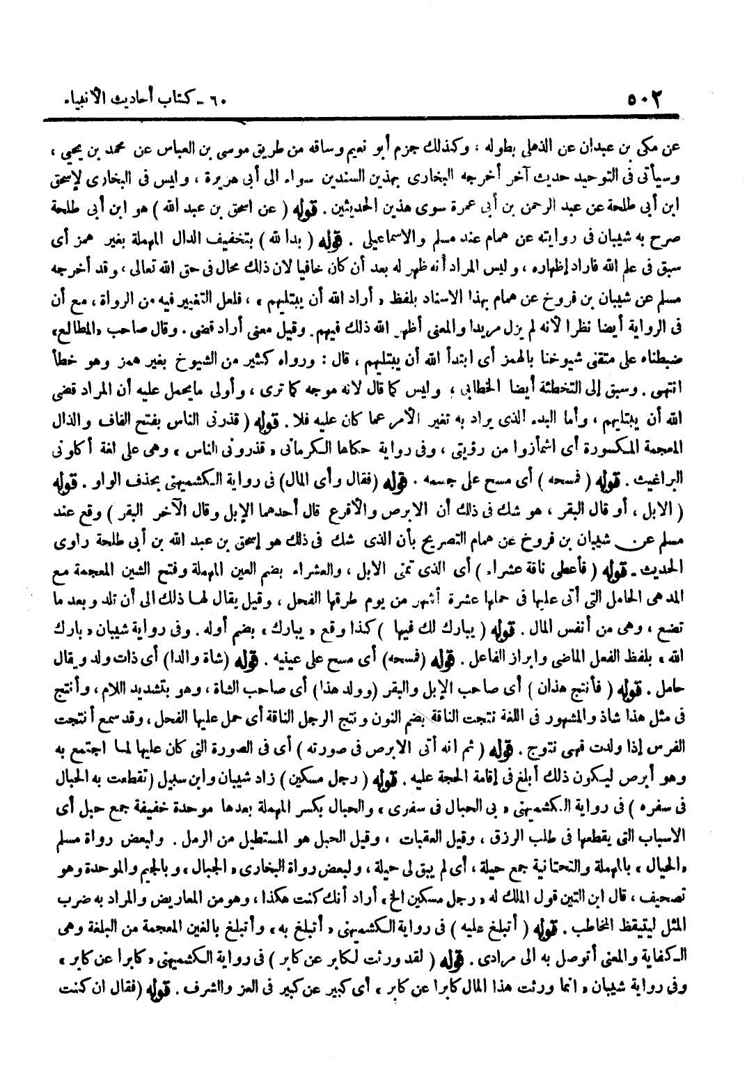 عَنْ مَكِّيِّ بْنِ عَبْدَانَ عَنِ الذُّهْلِيِّ بِطُولِهِ وَكَذَلِكَ جَزَمَ أَبُو نُعَيْمٍ وَسَاقَهُ مِنْ طَرِيقِ مُوسَى بْنِ الْعَبَّاسِ عَنْ مُحَمَّدِ بْنِ يَحْيَى وَسَيَأْتِي فِي التَّوْحِيدِ حَدِيثٌ آخَرُ أَخْرَجَهُ الْبُخَارِيُّ بِهَذَيْنِ السَّنَدَيْنِ سَوَاءٌ إِلَى أَبِي هُرَيْرَةَ وَلَيْسَ فِي الْبُخَارِيِّ لِإِسْحَاقَ بْنِ أَبِي طَلْحَةَ عَنْ عَبْدِ الرَّحْمَنِ بْنِ أَبِي عَمْرَةَ سِوَى هَذَيْنِ الْحَدِيثَيْنِ قَوْلُهُ عَنْ إِسْحَاقَ بْنِ عَبْدِ اللَّهِ هُوَ بن أَبِي طَلْحَةَ صَرَّحَ بِهِ شَيْبَانُ فِي رِوَايَتِهِ عَنْ هَمَّامٍ عِنْدَ مُسْلِمٍ وَالْإِسْمَاعِيلِيِّ قَوْلُهُ بَدَا لِلَّهِ بِتَخْفِيفِ الدَّالِ الْمُهْمَلَةِ بِغَيْرِ هَمْزٍ أَيْ سَبَقَ فِي عِلْمِ اللَّهِ فَأَرَادَ إِظْهَارَهُ وَلَيْسَ الْمُرَادُ أَنَّهُ ظَهَرَ لَهُ بَعْدَ أَنْ كَانَ خَافِيًا لِأَنَّ ذَلِكَ مُحَالٌ فِي حَقِّ اللَّهِ تَعَالَى وَقَدْ أَخْرَجَهُ مُسْلِمٌ عَنْ شَيْبَانَ بْنِ فَرُّوخٍ عَنْ هَمَّامٍ بِهَذَا الْإِسْنَادِ بِلَفْظِ أَرَادَ اللَّهُ أَنْ يَبْتَلِيَهُمْ فَلَعَلَّ التَّغْيِيرَ فِيهِ مِنَ الرُّوَاةِ مَعَ أَنَّ فِي الرِّوَايَةِ أَيْضًا نَظَرًا لِأَنَّهُ لَمْ يَزَلْ مُرِيدًا وَالْمَعْنَى أَظْهَرَ اللَّهُ ذَلِكَ فِيهِمْ وَقِيلَ مَعْنَى أَرَادَ قَضَى وَقَالَ صَاحِبُ الْمَطَالِعِ ضَبَطْنَاهُ عَلَى مُتْقِنِي شُيُوخِنَا بِالْهَمْزِ أَيِ ابْتَدَأَ اللَّهُ أَنْ يَبْتَلِيَهُمْ قَالَ وَرَوَاهُ كَثِيرٌ مِنَ الشُّيُوخِ بِغَيْرِ هَمْزٍ وَهُوَ خَطَأٌ انْتَهَى وَسَبَقَ إِلَى التَّخْطِئَةِ أَيْضًا الْخَطَّابِيُّ وَلَيْسَ كَمَا قَالَ لِأَنَّهُ مُوَجَّهٌ كَمَا تَرَى وَأَوْلَى مَا يُحْمَلُ عَلَيْهِ أَنَّ الْمُرَادَ قَضَى اللَّهُ أَنْ يَبْتَلِيَهُمْ وَأَمَّا الْبَدْءُ الَّذِي يُرَادُ بِهِ تَغَيُّرُ الْأَمْرِ عَمَّا كَانَ عَلَيْهِ فَلَا قَوْلُهُ قَذِرَنِي النَّاسُ بِفَتْحِ الْقَافِ وَالذَّالِ الْمُعْجَمَةِ الْمَكْسُورَةِ أَيِ اشْمَأَزُّوا مِنْ رُؤْيَتِي وَفِي رِوَايَةٍ حَكَاهَا الْكِرْمَانِيُّ قَذِرُونِي النَّاسُ وَهِيَ عَلَى لُغَةِ أَكَلُونِي الْبَرَاغِيثُ قَوْلُهُ فَمَسَحَهُ أَيْ مَسَحَ عَلَى جِسْمِهِ قَوْلُهُ فَقَالَ وَأَيُّ الْمَالِ فِي رِوَايَةِ الْكُشْمِيهَنِيِّ بِحَذْفِ الْوَاوِ قَوْلُهُ الْإِبِلُ أَوْ قَالَ الْبَقَرُ هُوَ شَكٌّ فِي ذَلِكَ أَنَّ الْأَبْرَصَ وَالْأَقْرَعَ قَالَ أَحَدُهُمَا الْإِبِلُ وَقَالَ الْآخَرُ الْبَقَرُ وَقَعَ عِنْدَ مُسْلِمٍ عَنْ شَيْبَانَ بْنِ فَرُّوخَ عَنْ هَمَّامٍ التَّصْرِيحُ بِأَنَّ الَّذِي شَكَّ فِي ذَلِكَ هُوَ إِسْحَاقَ بْنِ عَبْدِ اللَّهِ بْنِ أَبِي طَلْحَةَ رَاوِي الْحَدِيثِ قَوْلُهُ فَأُعْطِيَ نَاقَةً عُشَرَاءَ أَيِ الَّذِي تَمَنَّى الْإِبِلَ وَالْعُشَرَاءُ بِضَمِّ الْعَيْنِ الْمُهْملَة وَفتح الشين الْمُعْجَمَة مَعَ المدهى الْحَامِلُ الَّتِي أَتَى عَلَيْهَا فِي حَمْلِهَا عَشَرَةُ أَشْهُرٍ مِنْ يَوْمِ طَرَقَهَا الْفَحْلُ وَقِيلَ يُقَالُ لَهَا ذَلِك إِلَى أَن تَلد وَبعد مَا تَضَعُ وَهِيَ مِنْ أَنْفَسِ الْمَالِ قَوْلُهُ يُبَارَكُ لَكَ فِيهَا كَذَا وَقَعَ يُبَارَكُ بِضَمِّ أَوَّلِهِ وَفِي رِوَايَةِ شَيْبَانَ بَارَكَ اللَّهُ بِلَفْظِ الْفِعْلِ الْمَاضِي وَإِبْرَازِ الْفَاعِلِ قَوْلُهُ فَمَسَحَهُ أَيْ مَسَحَ عَلَى عَيْنَيْهِ قَوْلُهُ شَاةً وَالِدًا أَيْ ذَاتَ وَلَدٍ وَيُقَالُ حَامِلٌ قَوْلُهُ فَأَنْتَجَ هَذَانِ أَيْ صَاحِبُ الْإِبِلِ وَالْبَقَرِ وَوَلَّدَ هَذَا أَيْ صَاحِبُ الشَّاةِ وَهُوَ بِتَشْدِيدِ اللَّامِ وَأَنْتَجَ فِي مِثْلِ هَذَا شَاذٌّ وَالْمَشْهُورُ فِي اللُّغَةِ نُتِجَتِ النَّاقَةُ بِضَمِّ النُّونِ وَنَتَجَ الرَّجُلُ النَ