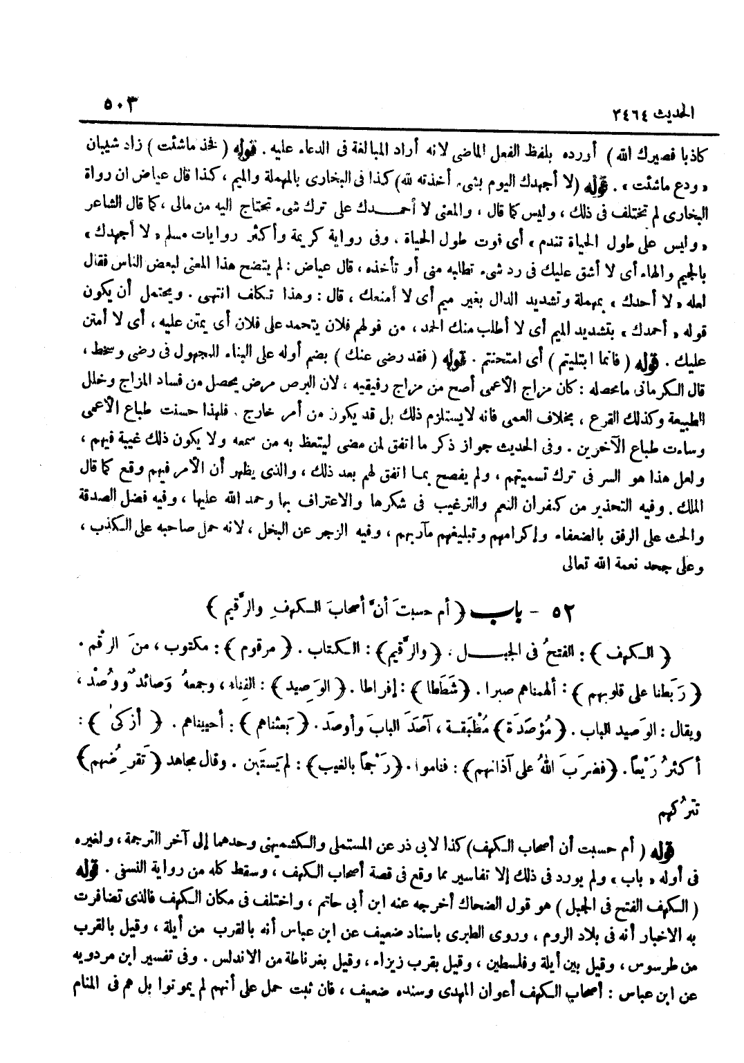 كَذَا لِأَبِي ذَرٍّ عَنِ الْمُسْتَمْلِي وَالْكُشْمِيهَنِيِّ وَحْدَهُمَا إِلَى آخِرِ التَّرْجَمَةِ وَلِغَيْرِهِ فِي أَوَّلِهِ بَابُ وَلَمْ يُورِدْ فِي ذَلِكَ إِلَّا تَفَاسِيرَ مِمَّا وَقَعَ فِي قِصَّةِ أَصْحَابِ الْكَهْفِ وَسَقَطَ كُلُّهُ مِنْ رِوَايَةِ النَّسَفِيِّ قَوْلُهُ الْكَهْفُ الْفَتْحُ فِي الْجَبَلِ هُوَ قَوْلُ الضَّحَّاكِ أَخْرَجَهُ عَنْهُ بن أَبِي حَاتِمٍ وَاخْتُلِفَ فِي مَكَانِ الْكَهْفِ فَالَّذِي تَضَافَرَتْ بِهِ الْأَخْبَارُ أَنَّهُ فِي بِلَادِ الرُّومِ وروى الطَّبَرِيّ بِإِسْنَاد ضَعِيف عَن بن عَبَّاسٍ أَنَّهُ بِالْقُرْبِ مِنْ أَيْلَةَ وَقِيلَ بِالْقُرْبِ مِنْ طَرْسُوسَ وَقِيلَ بَيْنَ أَيْلَةَ وَفِلِسْطِينَ وَقِيلَ بِقُرْبِ زَيْزَاءَ وَقِيلَ بِغِرْنَاطَةَ مِنَ الْأَنْدَلُسِ وَفِي تَفْسِير بن مرْدَوَيْه عَن بن عَبَّاسٍ أَصْحَابُ الْكَهْفِ أَعْوَانُ الْمَهْدِيِّ وَسَنَدُهُ ضَعِيفٌ فَإِنْ ثَبَتَ حُمِلَ عَلَى أَنَّهُمْ لَمْ يَمُوتُوا بَلْ هُمْ فِي الْمَنَامِ