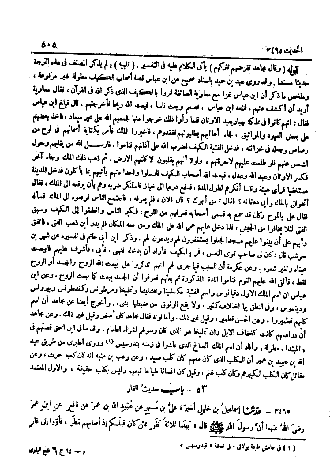 قَوْلُهُ وَقَالَ مُجَاهِدٌ تَقْرِضُهُمْ تَتْرُكُهُمْ يَأْتِي الْكَلَامُ عَلَيْهِ فِي التَّفْسِيرِ تَنْبِيهٌ لَمْ يَذْكُرِ الْمُصَنِّفُ فِي هَذِهِ التَّرْجَمَةِ حَدِيثًا مُسْنَدًا وَقَدْ رَوَى عبد بن حميد بِإِسْنَاد صَحِيح عَن بن عَبَّاسٍ قِصَّةَ أَصْحَابِ الْكَهْفِ مُطَوَّلَةً غَيْرَ مَرْفُوعَةٍ وَمُلَخَّص مَا ذكر أَن بن عَبَّاسٍ غَزَا مَعَ مُعَاوِيَةَ الصَّائِفَةَ فَمَرُّوا بِالْكَهْفِ الَّذِي ذَكَرَ اللَّهُ فِي الْقُرْآنِ فَقَالَ مُعَاوِيَةُ أُرِيد أَن أكشف عَنْهُم فَمَنعه بن عَبَّاسٍ فَصَمَّمَ وَبَعَثَ نَاسًا فَبَعَثَ اللَّهُ رِيحًا فأخرجتهم قَالَ فَبلغ بن عَبَّاسٍ فَقَالَ إِنَّهُمْ كَانُوا فِي مَمْلَكَةِ جَبَّارٍ يَعْبُدُ الْأَوْثَانَ فَلَمَّا رَأَوْا ذَلِكَ خَرَجُوا مِنْهَا فَجَمَعَهُمُ اللَّهُ عَلَى غَيْرِ مِيعَادٍ فَأَخَذَ بَعْضَهُمْ عَلَى بَعْضٍ الْعُهُودَ وَالْمَوَاثِيقَ فَجَاءَ أَهَالِيهِمْ يَطْلُبُونَهُمْ فَفَقَدُوهُمْ فَأَخْبَرُوا الْمَلِكَ فَأَمَرَ بِكِتَابَةِ أَسْمَائِهِمْ فِي لَوْحٍ مِنْ رَصَاصٍ وَجَعَلَهُ فِي خِزَانَتِهِ فَدَخَلَ الْفِتْيَةُ الْكَهْفَ فَضَرَبَ اللَّهُ عَلَى آذَانِهِمْ فَنَامُوا فَأَرْسَلَ اللَّهُ مَنْ يُقَلِّبُهُمْ وَحَوَّلَ الشَّمْسَ عَنْهُمْ فَلَوْ طَلَعَتْ عَلَيْهِمْ لَأَحْرَقَتْهُمْ وَلَوْلَا أَنَّهُمْ يُقَلَّبُونَ لَأَكَلَتْهُمُ الْأَرْضُ ثُمَّ ذَهَبَ ذَلِكَ الْمَلِكُ وَجَاءَ آخَرُ فَكَسَّرَ الْأَوْثَانَ وَعَبَدَ اللَّهَ وَعَدَلَ فَبَعَثَ اللَّهُ أَصْحَابَ الْكَهْفِ فَأَرْسَلُوا وَاحِدًا مِنْهُمْ يَأْتِيهِمْ بِمَا يَأْكُلُونَ فَدَخَلَ الْمَدِينَةَ مُسْتَخْفِيًا فَرَأَى هَيْئَةً وَنَاسًا أَنْكَرَهُمْ لِطُولِ الْمُدَّةِ فَدَفَعَ دِرْهَمًا إِلَى خَبَّازٍ فَاسْتَنْكَرَ ضَرْبَهُ وَهَمَّ بِأَنْ يَرْفَعَهُ إِلَى الْمَلِكِ فَقَالَ أَتُخَوِّفُنِي بِالْمَلِكِ وَأَبِي دِهْقَانُهُ فَقَالَ من أَبوك قَالَ فُلَانٌ فَلَمْ يَعْرِفْهُ فَاجْتَمَعَ النَّاسُ فَرَفَعُوهُ إِلَى الْمَلِكِ فَسَأَلَهُ فَقَالَ عَلَيَّ بِاللَّوْحِ وَكَانَ قَدْ سَمِعَ بِهِ فَسَمَّى أَصْحَابَهُ فَعَرَفَهُمْ مِنَ اللَّوْحِ فَكَبَّرَ النَّاسُ وَانْطَلَقُوا إِلَى الْكَهْفِ وَسَبَقَ الْفَتَى لِئَلَّا يَخَافُوا مِنَ الْجَيْشِ فَلَمَّا دَخَلَ عَلَيْهِمْ عَمَّى اللَّهُ عَلَى الْمَلِكِ وَمَنْ مَعَهُ الْمَكَانَ فَلَمْ يَدْرِ أَيْنَ ذَهَبَ الْفَتَى فَاتَّفَقَ رَأْيُهُمْ عَلَى أَنْ يَبْنُوا عَلَيْهِمْ مَسْجِدًا فَجَعَلُوا يَسْتَغْفِرُونَ لَهُم وَيدعونَ لَهُم وَذكر بن أَبِي حَاتِمٍ فِي تَفْسِيرِهِ عَنْ شَهْرِ بْنِ حَوْشَبٍ قَالَ كَانَ لِي صَاحِبٌ قَوِيُّ النَّفْسِ فَمَرَّ بِالْكَهْفِ فَأَرَادَ أَنْ يَدْخُلَهُ فَنُهِيَ فَأَبَى فَأَشْرَفَ عَلَيْهِمْ فَابْيَضَّتْ عَيْنَاهُ وَتَغَيَّرَ شَعْرُهُ وَعَنْ عِكْرِمَةَ أَنَّ السَّبَبَ فِيمَا جَرَى لَهُمْ أَنَّهُمْ تَذكرُوا هَلْ يَبْعَثُ اللَّهُ الرُّوحَ وَالْجَسَدَ أَوِ الرُّوحَ فَقَطْ فَأَلْقَى اللَّهُ عَلَيْهِمُ النَّوْمَ فَنَامُوا الْمُدَّةَ الْمَذْكُورَةَ ثُمَّ بَعَثَهُمْ فَعَرَفُوا أَنَّ الْجَسَدَ يُبْعَثُ كَمَا تبْعَث الرّوح وَعَن بن عَبَّاسٍ أَنَّ اسْمَ الْمَلِكِ الْأَوَّلِ دِقْيَانُوسَ وَاسْمُ الْفِتْيَةِ مَكْسِلِمْيَنَا وَمَخْشِلِيشَا وَتَمْلِيخَا وَمَرْطُونَسُ وَكَنْشُطُونَسُ وَبِيرُونَسُ وَدِينَمُوسُ وَفِي النُّطْقِ بِهَا اخْتِلَافٌ كَثِيرٌ وَلَا يَقَعُ الْوُثُوقُ مِنْ ضَبْطِهَا بِشَيْءٍ وَأَخْرَجَ أَيْضًا عَنْ مُجَاهِدٍ أَنَّ اسْمَ كَلْبِهِمْ قَطْمِيرُوا وَعَنِ الْحَسَنِ قَطْمِيرُ وَقِيلَ غَيْرُ ذَلِكَ وَأَمَّا لَوْنُهُ فَقَالَ مُجَاهِدٌ كَانَ أَصْفَرَ وَقِيلَ غَيْرُ ذَلِكَ وَعَنْ مُجَاهِدٍ أ