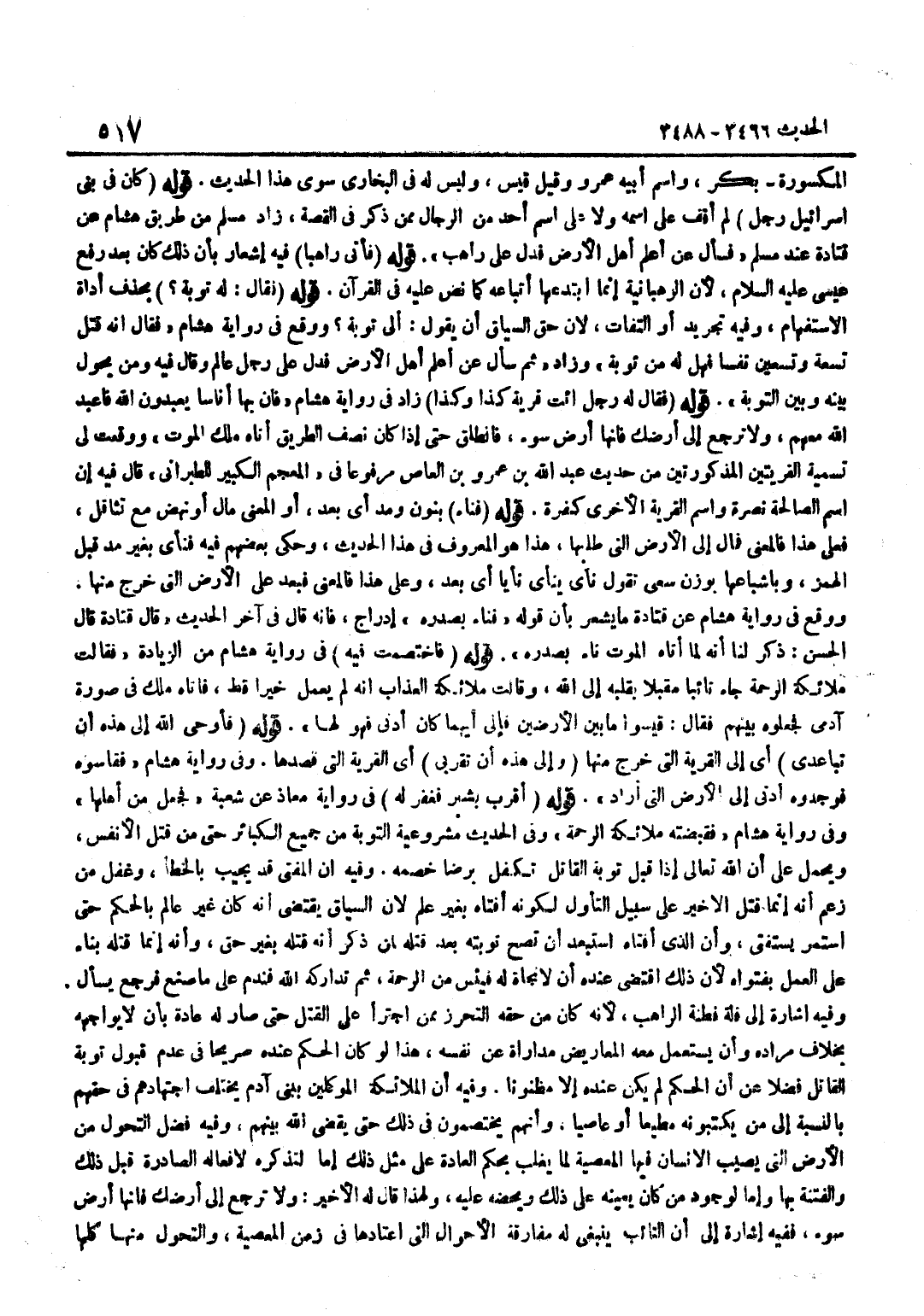 الْمَكْسُورَةِ بَكْرٌ وَاسْمُ أَبِيهِ عَمْرٌو وَقِيلَ قَيْسٌ وَلَيْسَ لَهُ فِي الْبُخَارِيِّ سِوَى هَذَا الْحَدِيثِ قَوْلُهُ كَانَ فِي بَنِي إِسْرَائِيلَ رَجُلٌ لَمْ أَقِفْ عَلَى اسْمِهِ وَلَا عَلَى اسْمِ أَحَدٍ مِنَ الرِّجَالِ مِمَّنْ ذُكِرَ فِي الْقِصَّةِ زَادَ مُسْلِمٌ مِنْ طَرِيقِ هِشَامٍ عَنْ قَتَادَةَ عِنْدَ مُسْلِمٍ فَسَأَلَ عَنْ أَعْلَمِ أَهْلِ الْأَرْضِ فَدُلَّ عَلَى رَاهِبٍ قَوْلُهُ فَأَتَى رَاهِبًا فِيهِ إِشْعَارٌ بِأَنَّ ذَلِكَ كَانَ بَعْدَ رَفْعِ عِيسَى عَلَيْهِ السَّلَامُ لِأَنَّ الرَّهْبَانِيَّةَ إِنَّمَا ابْتَدَعَهَا أَتْبَاعُهُ كَمَا نُصَّ عَلَيْهِ فِي الْقُرْآنِ قَوْلُهُ فَقَالَ لَهُ تَوْبَةٌ بِحَذْفِ أَدَاةِ الِاسْتِفْهَامِ وَفِيهِ تَجْرِيدٌ أَوِ الْتِفَات لِأَن حق السِّيَاق أَن يَقُول أَلِي تَوْبَةٌ وَوَقَعَ فِي رِوَايَةِ هِشَامٍ فَقَالَ إِنَّهُ قَتَلَ تِسْعَةً وَتِسْعِينَ نَفْسًا فَهَلْ لَهُ مِنْ تَوْبَةٍ وَزَادَ ثُمَّ سَأَلَ عَنْ أَعْلَمِ أَهْلِ الْأَرْضِ فَدُلَّ عَلَى رَجُلٍ عَالِمٍ وَقَالَ فِيهِ وَمِنْ يَحُولُ بَيْنَهُ وَبَيْنَ التَّوْبَةِ قَوْلُهُ فَقَالَ لَهُ رَجُلٌ ائْتِ قَرْيَةَ كَذَا وَكَذَا زَادَ فِي رِوَايَةِ هِشَامٍ فَإِنَّ بِهَا أُنَاسًا يَعْبُدُونَ اللَّهَ فَاعْبُدِ اللَّهَ مَعَهُمْ وَلَا تَرْجِعْ إِلَى أَرْضِكَ فَإِنَّهَا أَرْضُ سُوءٍ فَانْطَلَقَ حَتَّى إِذَا كَانَ نِصْفُ الطَّرِيقِ أَتَاهُ مَلَكُ الْمَوْتِ وَوَقَعَتْ لِي تَسْمِيَةُ الْقَرْيَتَيْنِ الْمَذْكُورَتَيْنِ مِنْ حَدِيثِ عَبْدِ اللَّهِ بْنِ عَمْرِو بْنِ الْعَاصِ مَرْفُوعًا فِي الْمُعْجَمِ الْكَبِيرِ لِلطَّبَرَانِيِّ قَالَ فِيهِ إِنَّ اسْمَ الصَّالِحَةِ نَصْرَةُ وَاسْمَ الْقَرْيَةِ الْأُخْرَى كَفْرَةُ قَوْلُهُ فَنَاءَ بِنُونٍ وَمَدٍّ أَيْ بَعُدَ أَوِ الْمَعْنَى مَالَ أَوْ نَهَضَ مَعَ تَثَاقُلٍ فَعَلَى هَذَا فَالْمَعْنَى فَمَالَ إِلَى الْأَرْضِ الَّتِي طَلَبَهَا هَذَا هُوَ الْمَعْرُوفُ فِي هَذَا الْحَدِيثِ وَحَكَى بَعْضُهُمْ فِيهِ فَنَأَى بِغَيْرِ مَدٍّ قَبْلَ الْهَمْزِ وَبِإِشْبَاعِهَا بِوَزْنِ سَعَى تَقُولُ نَأَى يَنْأَى نَأْيًا أَي بَعُدَ وَعَلَى هَذَا فَالْمَعْنَى فَبَعُدَ عَلَى الْأَرْضِ الَّتِي خَرَجَ مِنْهَا وَوَقَعَ فِي رِوَايَةِ هِشَامٍ عَنْ قَتَادَةَ مَا يُشْعِرُ بِأَنَّ قَوْلَهُ فَنَاءَ بِصَدْرِهِ إِدْرَاجٌ فَإِنَّهُ قَالَ فِي آخِرِ الْحَدِيثِ قَالَ قَتَادَةَ قَالَ الْحَسَنُ ذُكِرَ لَنَا أَنَّهُ لما أَتَاهُ الْمَوْت ناء بصدره قَوْله فاختصمت فِيهِ فِي رِوَايَةِ هِشَامٍ مِنَ الزِّيَادَةِ فَقَالَتْ مَلَائِكَةُ الرَّحْمَةِ جَاءَ تَائِبًا مُقْبِلًا بِقَلْبِهِ إِلَى اللَّهِ وَقَالَتْ مَلَائِكَةُ الْعَذَابِ إِنَّهُ لَمْ يَعْمَلْ خَيْرًا قَطُّ فَأَتَاهُ مَلَكٌ فِي صُورَةِ آدَمِيٍّ فَجَعَلُوهُ بَيْنَهُمْ فَقَالَ قِيسُوا مَا بَيْنَ الْأَرْضَيْنِ فَإِلَى أَيِّهِمَا كَانَ أَدْنَى فَهُوَ لَهَا قَوْلُهُ فَأَوْحَى اللَّهُ إِلَى هَذِهِ أَنْ تَبَاعَدِي أَيْ إِلَى الْقَرْيَةِ الَّتِي خَرَجَ مِنْهَا وَإِلَى هَذِهِ أَنْ تَقَرَّبِي أَيِ الْقَرْيَةَ الَّتِي قَصَدَهَا وَفِي رِوَايَةِ هِشَامٍ فَقَاسُوهُ فَوَجَدُوهُ أَدْنَى إِلَى الْأَرْضِ الَّتِي أَرَادَ قَوْلُهُ أَقْرَبَ بِشِبْرٍ فَغُفِرَ لَهُ فِي رِوَايَةِ مُعَاذٍ عَنْ شُعْبَةَ فَجُعِلَ مِنْ أَهْلِهَا وَفِي رِوَايَةِ هِشَامٍ فَقَبَضَتْهُ مَلَائِكَةُ الرَّحْمَةِ وَفِي الْحَدِيثِ مَشْرُوعِيَّةُ التَّوْبَةِ مِنْ جَمِيعِ الْكَبَائِرِ حَتَّى مِنْ قَتْلِ الْأَنْفُسِ وَيُحْمَلُ عَلَى أَنَّ اللَّهَ تَعَالَى إِذَا قَبِلَ تَوِبَةَ الْقَاتِلِ تَكَفَّلَ بِرِضَا خَصْمِهِ وَفِيهِ أَنَّ الْمُفْتِيَ قَدْ يُجِيبُ بِالْخَطَإِ