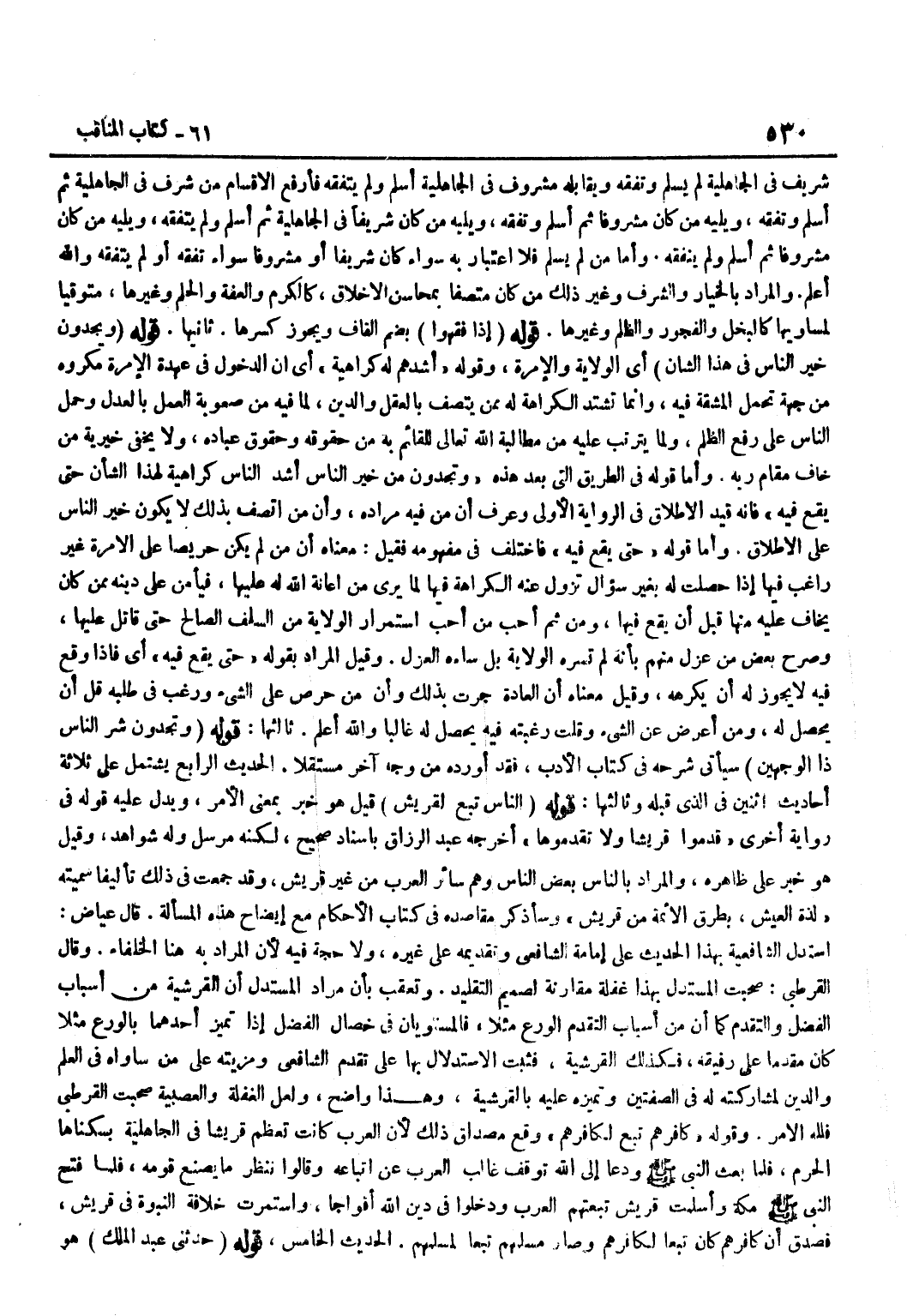 شَرِيفٌ فِي الْجَاهِلِيَّةِ لَمْ يُسْلِمْ وَتَفَقَّهَ وَيُقَابِلُهُ مَشْرُوفٌ فِي الْجَاهِلِيَّةِ أَسْلَمَ وَلَمْ يَتَفَقَّهْ فَأَرْفَعُ الْأَقْسَامِ مَنْ شَرُفَ فِي الْجَاهِلِيَّةِ ثُمَّ أَسْلَمَ وَتَفَقَّهَ وَيَلِيهِ مَنْ كَانَ مَشْرُوفًا ثُمَّ أَسْلَمَ وَتَفَقَّهَ وَيَلِيهِ مَنْ كَانَ شَرِيفًا فِي الْجَاهِلِيَّةِ ثُمَّ أَسْلَمَ وَلَمْ يَتَفَقَّهْ وَيَلِيهِ مَنْ كَانَ مَشْرُوفًا ثُمَّ أَسْلَمَ وَلَمْ يَتَفَقَّهْ وَأَمَّا مَنْ لَمْ يُسْلِمْ فَلَا اعْتِبَارَ بِهِ سَوَاءٌ كَانَ شَرِيفًا أَوْ مَشْرُوفًا سَوَاءٌ تَفَقَّهَ أَوْ لَمْ يَتَفَقَّهْ وَاللَّهُ أَعْلَمُ وَالْمُرَادُ بِالْخِيَارِ وَالشَّرَفِ وَغَيْرِ ذَلِكَ مَنْ كَانَ مُتَّصِفًا بِمَحَاسِنِ الْأَخْلَاقِ كَالْكَرَمِ وَالْعِفَّةِ وَالْحِلْمِ وَغَيْرِهَا مُتَوَقِّيًا لِمَسَاوِيهَا كَالْبُخْلِ وَالْفُجُورِ وَالظُّلْمِ وَغَيْرِهَا قَوْلُهُ إِذَا فَقِهُوا بِضَمِّ الْقَافِ وَيَجُوزُ كَسْرُهَا ثَانِيهَا قَوْلُهُ وَيَجِدُونَ خَيْرَ النَّاسِ فِي هَذَا الشَّأْنِ أَيِ الْوِلَايَةِ وَالْإِمْرَةِ وَقَوْلُهُ أَشَدَّهُمْ لَهُ كَرَاهِيَةً أَيْ أَنَّ الدُّخُولَ فِي عُهْدَةِ الْإِمْرَةِ مَكْرُوهٌ مِنْ جِهَةِ تَحَمُّلِ الْمَشَقَّةِ فِيهِ وَإِنَّمَا تَشْتَدُّ الْكَرَاهَةُ لَهُ مِمَّنْ يَتَّصِفُ بِالْعَقْلِ وَالدِّينِ لِمَا فِيهِ مِنْ صُعُوبَةِ الْعَمَلِ بِالْعَدْلِ وَحَمْلِ النَّاسِ عَلَى رَفْعِ الظُّلْمِ وَلِمَا يَتَرَتَّبُ عَلَيْهِ مِنْ مُطَالَبَةِ اللَّهِ تَعَالَى لِلْقَائِمِ بِهِ مِنْ حُقُوقِهِ وَحُقُوقِ عِبَادِهِ وَلَا يَخْفَى خَيْرِيَّةُ مَنْ خَافَ مَقَامَ رَبِّهِ وَأَمَّا قَوْلُهُ فِي الطَّرِيقِ الَّتِي بَعْدَ هَذِهِ وَتَجِدُونَ مِنْ خَيْرِ النَّاسِ أَشَدَّ النَّاسِ كَرَاهِيَةً لِهَذَا الشَّأْنِ حَتَّى يَقَعَ فِيهِ فَإِنَّهُ قَيَّدَ الْإِطْلَاقَ فِي الرِّوَايَةِ الْأُولَى وَعَرَفَ أَنَّ مَنْ فِيهِ مُرَادُهُ وَأَنَّ مَنِ اتَّصَفَ بِذَلِكَ لَا يَكُونُ خَيْرَ النَّاسِ عَلَى الْإِطْلَاقِ وَأَمَّا قَوْلُهُ حَتَّى يَقَعَ فِيهِ فَاخْتُلِفَ فِي مَفْهُومِهِ فَقِيلَ مَعْنَاهُ أَنَّ مَنْ لَمْ يَكُنْ حَرِيصًا عَلَى الْإِمْرَةِ غَيْرَ رَاغِبٍ فِيهَا إِذَا حَصَلَتْ لَهُ بِغَيْرِ سُؤَالٍ تَزُولُ عَنْهُ الْكَرَاهَةُ فِيهَا لِمَا يُرَى مِنْ إِعَانَةِ اللَّهِ لَهُ عَلَيْهَا فَيَأْمَنُ عَلَى دِينِهِ مِمَّنْ كَانَ يَخَافُ عَلَيْهِ مِنْهَا قَبْلَ أَنْ يَقَعَ فِيهَا وَمِنْ ثَمَّ أَحَبَّ مَنْ أَحَبَّ اسْتِمْرَارَ الْوِلَايَةِ مِنَ السَّلَفِ الصَّالِحِ حَتَّى قَاتَلَ عَلَيْهَا وَصَرَّحَ بَعْضُ مَنْ عُزِلَ مِنْهُمْ بِأَنَّهُ لَمْ تَسُرَّهُ الْوِلَايَةُ بَلْ سَاءَهُ الْعَزْلُ وَقِيلَ الْمُرَادُ بِقَوْلِهِ حَتَّى يَقَعَ فِيهِ أَيْ فَإِذَا وَقَعَ فِيهِ لَا يَجُوزُ لَهُ أَنْ يَكْرَهَهُ وَقِيلَ مَعْنَاهُ أَنَّ الْعَادَةَ جَرَتْ بِذَلِكَ وَأَنَّ مَنْ حَرَصَ عَلَى الشَّيْءِ وَرَغِبَ فِي طَلَبِهِ قَلَّ أَنْ يَحْصُلَ لَهُ وَمَنْ أَعْرَضَ عَنِ الشَّيْءِ وَقَلَّتْ رَغْبَتُهُ فِيهِ يَحْصُلُ لَهُ غَالِبًا وَاللَّهُ أَعْلَمُ ثَالِثُهَا قَوْلُهُ وَتَجِدُونَ شَرَّ النَّاسِ ذَا الْوَجْهَيْنِ سَيَأْتِي شَرْحُهُ فِي كِتَابِ الْأَدَبِ فَقَدْ أَوْرَدَهُ مِنْ وَجْهٍ آخَرَ مُسْتَقِلًّا الْحَدِيثُ الرَّابِعُ يَشْتَمِلُ عَلَى ثَلَاثَةِ أَحَادِيثَ اثْنَيْنِ فِي الَّذِي قَبْلَهُ وَثَالِثُهَا