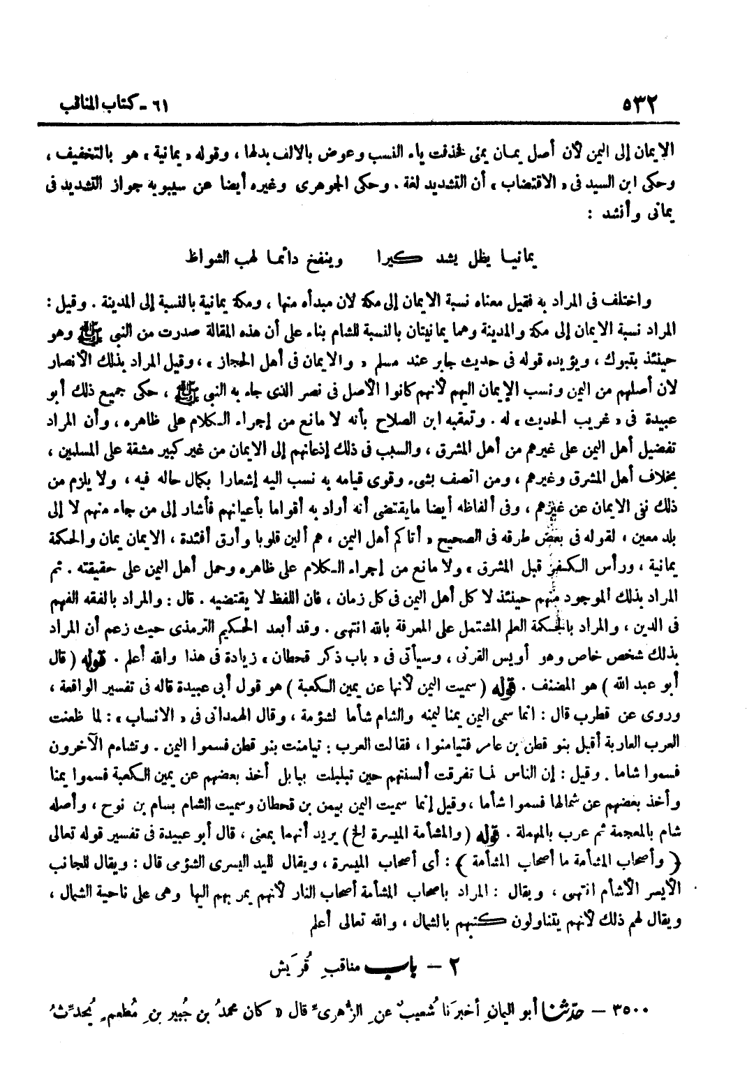 الْإِيمَانِ إِلَى الْيَمَنِ لِأَنَّ أَصْلَ يَمَانٍ يَمَنِيٌّ فَحُذِفَتْ يَاءُ النَّسَبِ وَعُوِّضَ بِالْأَلِفِ بَدَلَهَا وَقَوْلُهُ يَمَانِية هُوَ بِالتَّخْفِيفِ وَحكى بن السَّيِّدِ فِي الِاقْتِضَابِ أَنَّ التَّشْدِيدَ لُغَةٌ وَحَكَى الْجَوْهَرِيُّ وَغَيْرُهُ أَيْضًا عَنْ سِيبَوَيْهِ جَوَازَ التَّشْدِيدِ فِي يَمَانِيٍّ وَأَنْشَدَ يَمَانِيًّا يَظَلُّ يَشُدُّ كِيرًا وَيَنْفُخُ دَائِمًا لَهَبَ الشُّوَاظِ وَاخْتُلِفَ فِي الْمُرَادِ بِهِ فَقِيلَ مَعْنَاهُ نِسْبَةُ الْإِيمَانِ إِلَى مَكَّةَ لِأَنَّ مَبْدَأَهُ مِنْهَا وَمَكَّةُ يَمَانِيَّةٌ بِالنِّسْبَةِ إِلَى الْمَدِينَةِ وَقِيلَ الْمُرَادُ نِسْبَةُ الْإِيمَانِ إِلَى مَكَّةَ وَالْمَدِينَةِ وَهُمَا يَمَانِيَّتَانِ بِالنِّسْبَةِ لِلشَّامِ بِنَاءً عَلَى أَنَّ هَذِهِ الْمَقَالَةَ صَدَرَتْ مِنَ النَّبِيِّ صَلَّى اللَّهُ عَلَيْهِ وَسَلَّمَ وَهُوَ حِينَئِذٍ بِتَبُوكَ وَيُؤَيِّدُهُ قَوْلُهُ فِي حَدِيثِ جَابِرٍ عِنْدَ مُسْلِمٍ وَالْإِيمَانُ فِي أَهْلِ الْحِجَازِ وَقِيلَ الْمُرَادُ بِذَلِكَ الْأَنْصَارُ لِأَنَّ أَصْلَهُمْ مِنَ الْيَمَنِ وَنُسِبَ الْإِيمَانُ إِلَيْهِمْ لِأَنَّهُمْ كَانُوا الْأَصْلَ فِي نَصْرِ الَّذِي جَاءَ بِهِ النَّبِيُّ صَلَّى اللَّهُ عَلَيْهِ وَسَلَّمَ حَكَى جَمِيعَ ذَلِكَ أَبُو عُبَيْدَةَ فِي غَرِيبِ الْحَدِيثِ لَهُ وَتعقبه بن الصَّلَاحِ بِأَنَّهُ لَا مَانِعَ مِنْ إِجْرَاءِ الْكَلَامِ عَلَى ظَاهِرِهِ وَأَنَّ الْمُرَادَ تَفْضِيلُ أَهْلِ الْيَمَنِ عَلَى غَيْرِهِمْ مِنْ أَهْلِ الْمَشْرِقِ وَالسَّبَبُ فِي ذَلِكَ إِذْعَانُهُمْ إِلَى الْإِيمَانِ مِنْ غَيْرِ كَبِيرِ مَشَقَّةٍ عَلَى الْمُسْلِمِينَ بِخِلَافِ أَهْلِ الْمَشْرِقِ وَغَيْرِهِمْ وَمَنِ اتَّصَفَ بِشَيْءٍ وَقَوِيَ قِيَامُهُ بِهِ نُسِبَ إِلَيْهِ إِشْعَارًا بِكَمَالِ حَالِهِ فِيهِ وَلَا يَلْزَمُ مِنْ ذَلِكَ نَفْيُ الْإِيمَانِ عَنْ غَيْرِهِمْ وَفِي أَلْفَاظِهِ أَيْضًا مَا يَقْتَضِي أَنَّهُ أَرَادَ بِهِ أَقْوَامًا بِأَعْيَانِهِمْ فَأَشَارَ إِلَى مَنْ جَاءَ مِنْهُمْ لَا إِلَى بَلَدٍ مُعَيَّنٍ لِقَوْلِهِ فِي بَعْضِ طُرُقِهِ فِي الصَّحِيحِ أَتَاكُمْ أَهْلُ الْيَمَنِ هُمْ أَلْيَنُ قُلُوبًا وَأَرَقُّ أَفْئِدَةً الْإِيمَانُ يَمَانٍ وَالْحِكْمَةُ يَمَانِيَةٌ وَرَأْسُ الْكُفْرِ قِبَلَ الْمَشْرِقِ وَلَا مَانِعَ مِنْ إِجْرَاءِ الْكَلَامِ عَلَى ظَاهِرِهِ وَحَمْلِ أَهْلِ الْيَمَنِ عَلَى حَقِيقَتِهِ ثُمَّ الْمُرَادُ بِذَلِكَ الْمَوْجُودُ مِنْهُمْ حِينَئِذٍ لَا كُلُّ أَهْلِ الْيَمَنِ فِي كُلِّ زَمَانٍ فَإِنَّ اللَّفْظَ لَا يَقْتَضِيهِ قَالَ وَالْمُرَادُ بِالْفِقْهِ الْفَهْمُ فِي الدِّينِ وَالْمُرَادُ بِالْحِكْمَةِ الْعِلْمُ الْمُشْتَمِلُ عَلَى الْمَعْرِفَةِ بِاللَّهِ انْتَهَى وَقَدْ أَبْعَدَ الْحَكِيمُ التِّرْمِذِيُّ حَيْثُ زَعَمَ أَنَّ الْمُرَادَ بِذَلِكَ شَخْصٌ خَاصٌّ وَهُوَ أُوَيْسٌ الْقَرَنِيُّ وَسَيَأْتِي فِي بَابِ ذِكْرِ قَحْطَانَ زِيَادَةٌ فِي هَذَا وَاللَّهُ أَعْلَمُ قَوْلُهُ قَالَ أَبُو عَبْدِ اللَّهِ هُوَ الْمُصَنِّفُ قَوْلُهُ سُمِّيَتْ الْيَمَنُ لِأَنَّهَا عَنْ يَمِينِ الْكَعْبَةِ هُوَ قَوْلُ أَبِي عُبَيْدَةَ قَالَهُ فِي تَفْسِيرِ الْوَاقِعَةِ وَرَوَى عَنْ قُطْرُبٍ قَالَ إِنَّمَا سُمِّيَ الْيَمَنُ يَمَنًا لِيُمْنِهِ وَالشَّامُ شَأَمًا لِشُؤْمِهِ وَقَالَ الْهَمْدَانِيُّ فِي الْأَنْسَابِ لَمَّا ظَعَنَتِ الْعَرَبُ الْعَارِبَةُ أَقْبَلَ بَنُو قَطَنِ بْنِ عَامِرٍ فَتَيَامَنُوا فَقَالَتِ الْعَرَبُ تَيَامَنَتْ بَنُو قَطَنٍ فَسُمُّوا الْيَمَنَ وَتَشَاءَمَ الْآخَرُونَ فَسُمُّوا شَامًا وَقِيلَ إِنَّ النَّاسَ لَمَّا تَفَرَّقَتْ أَلْسِنَت