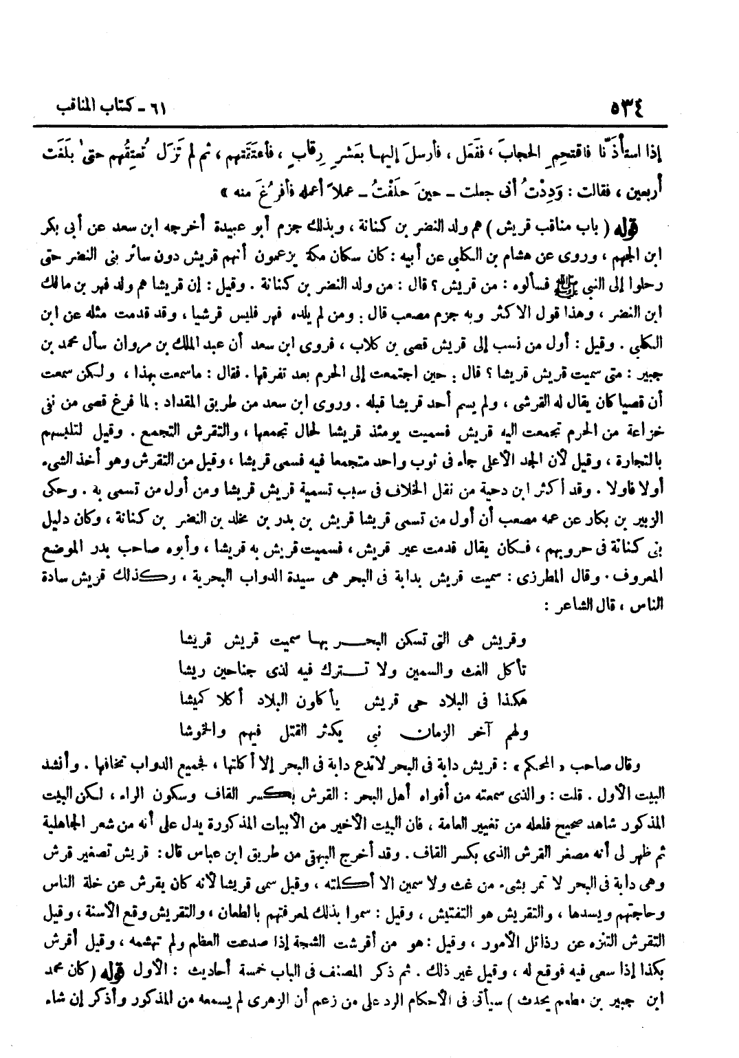 هُمْ وَلَدُ النَّضْرِ بْنِ كِنَانَةَ وَبِذَلِكَ جَزَمَ أَبُو عُبَيْدَةَ أَخْرَجَهُ بن سَعْدٍ عَنْ أَبِي بَكْرِ بْنِ الْجَهْمِ وَرَوَى عَنْ هِشَامِ بْنِ الْكَلْبِيِّ عَنْ أَبِيهِ كَانَ سُكَّانُ مَكَّةَ يَزْعُمُونَ أَنَّهُمْ قُرَيْشٌ دُونَ سَائِرِ بَنِي النَّضْرِ حَتَّى رَحَلُوا إِلَى النَّبِيِّ صَلَّى اللَّهُ عَلَيْهِ وَسَلَّمَ فَسَأَلُوهُ مَنْ قُرَيْشٌ قَالَ مِنْ وَلَدِ النَّضْرِ بْنِ كِنَانَةَ وَقِيلَ إِنَّ قُريْشًا هم وَلَدُ فِهْرِ بْنِ مَالِكِ بْنِ النَّضْرِ وَهَذَا قَوْلُ الْأَكْثَرِ وَبِهِ جَزَمَ مُصْعَبٌ قَالَ وَمَنْ لَمْ يَلِدْهُ فِهْرٌ فَلَيْسَ قُرَشِيًّا وَقَدْ قَدَّمْتُ مثله عَن بن الْكَلْبِيِّ وَقِيلَ أَوَّلُ مَنْ نُسِبَ إِلَى قُرَيْشٍ قصي بن كلاب فروى بن سَعْدٍ أَنَّ عَبْدَ الْمَلِكِ بْنَ مَرْوَانَ سَأَلَ مُحَمَّدَ بْنَ جُبَيْرٍ مَتَى سُمِّيَتْ قُرَيْشٌ قُرَيْشًا قَالَ حِينَ اجْتَمَعَتْ إِلَى الْحَرَمِ بَعْدَ تَفَرُّقِهَا فَقَالَ مَا سَمِعْتُ بِهَذَا وَلَكِنْ سَمِعْتُ أَنَّ قُصَيًّا كَانَ يُقَالُ لَهُ الْقُرَشِيُّ وَلَمْ يُسَمَّ أحد قُريْشًا قبله وروى بن سَعْدٍ مِنْ طَرِيقِ الْمِقْدَادِ لَمَّا فَرَغَ قُصَيٌّ مِنْ نَفْيِ خُزَاعَةَ مِنَ الْحَرَمِ تَجَمَّعَتْ إِلَيْهِ قُرَيْشٌ فَسُمِّيَتْ يَوْمَئِذٍ قُرَيْشًا لِحَالِ تَجَمُّعِهَا وَالتَّقَرُّشُ التَّجَمُّعُ وَقِيلَ لِتَلَبُّسِهِمْ بِالتِّجَارَةِ وَقِيلَ لِأَنَّ الْجَدَّ الْأَعْلَى جَاءَ فِي ثَوْبٍ وَاحِدٍ مُتَجَمِّعًا فِيهِ فَسُمِّيَ قُرَيْشًا وَقِيلَ مِنَ التَّقَرُّشِ وَهُوَ أَخْذُ الشَّيْء أَولا فأولا وَقد أَكثر بن دِحْيَةَ مِنْ نَقْلِ الْخِلَافِ فِي سَبَبِ تَسْمِيَةِ قُرَيْشٍ قُرَيْشًا وَمِنْ أَوَّلِ مَنْ تَسَمَّى بِهِ وَحَكَى الزُّبَيْرُ بْنُ بَكَّارٍ عَنْ عَمِّهِ مُصْعَبٍ أَنَّ أَوَّلَ مَنْ تَسَمَّى قُرَيْشًا قُرَيْشُ بْنُ بَدْرِ بْنِ مَخْلَدِ بْنِ النَّضْرِ بْنِ كِنَانَةَ وَكَانَ دَلِيلَ بَنِي كِنَانَةَ فِي حُرُوبِهِمْ فَكَانَ يُقَالُ قَدِمَتْ عِيرُ قُرَيْشٍ فَسُمِّيَتْ قُرَيْشٌ بِهِ قُرَيْشًا وَأَبُوهُ صَاحِبُ بَدْرٍ الْمَوْضِعِ الْمَعْرُوفِ وَقَالَ الْمُطَرِّزِيُّ سُمِّيَتْ قُرَيْشٌ بِدَابَّةٍ فِي الْبَحْرِ هِيَ سَيِّدَةُ الدَّوَابِّ الْبَحْرِيَّةِ وَكَذَلِكَ قُرَيْشٌ سَادَةُ النَّاسِ قَالَ الشَّاعِر وقريش هِيَ الَّتِي تسكن الْبَحْر بِهَا سُمِّيَتْ قُرَيْشٌ قُرَيْشَا تَأْكُلُ الْغَثَّ وَالسَّمِينَ وَلَا تتْرك فِيهِ لِذِي جَنَاحَيْنِ رِيشَا هَكَذَا فِي الْبِلَادِ حَيُّ قُرَيْشٍ يَأْكُلُونَ الْبِلَادَ أَكْلًا كَمِيشَا وَلَهُمْ آخِرُ الزَّمَانِ نَبِيٌّ يُكْثِرُ الْقَتْلَ فِيهِمْ وَالْخُمُوشَا وَقَالَ صَاحِبُ الْمُحْكَمِ قُرَيْشٌ دَابَّةٌ فِي الْبَحْرِ لَا تَدَعُ دَابَّةً فِي الْبَحْرِ إِلَّا أَكَلَتْهَا فَجَمِيعُ الدَّوَابِّ تَخَافُهَا وَأَنْشَدَ الْبَيْتَ الْأَوَّلَ قُلْتُ وَالَّذِي سَمِعْتُهُ مِنْ أَفْوَاهِ أَهْلِ الْبَحْرِ الْقِرْشُ بِكَسْرِ الْقَافِ وَسُكُونِ الرَّاءِ لَكِنَّ الْبَيْتَ الْمَذْكُورَ شَاهِدٌ صَحِيحٌ فَلَعَلَّهُ مِنْ تَغْيِيرِ الْعَامَّةِ فَإِنَّ الْبَيْتَ الْأَخِيرَ مِنَ الْأَبْيَاتِ الْمَذْكُورَةِ يَدُلُّ عَلَى أَنَّهُ مِنْ شِعْرِ الْجَاهِلِيَّةِ ثُمَّ ظَهَرَ لِي أَنَّهُ مُصَغَّرُ الْقِرْشِ الَّذِي بِكَسْرِ الْقَافِ وَقَدْ أخرج الْبَيْهَقِيّ من طَرِيق بن عَبَّاسٍ قَالَ قُرَيْشٌ تَصْغِيرُ قِرْشٍ وَهِيَ دَابَّةٌ فِي الْبَحْرِ لَا تَمُرُّ بِشَيْءٍ مِنْ غَثٍّ وَلَا سَمِينٍ إِلَّا أَكَلَتْهُ وَقِيلَ سُمِّيَ قُرَيْشًا لِأَنَّهُ كَانَ يَقْرِشُ عَنْ خَلَّةِ النَّاسِ وَحَاجَتِهِمْ وَيَسُدُّهَا وَالتَّقْرِيشُ هُوَ التَّفْتِيشُ وَقِيلَ سُمُّوا بِذَلِكَ لِمَعْرِفَت